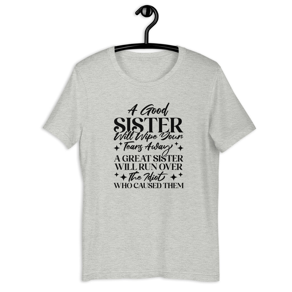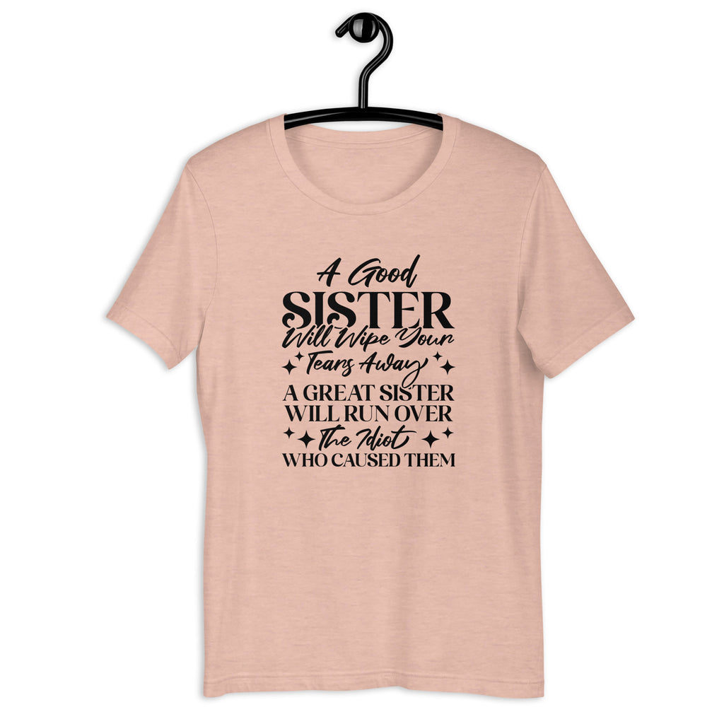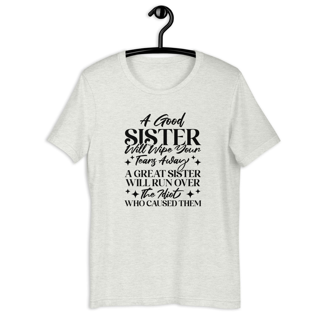 Sisters don’t just have your back—they’ve got your alibi too. This “A Good Sister Will Wipe Your Tears Away, A Great Sister Will Run Over the Idiot Who Caused Them” t-shirt is the perfect mix of sweet and savage.