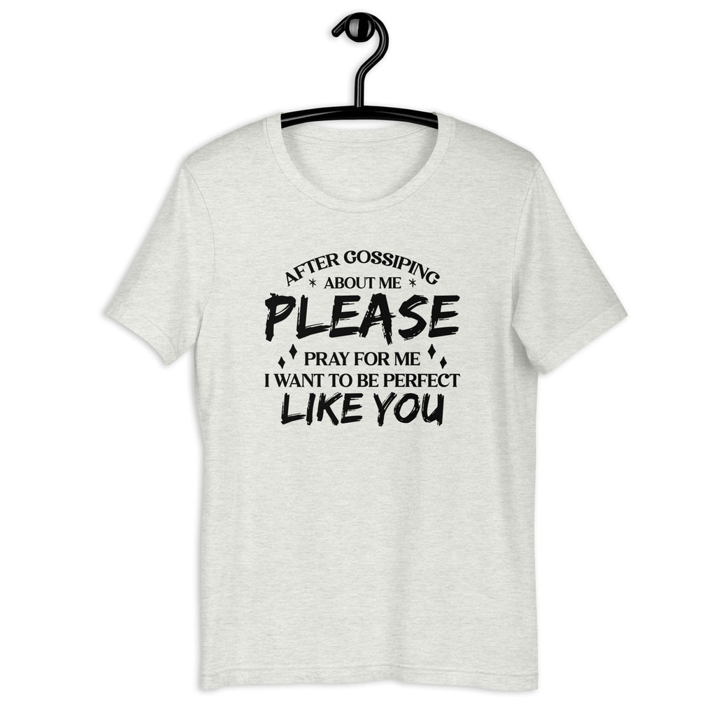 A little sarcasm goes a long way. The “After Gossiping About Me Please Pray For Me I Want To Be Perfect Like You” t-shirt is the perfect mix of humor, honesty, and playful shade.