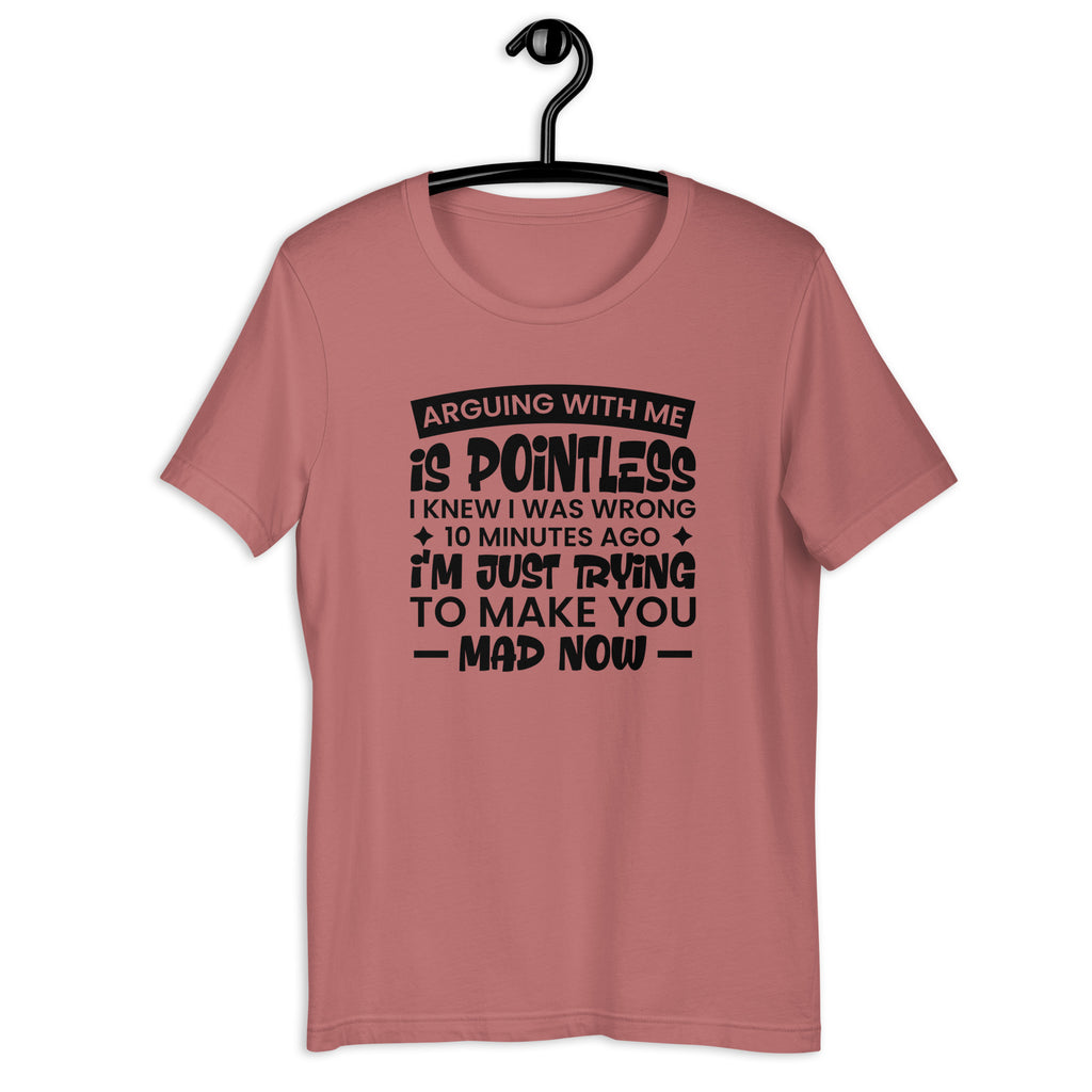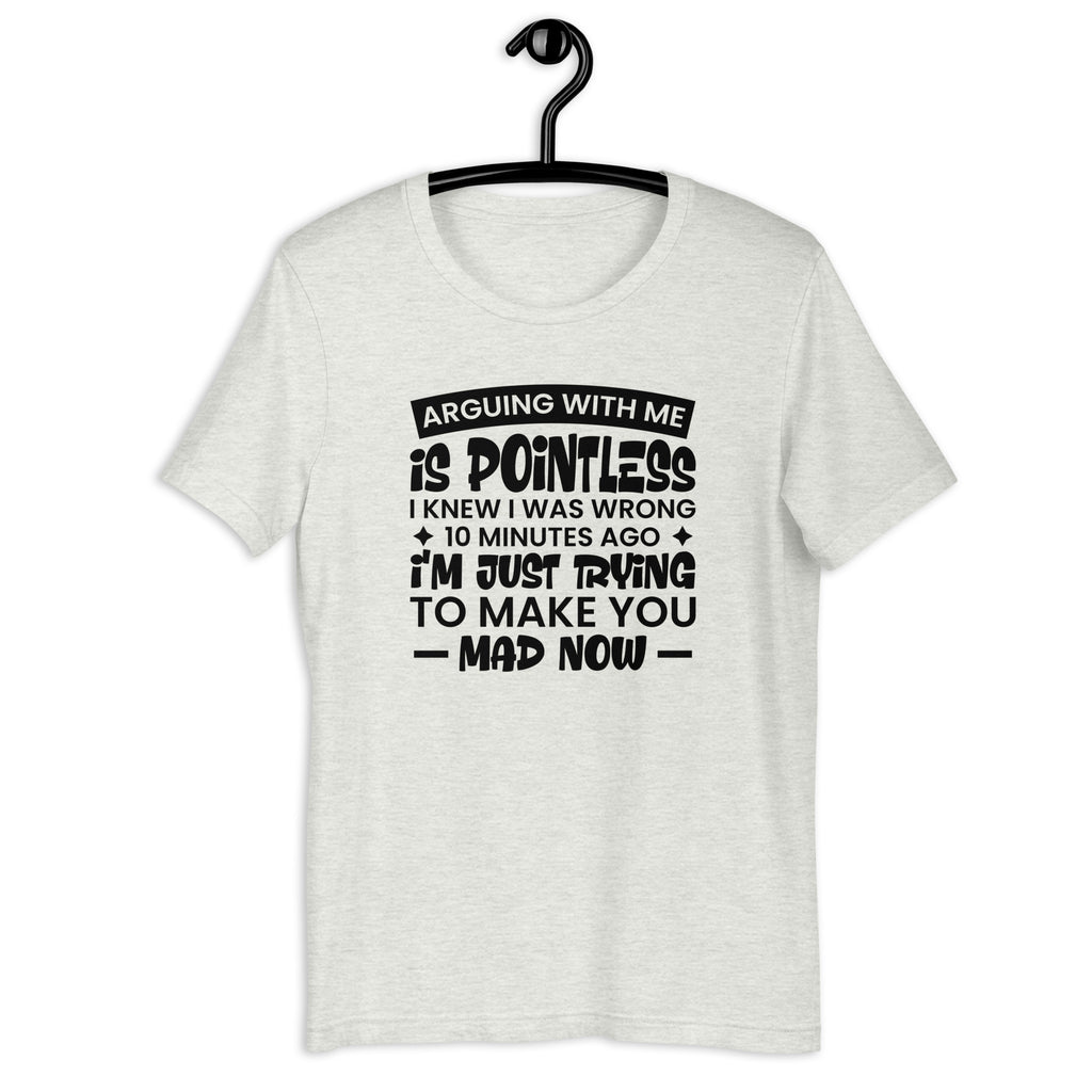 Own your chaos. The “Arguing With Me Is Pointless — I Knew I Was Wrong 10 Minutes Ago, I’m Just Trying to Make You Mad Now” t-shirt is for the master of petty debates and professional button-pushers. Equal parts sarcastic and hilarious, this tee turns stubbornness into a fashion statement.