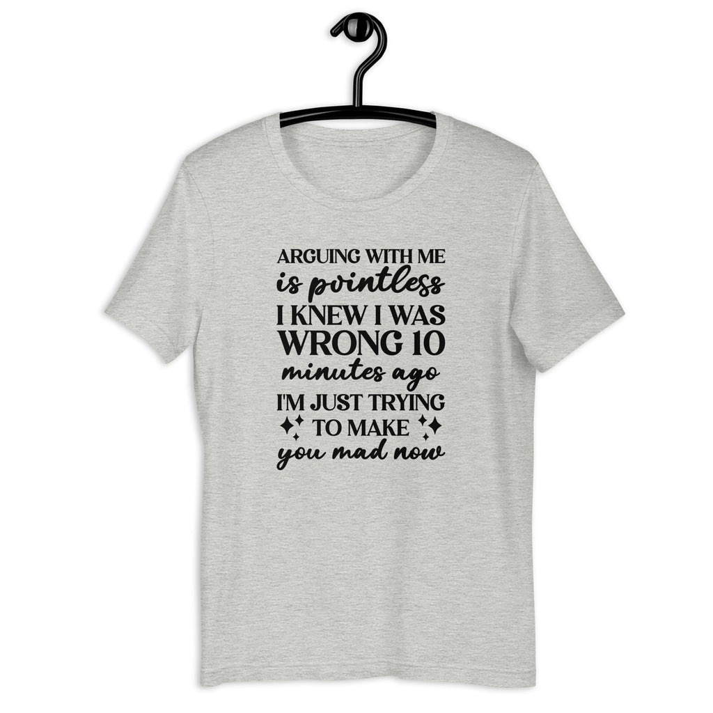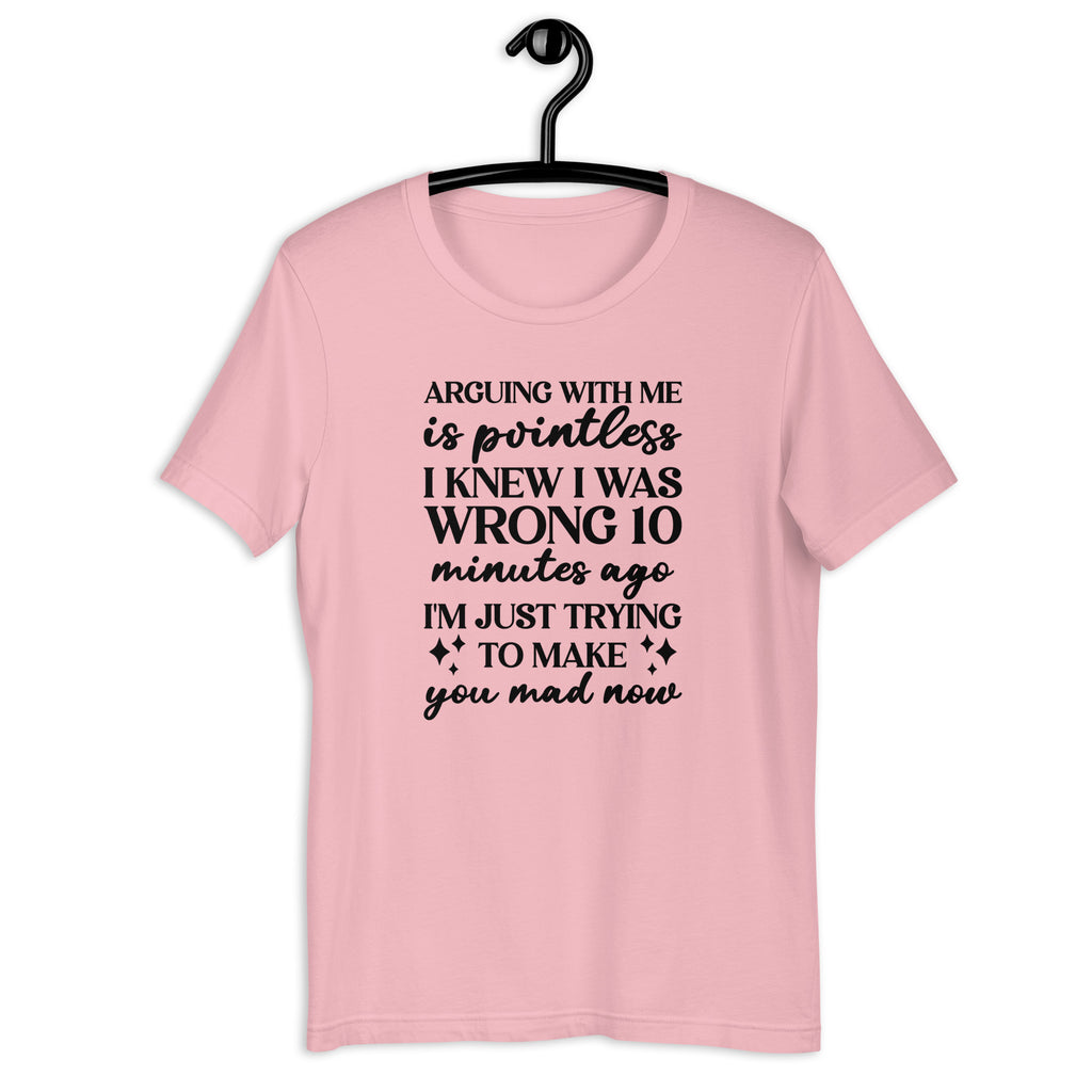 Bring the sass with this “Arguing With Me Is Pointless, I Knew I Was Wrong 10 Minutes Ago, I’m Just Trying to Make You Mad Now” t-shirt. Funny, bold, and a little mischievous, this tee is perfect for anyone who loves stirring the pot and owning their humor.