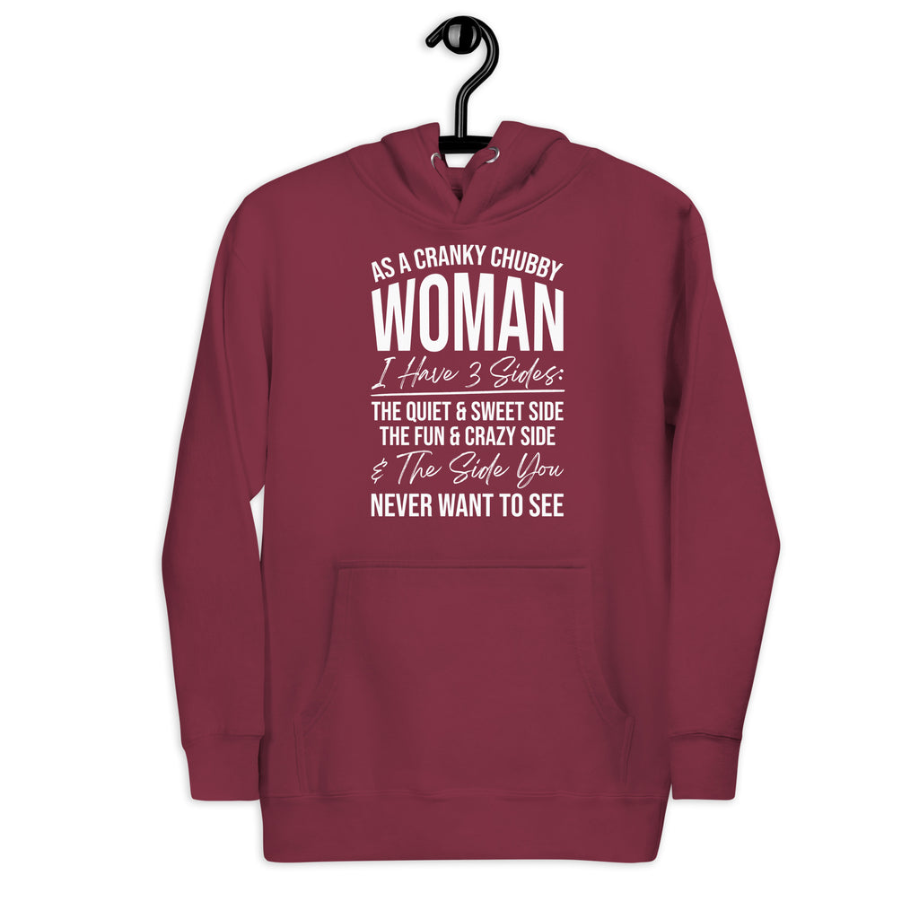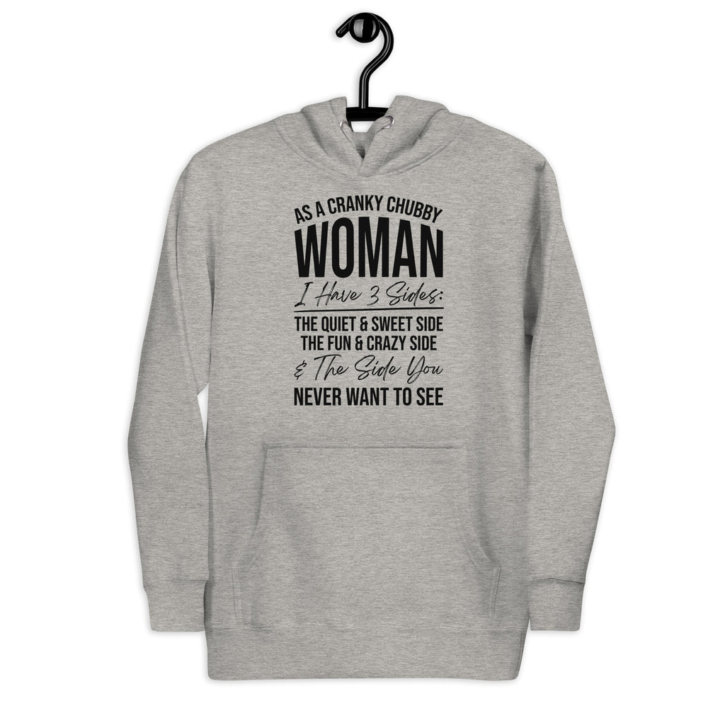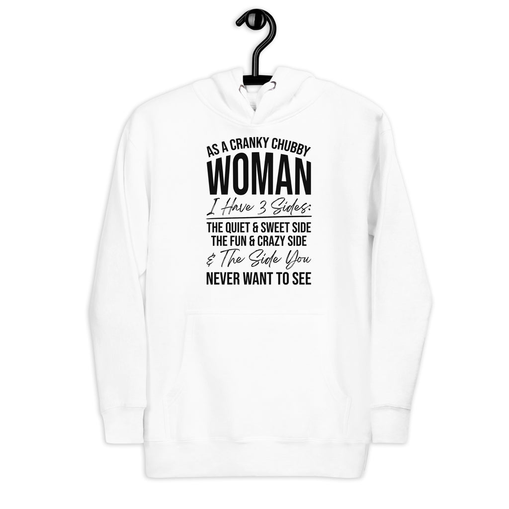 Stay cozy while showing off your personality with the “As a Cranky Chubby Woman I Have 3 Sides: The Quiet and Sweet Side, The Fun and Crazy Side, and The Side You Never Want to See” hoodie — a hilarious and unapologetic piece for women who embrace every side of themselves. With its witty and confident design, this hoodie is guaranteed to turn heads and spark laughs wherever you go.