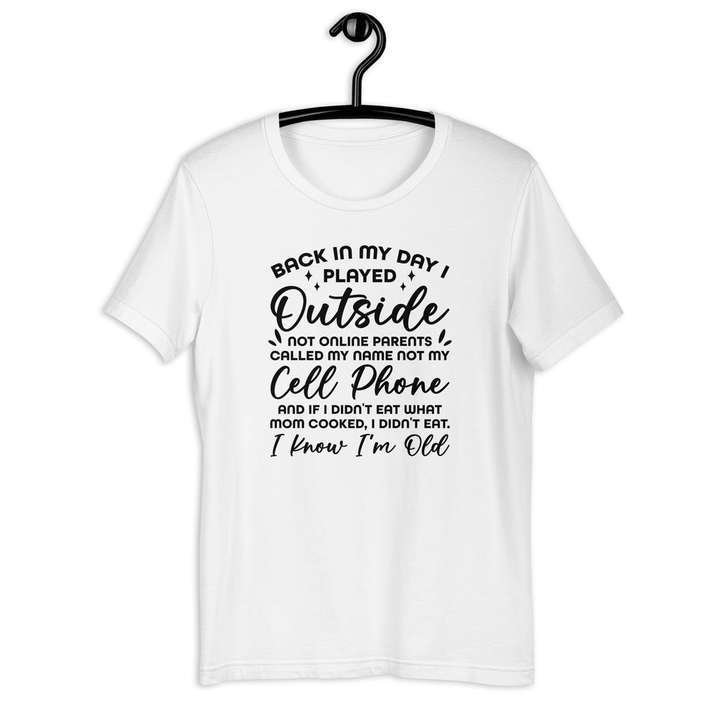 Remember when childhood meant scraped knees instead of screen time? This nostalgic tee brings back the days when fun happened outside, dinner wasn’t optional, and parents didn’t need to text you to come home. Featuring the funny, relatable quote: “Back in my day I played outside, not online. Parents called my name, not my cell phone, and if I didn’t eat what Mom cooked, I didn’t eat. I know I’m old.”