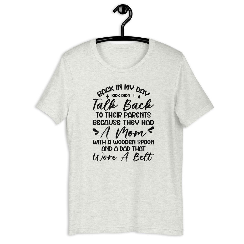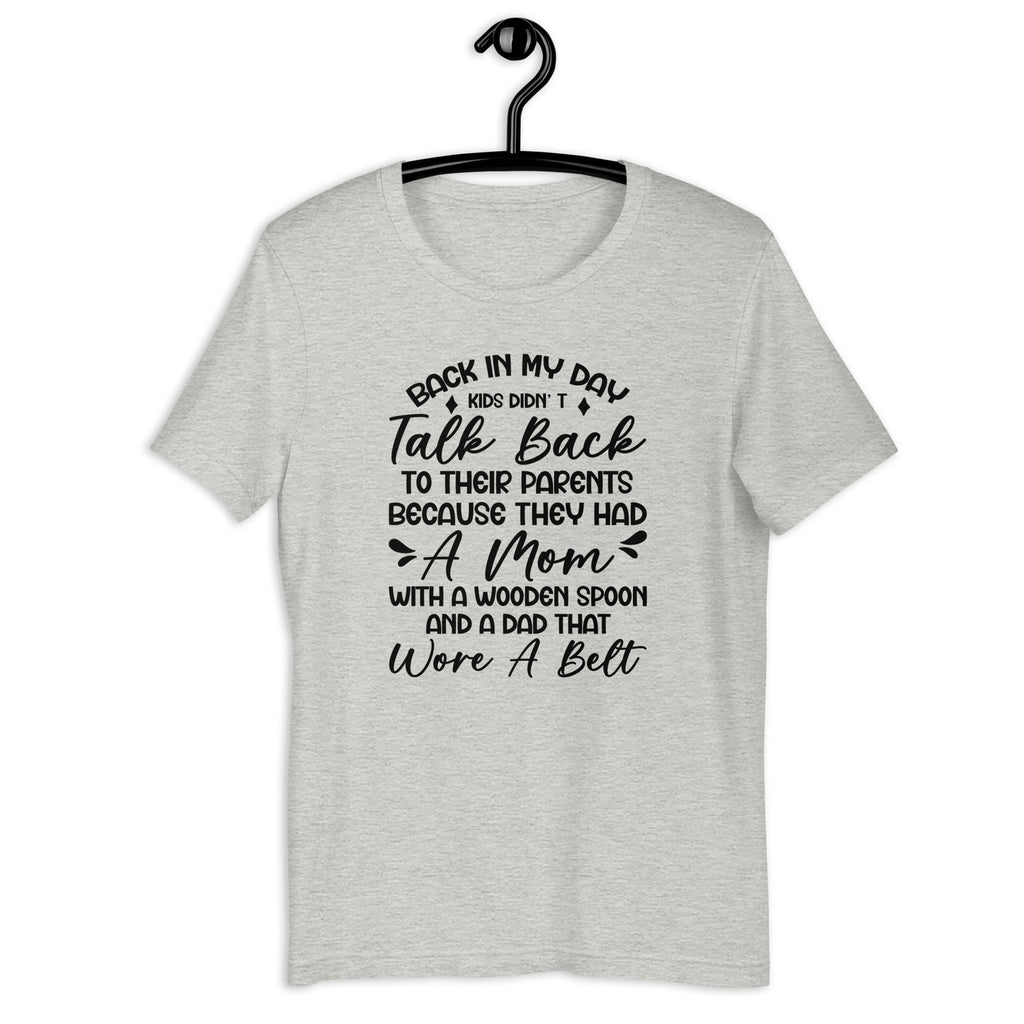 Parenting back then came with tough love—and tougher tools. The “Back In My Day Kids Don’t Talk Back To Their Parents Because They Had A Mom With A Wooden Spoon And A Dad That Wore A Belt” t-shirt is a hilarious nod to old-school discipline and family life.
