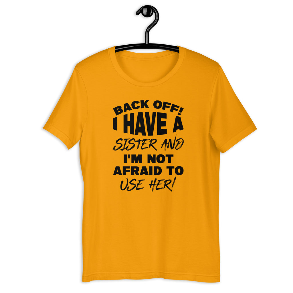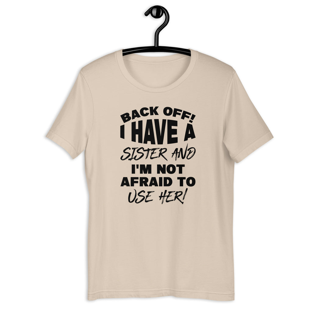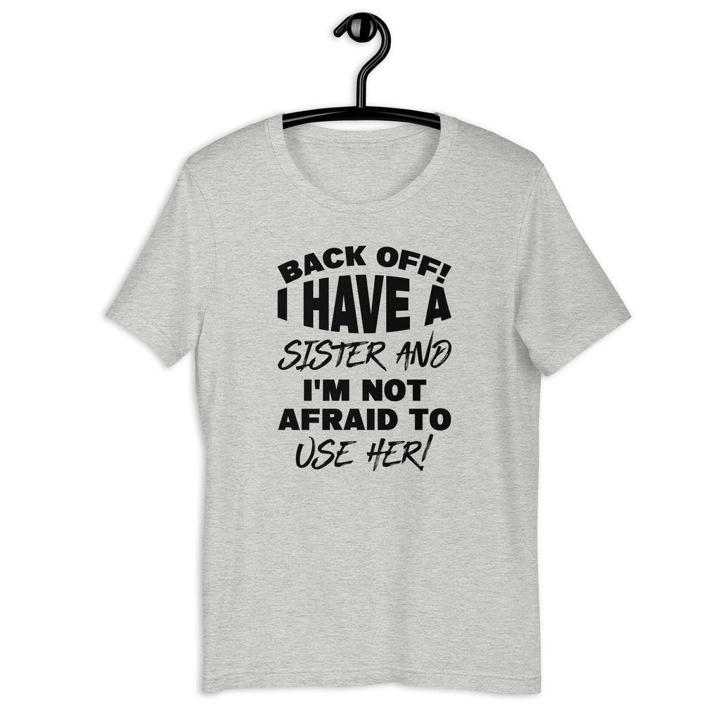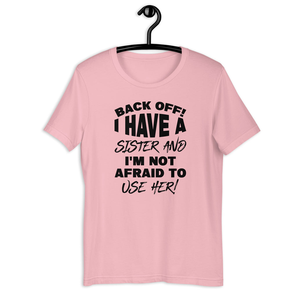 Show your sibling pride (and a little bit of threat) with the “Back Off — I Have a Sister and I’m Not Afraid to Use Her” t-shirt. Perfect for anyone who knows their sister always has their back, this tee combines humor and family loyalty with a playful twist.