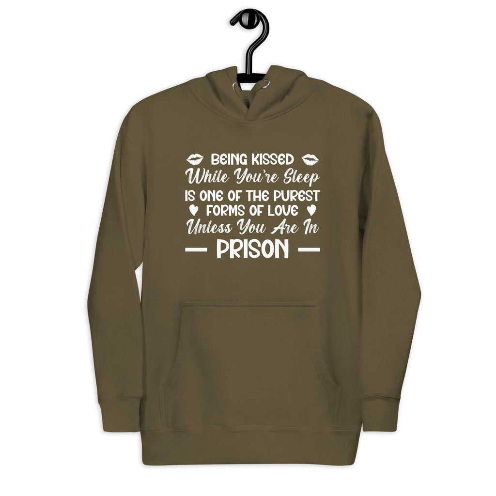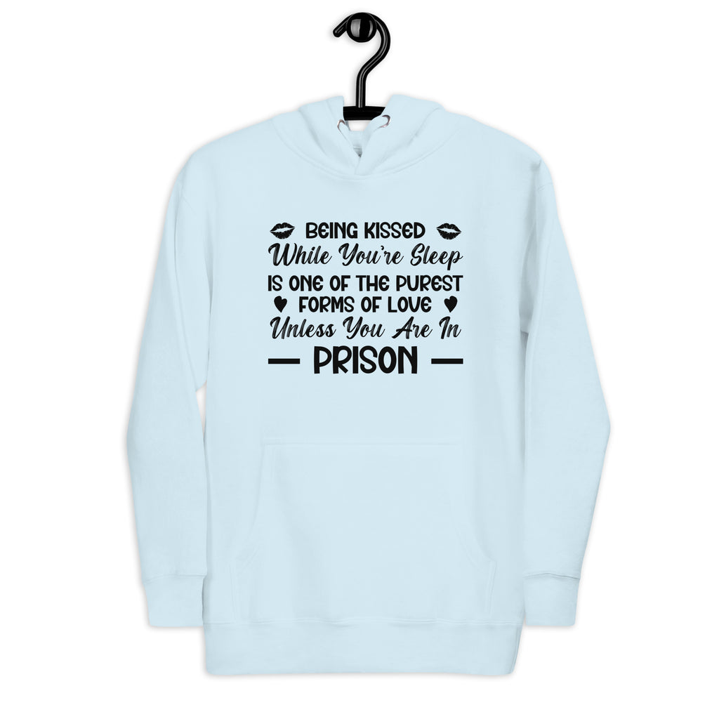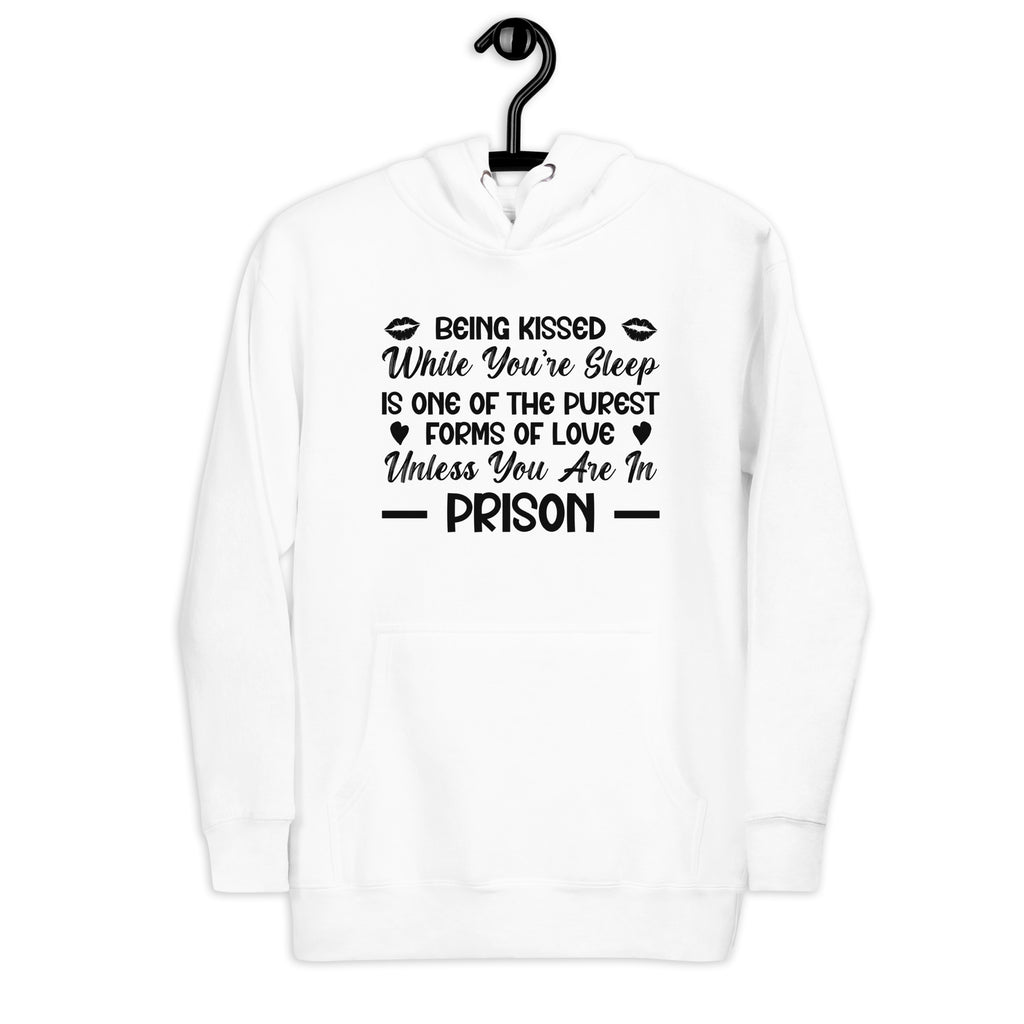 Keep your humor dark and your style cozy with this “Being Kissed While You’re Asleep Is One of the Purest Forms of Love — Unless You’re in Prison” hoodie. Perfect for those who appreciate a clever twist on sweet sentiments, this hoodie blends warmth, wit, and just the right amount of mischief.