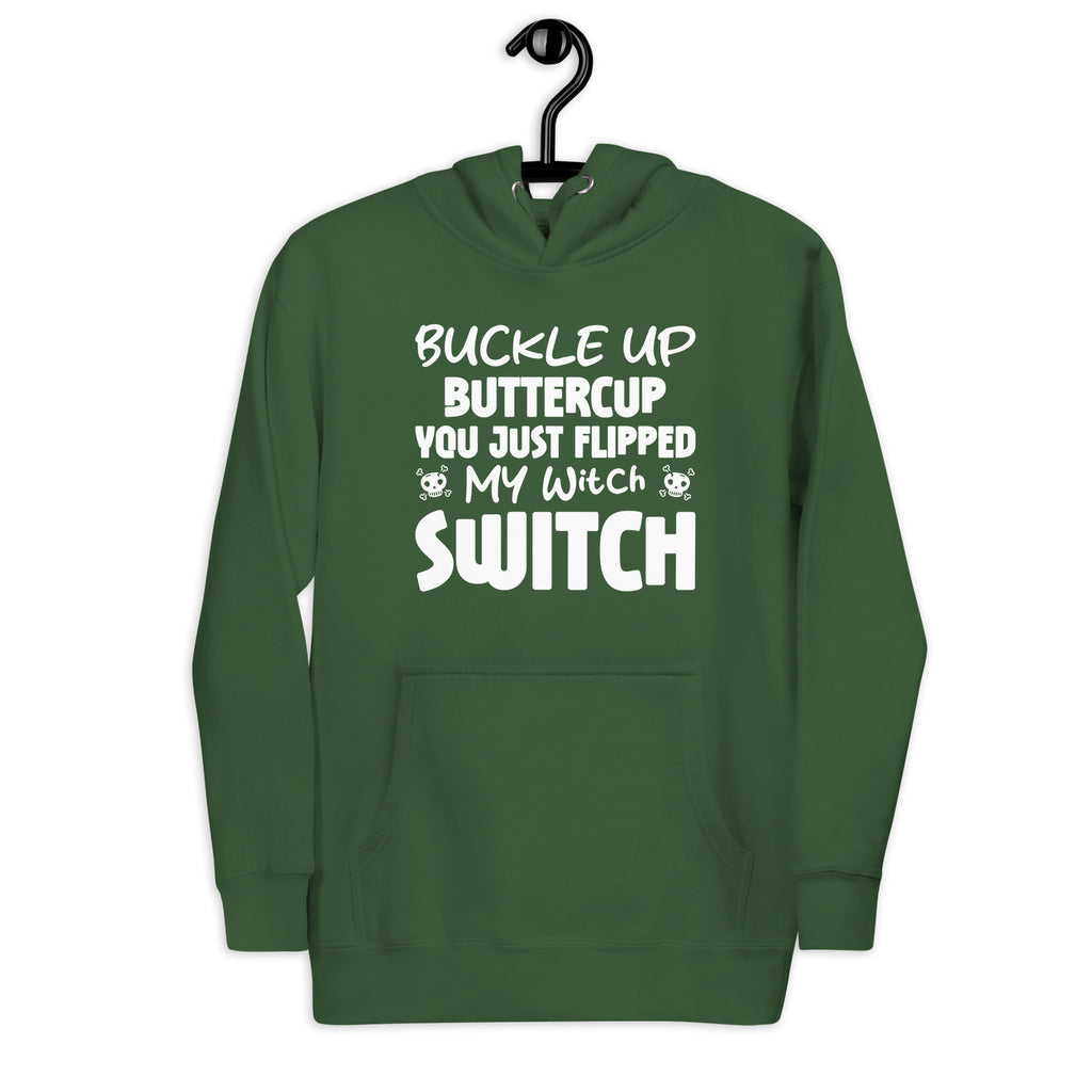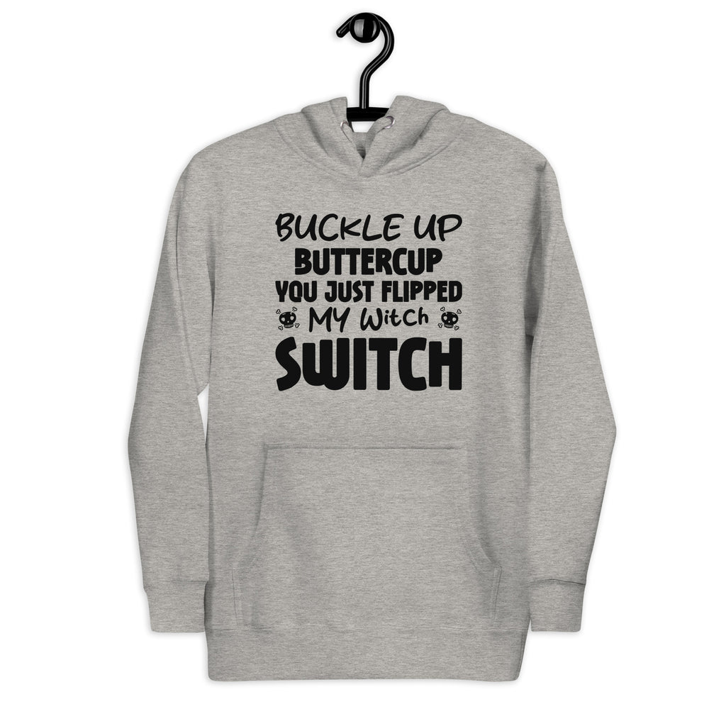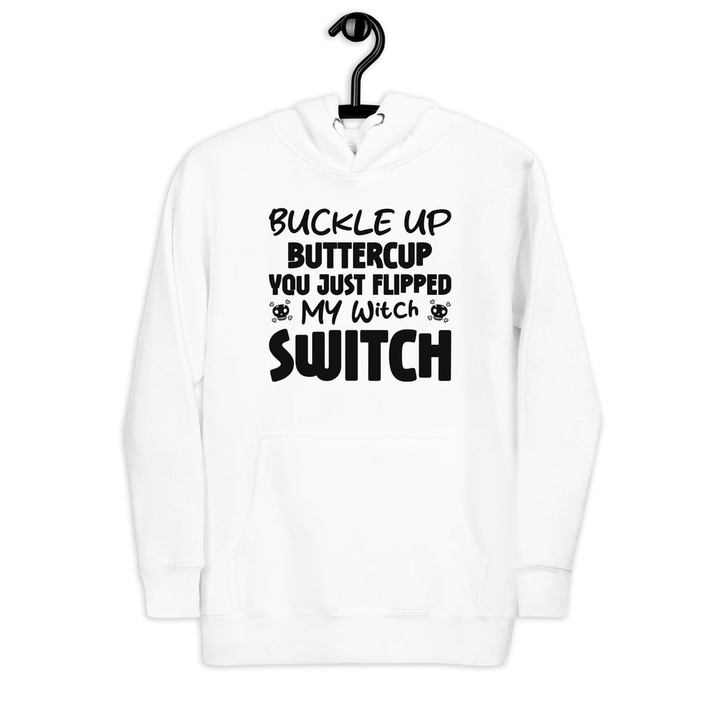 Embrace your magical side with attitude in this “Buckle Up Buttercup — You Just Flipped My Witch Switch” hoodie. Perfect for anyone who’s a little bit sweet, a little bit spooky, and a whole lot sassy, this fun design mixes humor with witchy charm.