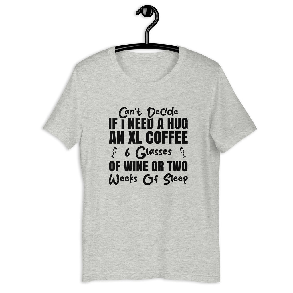 Give everyone a laugh while perfectly capturing your current life crisis with the “Can’t Decide If I Need a Hug, an XL Coffee, 96 Glasses of Wine, or Two Weeks of Sleep” T-shirt — the ultimate tee for anyone who lives somewhere between exhausted, overwhelmed, and hilariously unbothered. This shirt sums up that universal feeling of needing… well, all of the above.