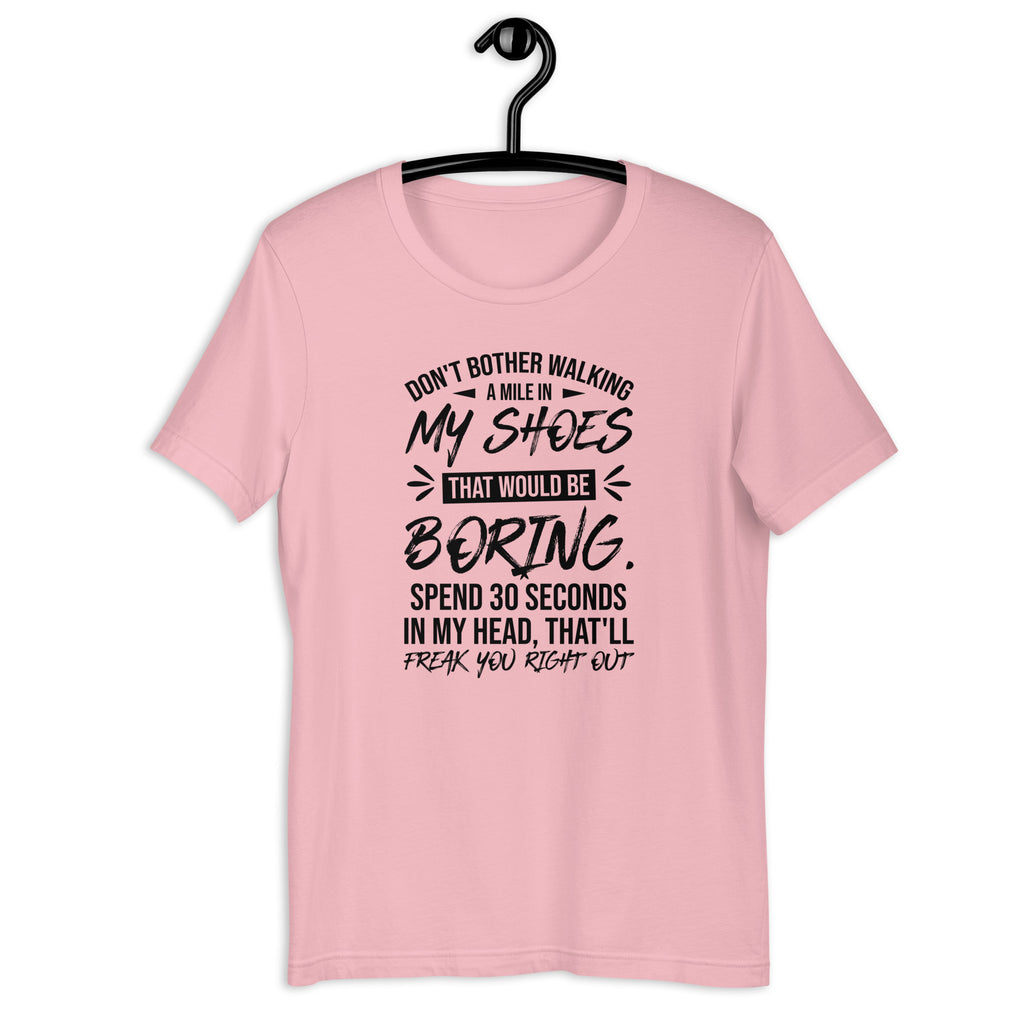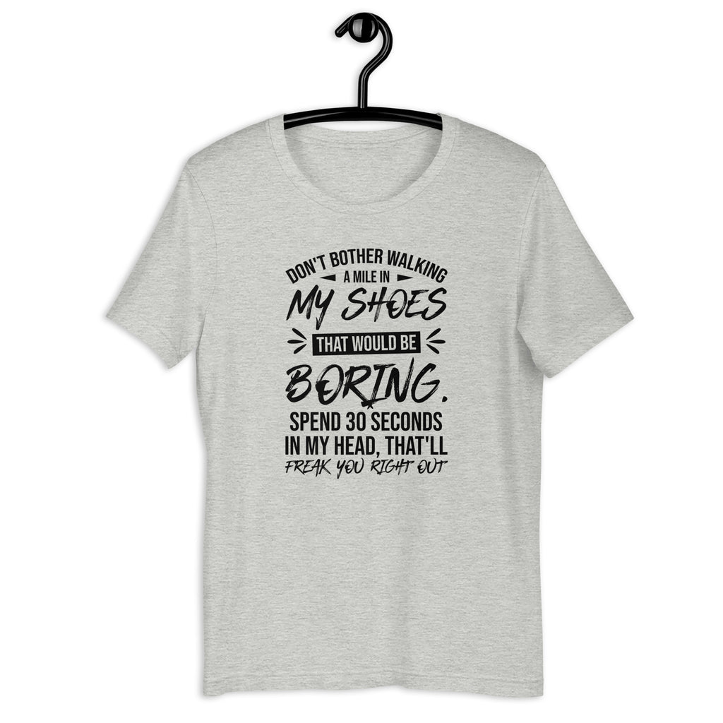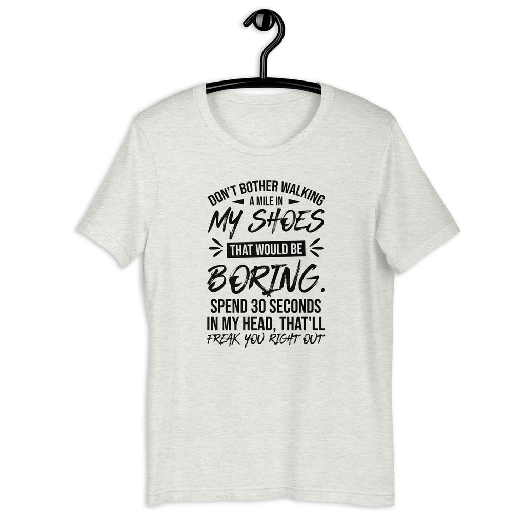 Step inside the chaos—if you dare. The “Don’t Bother Walking a Mile in My Shoes — That Would Be Boring. Spend 30 Seconds in My Head, That’ll Freak You Right Out” t-shirt perfectly captures the vibe of anyone whose thoughts move faster than their filter. Equal parts hilarious and relatable, this tee is for those who know their imagination is not for the faint of heart.