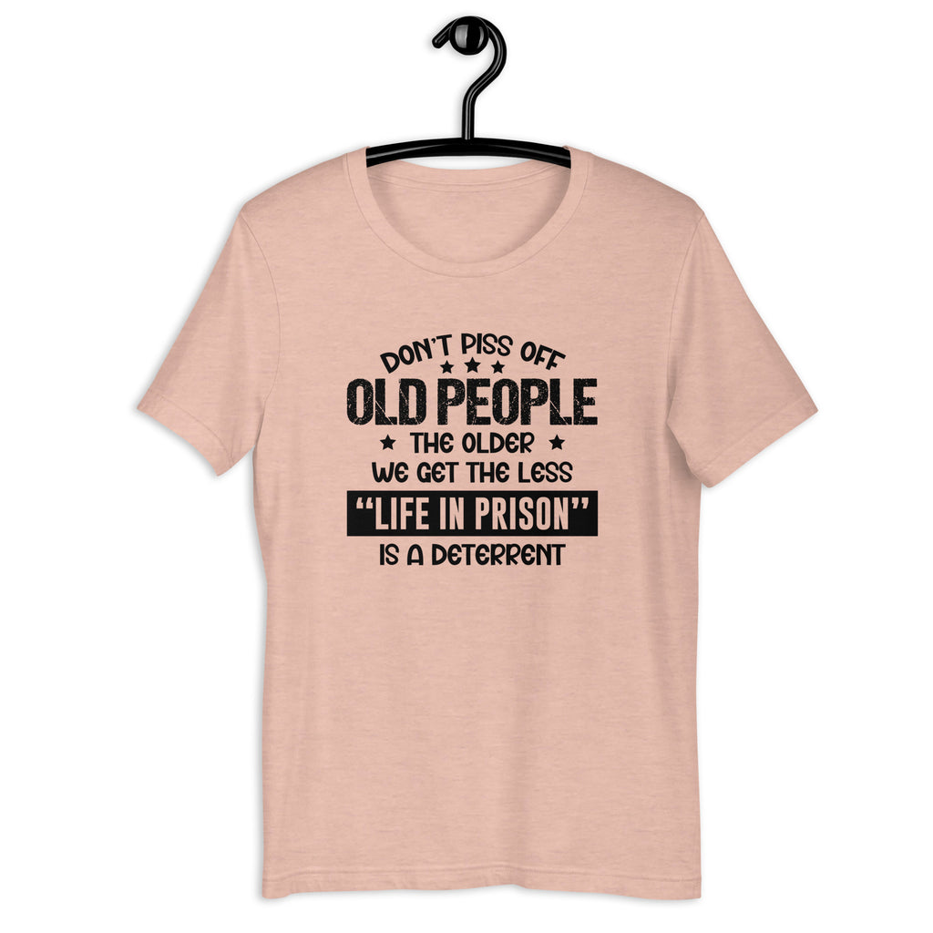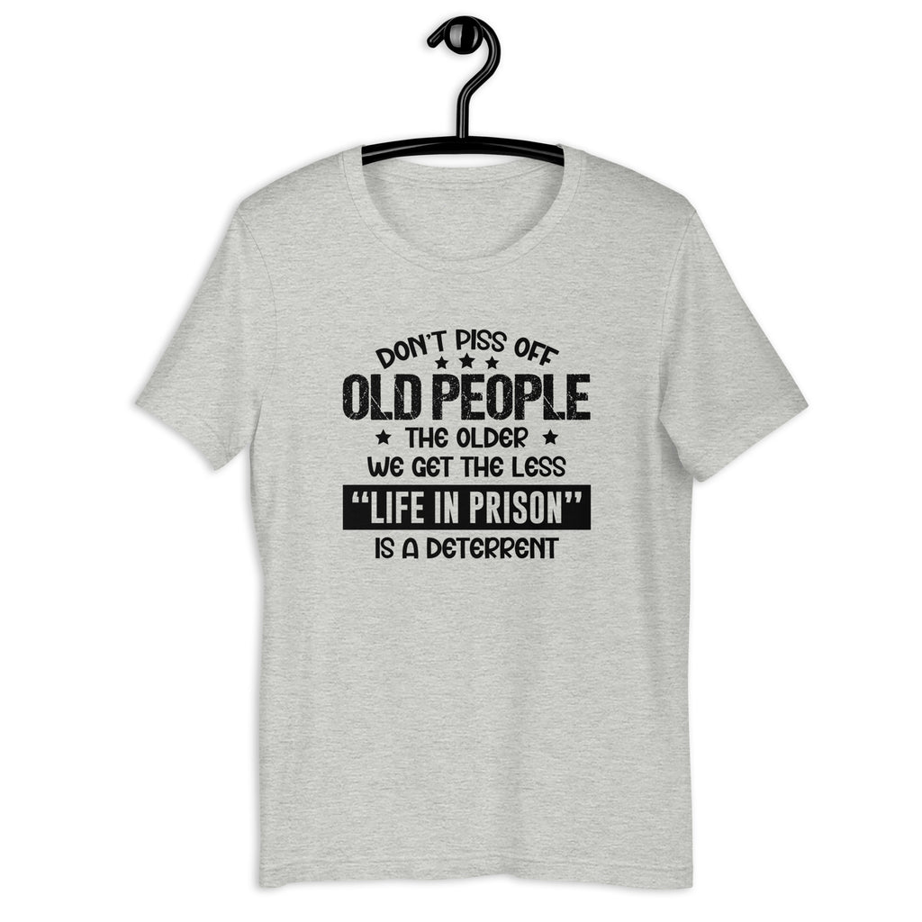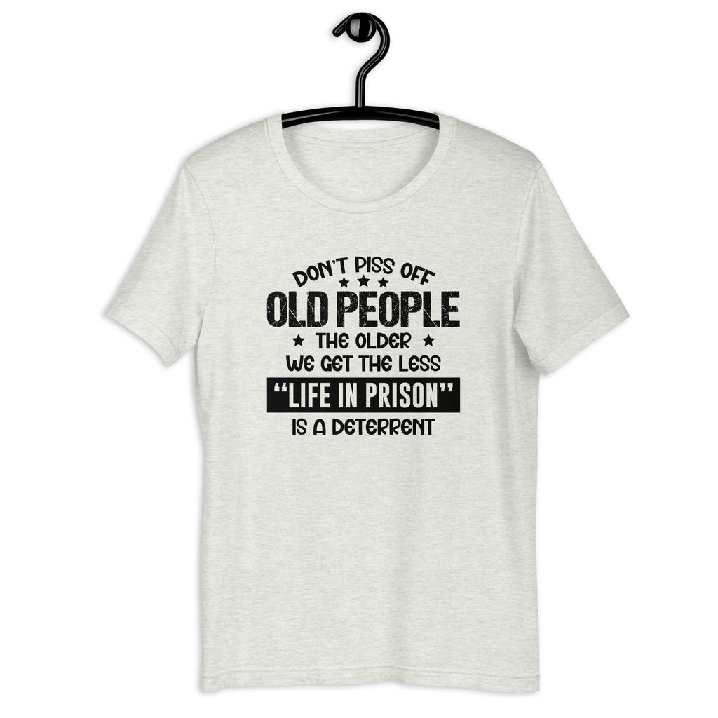 The “Don’t Piss Off Old People The Older We Get The Less Life in Prison Is a Deterrent” t-shirt is a perfect mix of humor and a little dark truth. Bold, funny, and slightly savage, it’s made for those who know that with age comes wisdom—and a lot less patience. This tee is sure to get laughs (and maybe a few nervous looks) wherever you wear it.