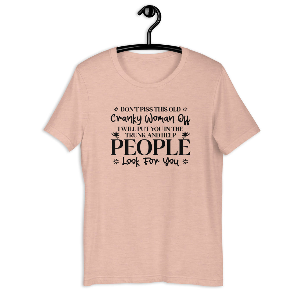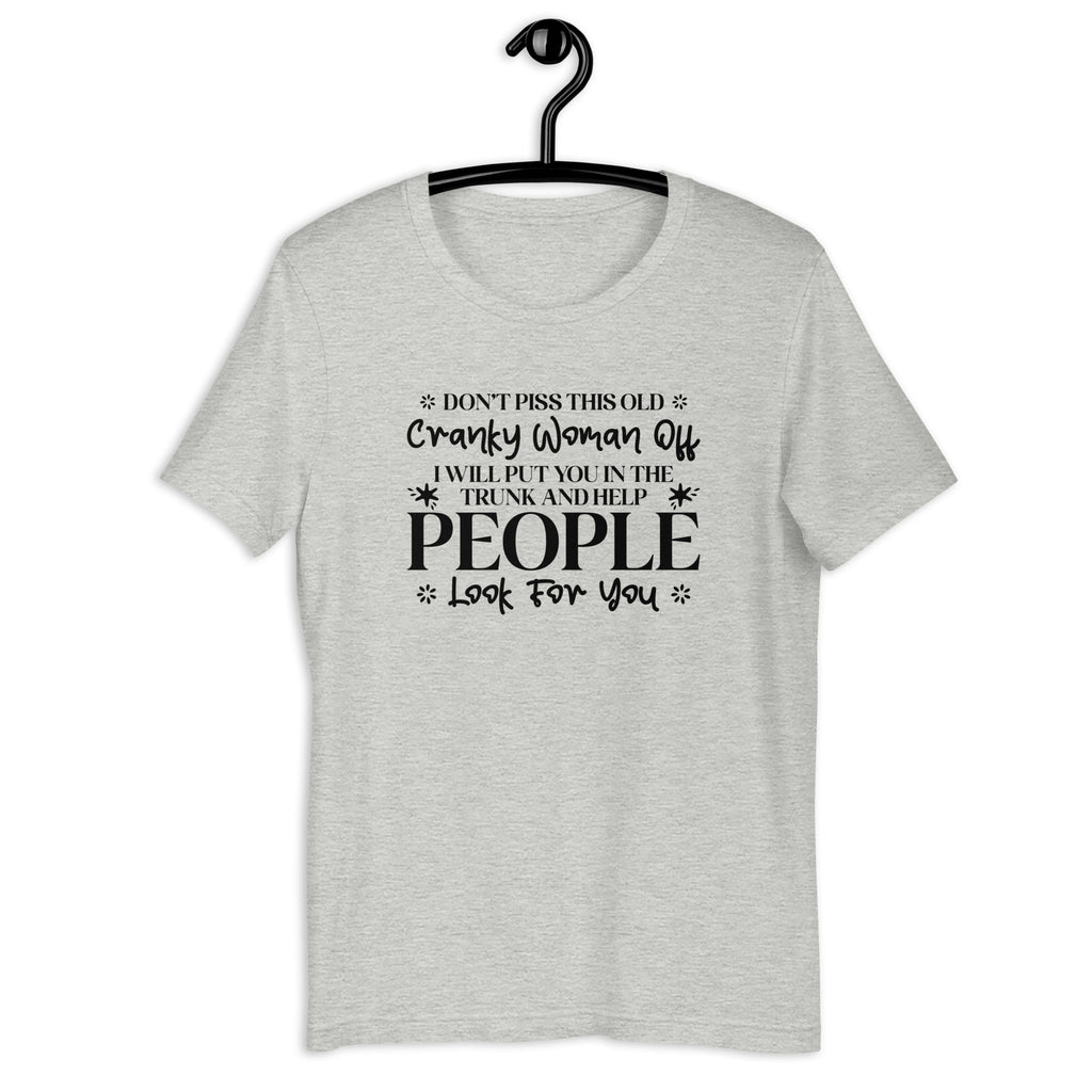 The “Don’t Piss This Old Cranky Woman Off” t-shirt is the perfect blend of sass, humor, and a little bit of dark comedy. Bold and unapologetic, this tee lets everyone know you’re not someone to mess with—you’ve got the attitude, the experience, and maybe even the trunk space to prove it. It’s a laugh-out-loud design that’s sure to get attention (and maybe a few nervous chuckles).