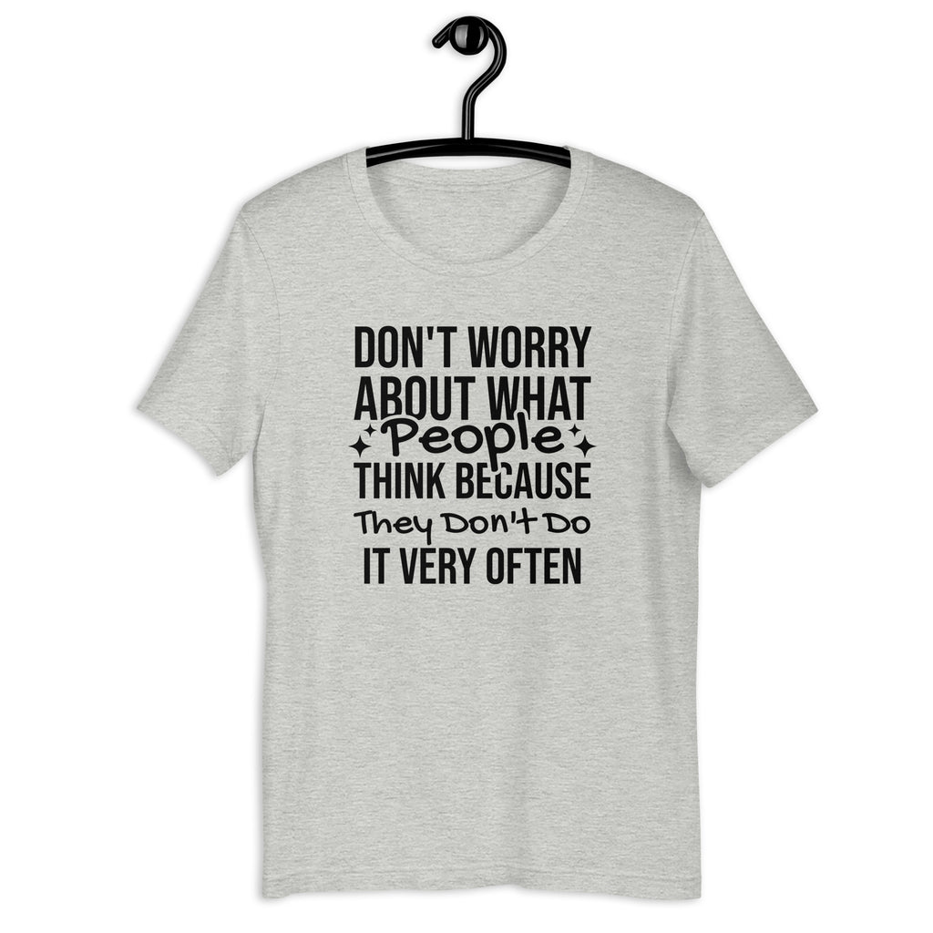 Relax—it’s not that deep. This “Don’t Worry About What People Think Because They Don’t Do It Very Often” t-shirt is a funny reminder that overthinking is pointless when common sense is in such short supply.