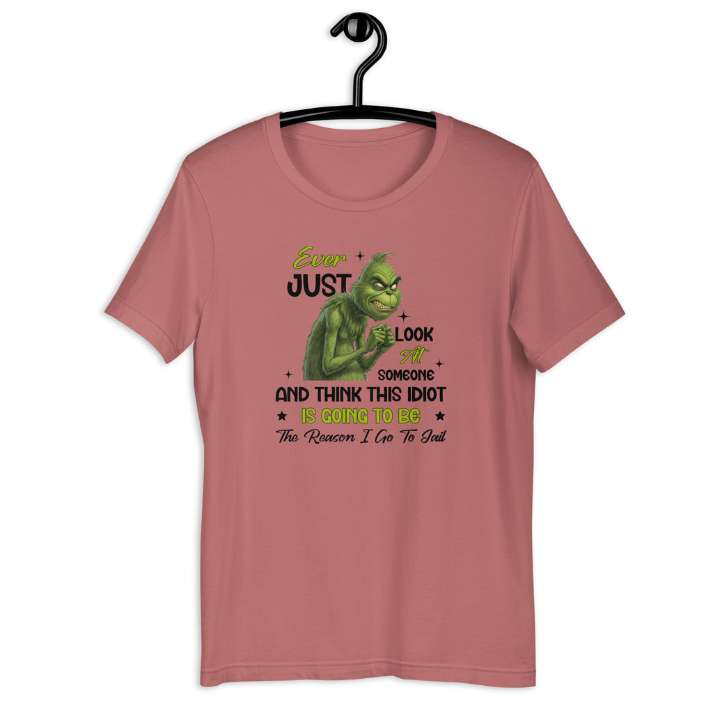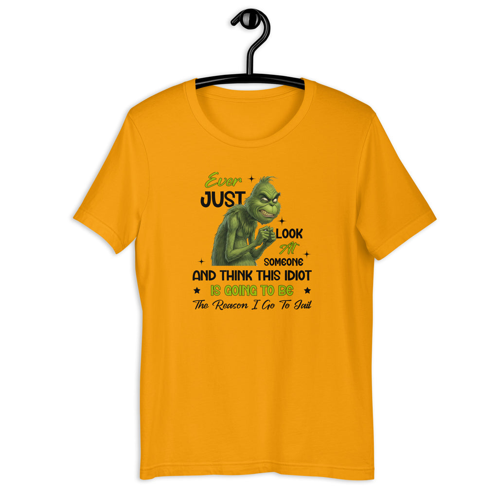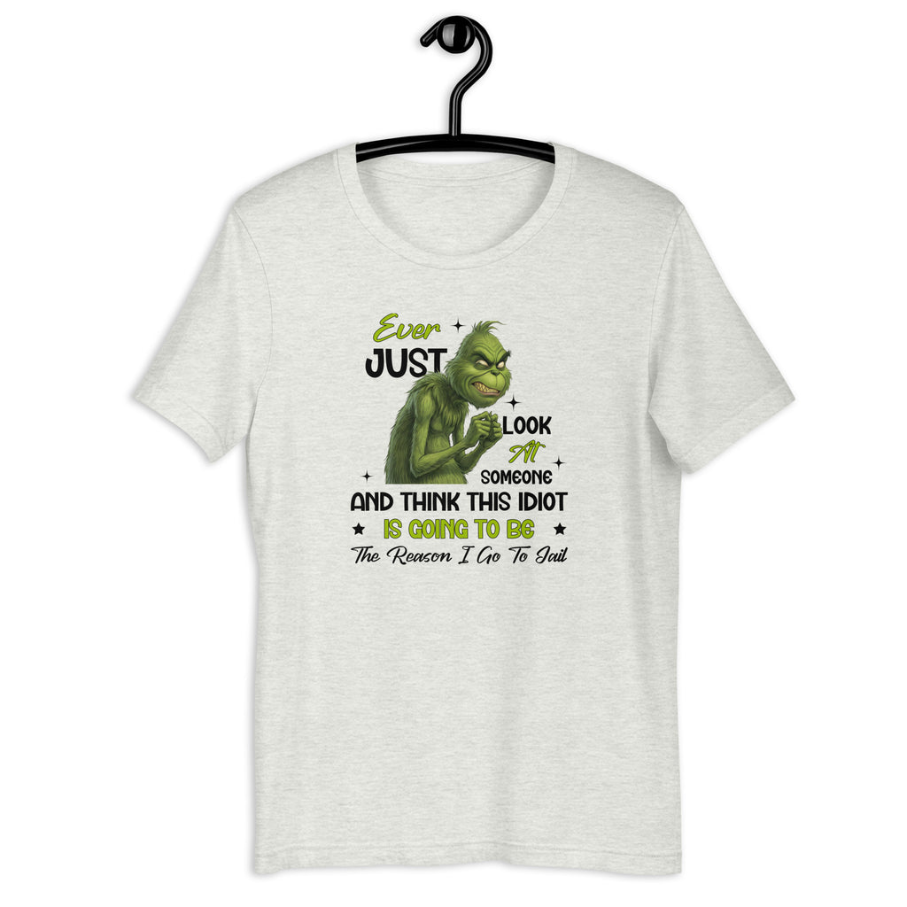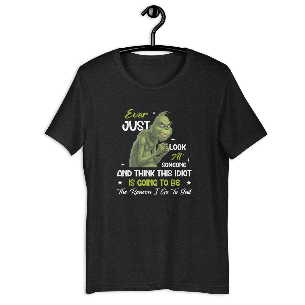 Serve sarcasm with a warning label in this dark‑humor T‑shirt that perfectly captures those why-are-you-like-this moments. Featuring the line “Ever Just Look at Someone and Think… This Idiot Is Going to Be the Reason I Go to Jail,” this design is all about exaggerated humor, not action—because sometimes thoughts are funnier when they stay thoughts.