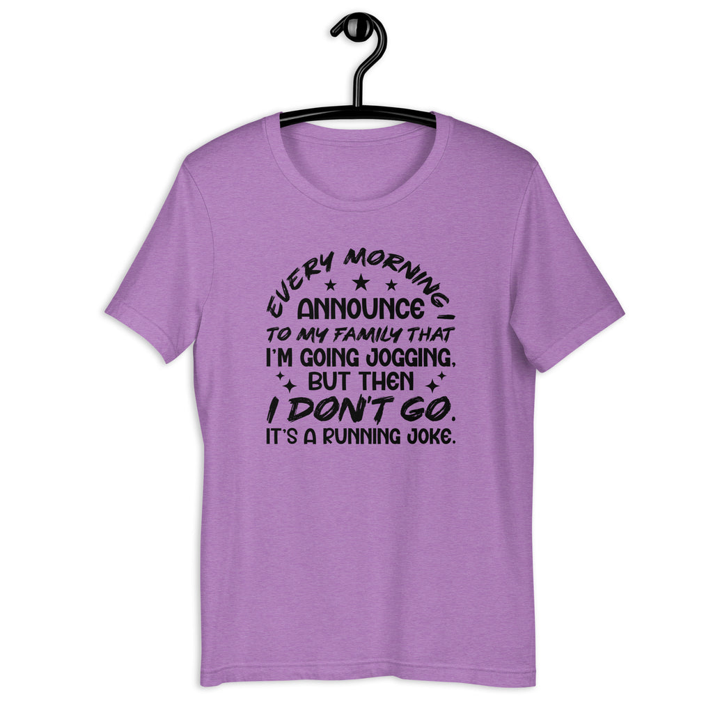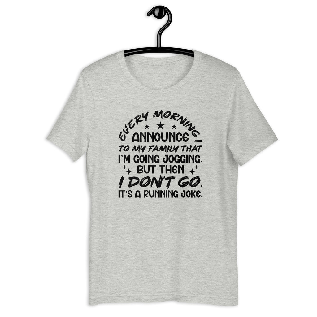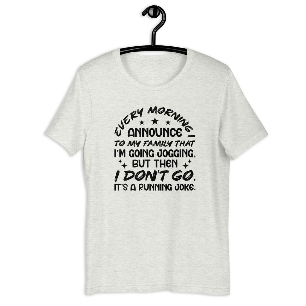 Start your day with a laugh in the “Every Morning I Announce to My Family That I’m Going Jogging, But Then I Don’t Go — It’s a Running Joke” t-shirt. Perfect for anyone who loves humor more than cardio, this tee turns procrastination into comedy gold.