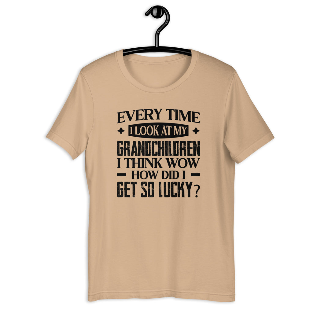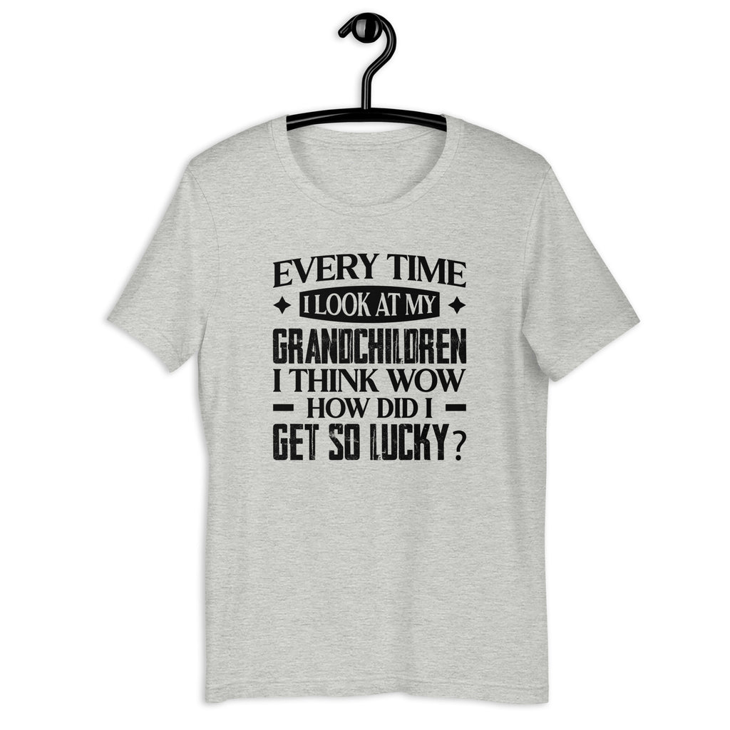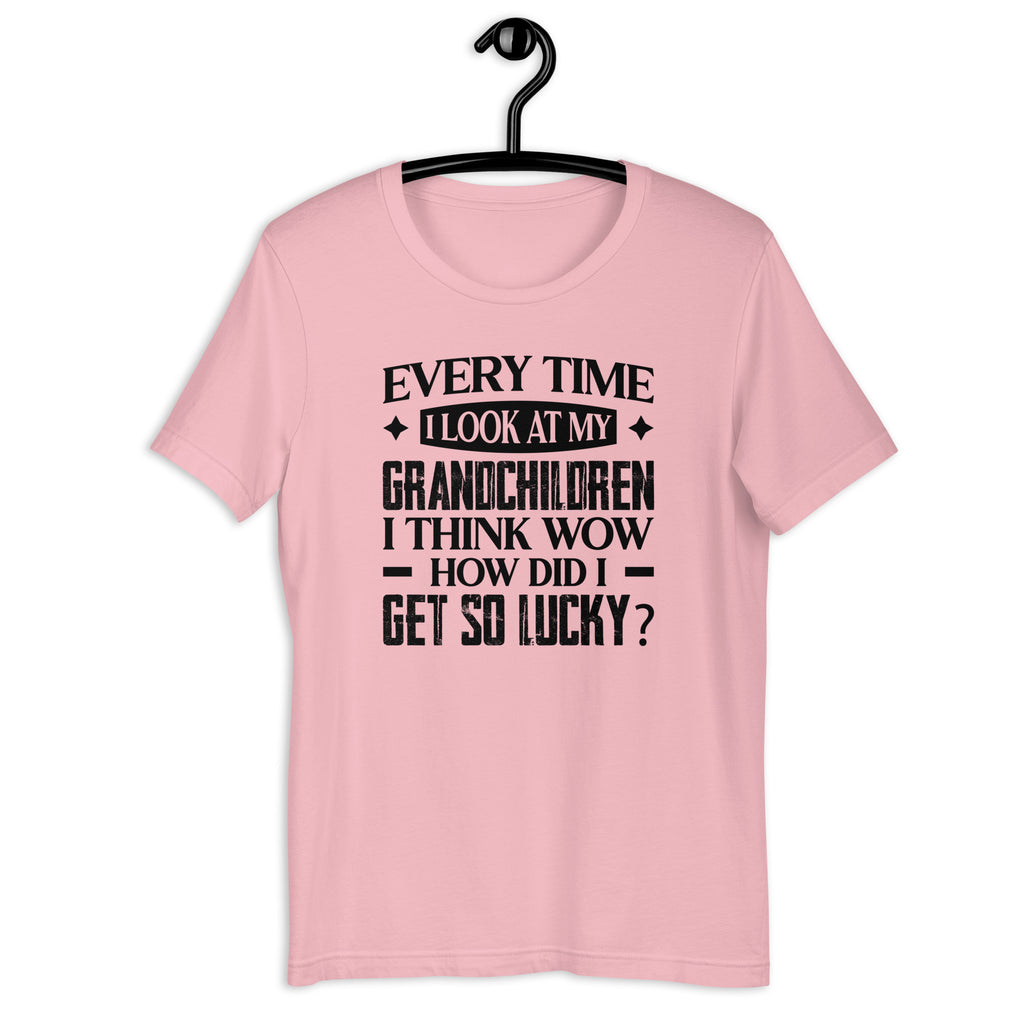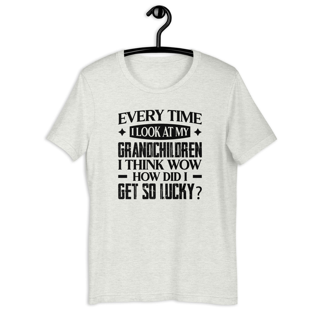 Celebrate the joy of being a grandparent with the “Every Time I Look at My Grandchildren, I Think — Wow, How Did I Get So Lucky” T-shirt. This heartwarming tee perfectly captures the pride and love that come with watching your grandkids grow.