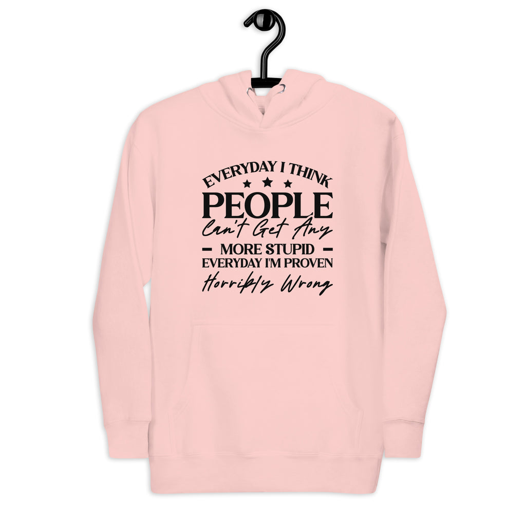 Sarcastic, relatable, and unapologetically honest. The “Everyday I Think People Can’t Get Any More Stupid — Everyday I’m Proven Horribly Wrong” hoodie is made for those who face the world with humor, patience, and a whole lot of disbelief. It perfectly captures that daily moment when reality lowers the bar yet again.