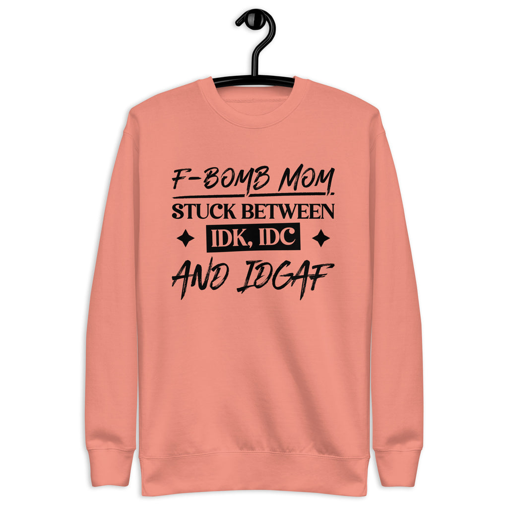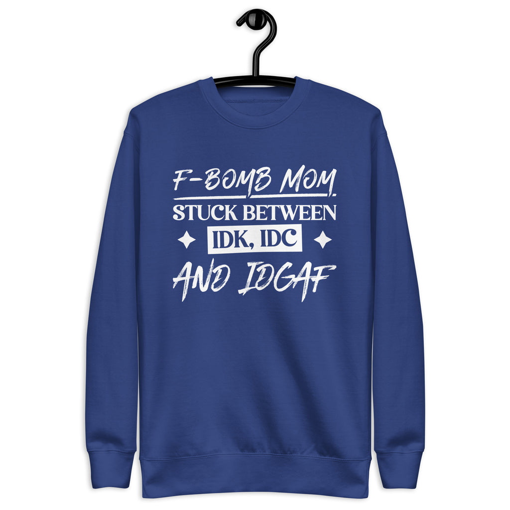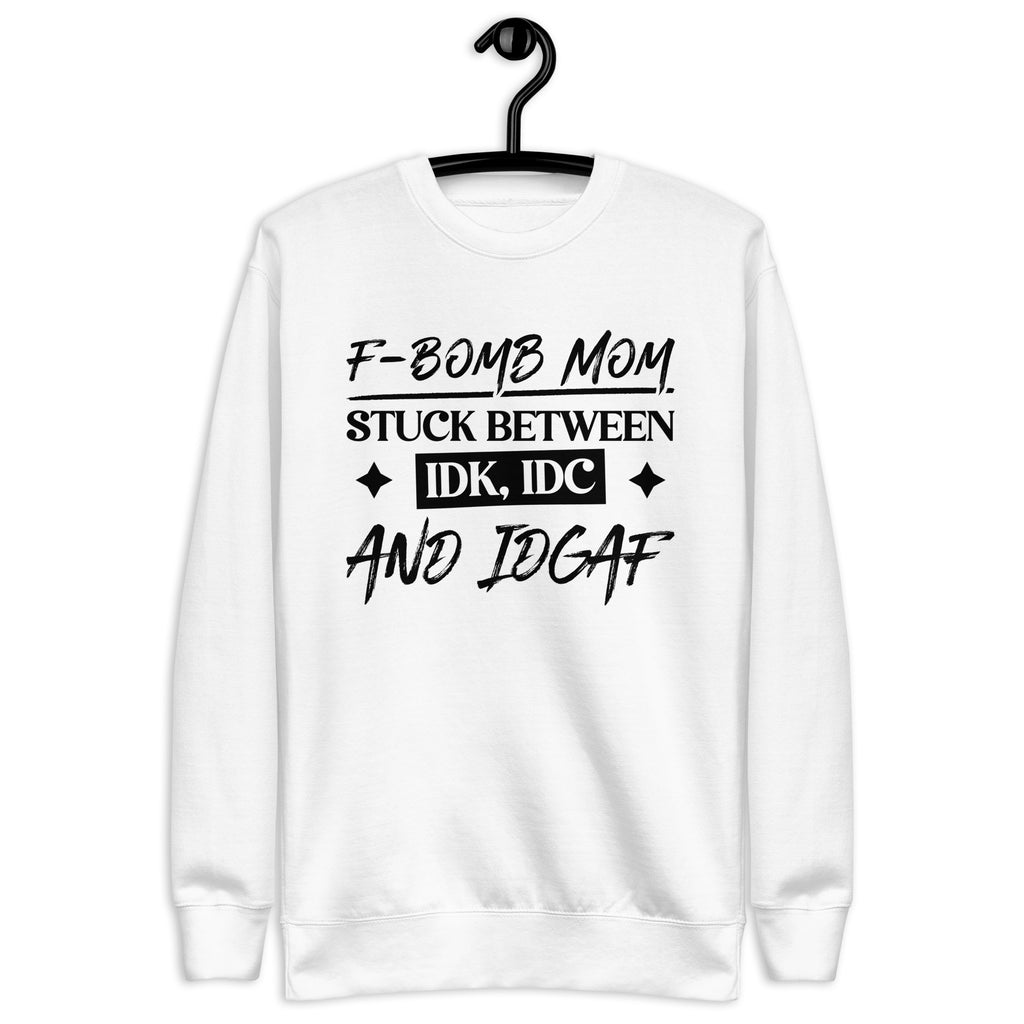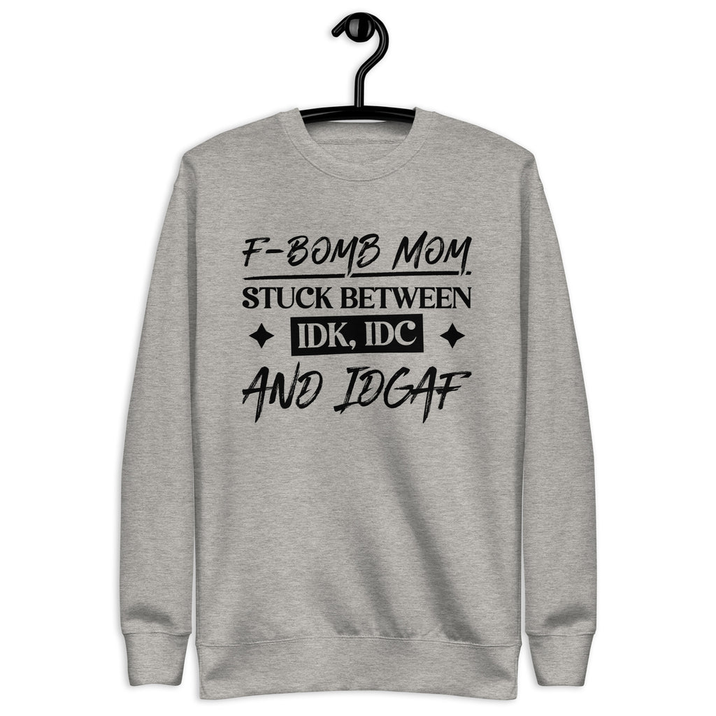 Show off your chaotic mom energy with the “F-Bomb Mom — Stuck Between IDK, IDC, and IDGAF” sweatshirt. Perfect for moms who juggle it all with a mix of love, sarcasm, and a few choice words, this design captures the perfectly imperfect reality of motherhood.