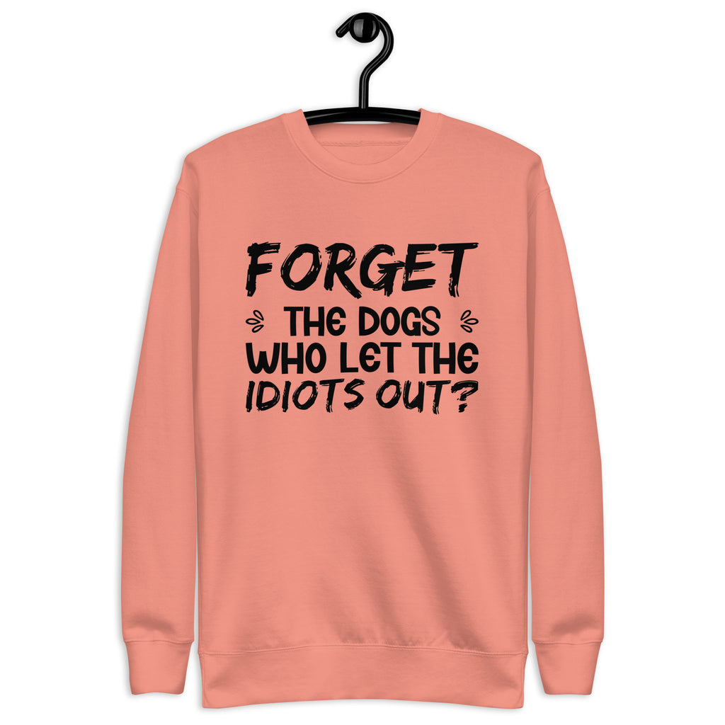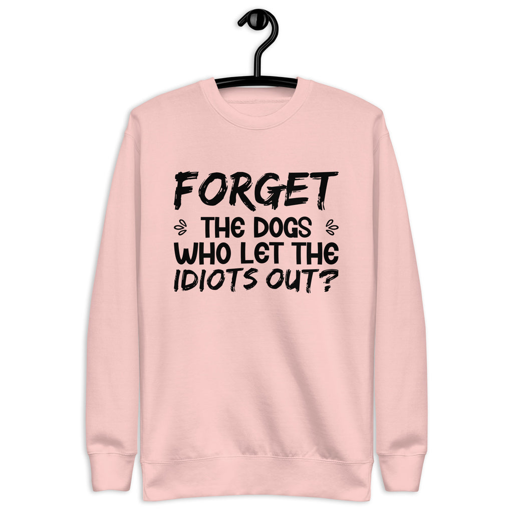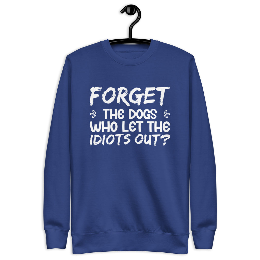 Funny, sarcastic, and unapologetically bold. The “Forget the Dogs — Who Let the Idiots Out?” sweatshirt is made for anyone with a sharp sense of humor and zero patience for nonsense. It’s a playful twist on a familiar phrase, delivering just enough sass to turn heads and spark laughs.