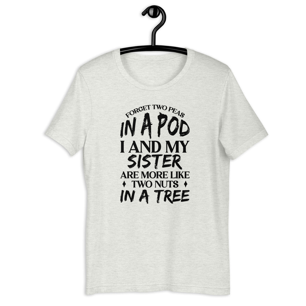Celebrate your one-of-a-kind sister bond with humor. The “Forget Two Peas in a Pod, My Sister and I Are More Like Two Nuts in a Tree” t-shirt perfectly captures the chaotic, silly, and unshakable connection only sisters understand. It’s lighthearted, funny, and full of personality—just like the two of you.