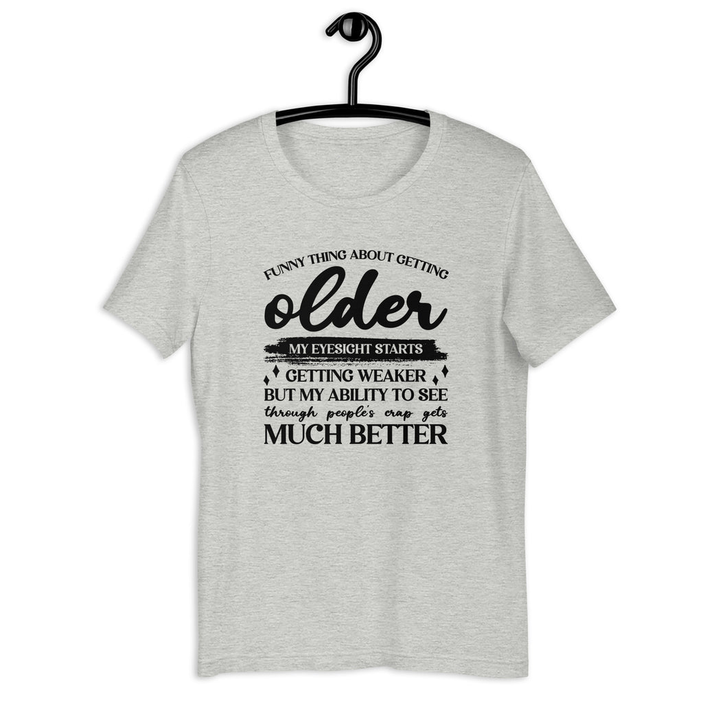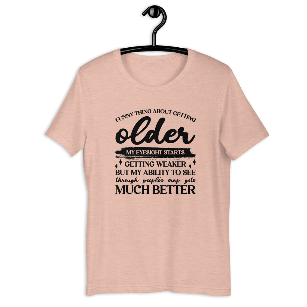 Keep it real with this “Funny Thing About Getting Older: Your Eyesight Starts Getting Weaker but My Ability to See Through People’s Crap Gets Much Better” t-shirt. Clever, bold, and a little savage, this tee is perfect for anyone who embraces aging with humor and honesty.
