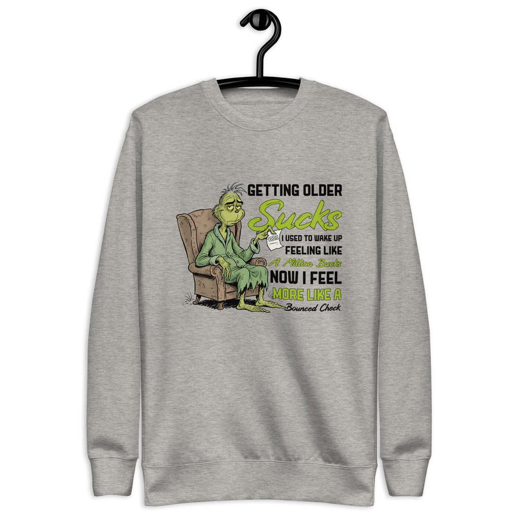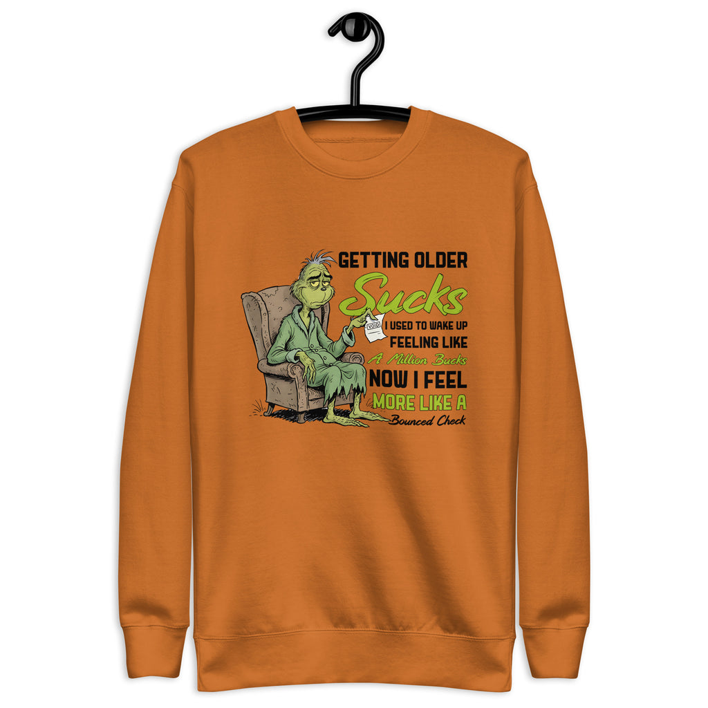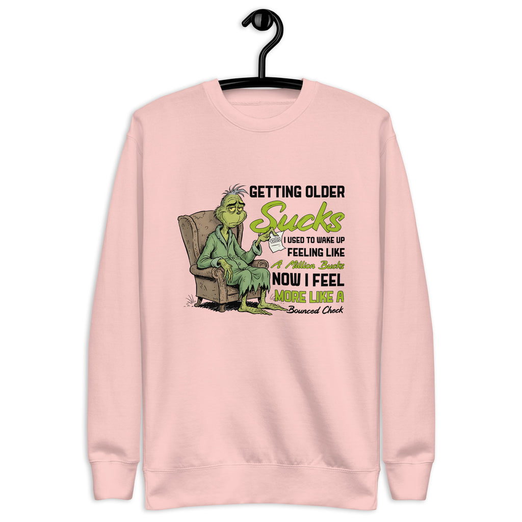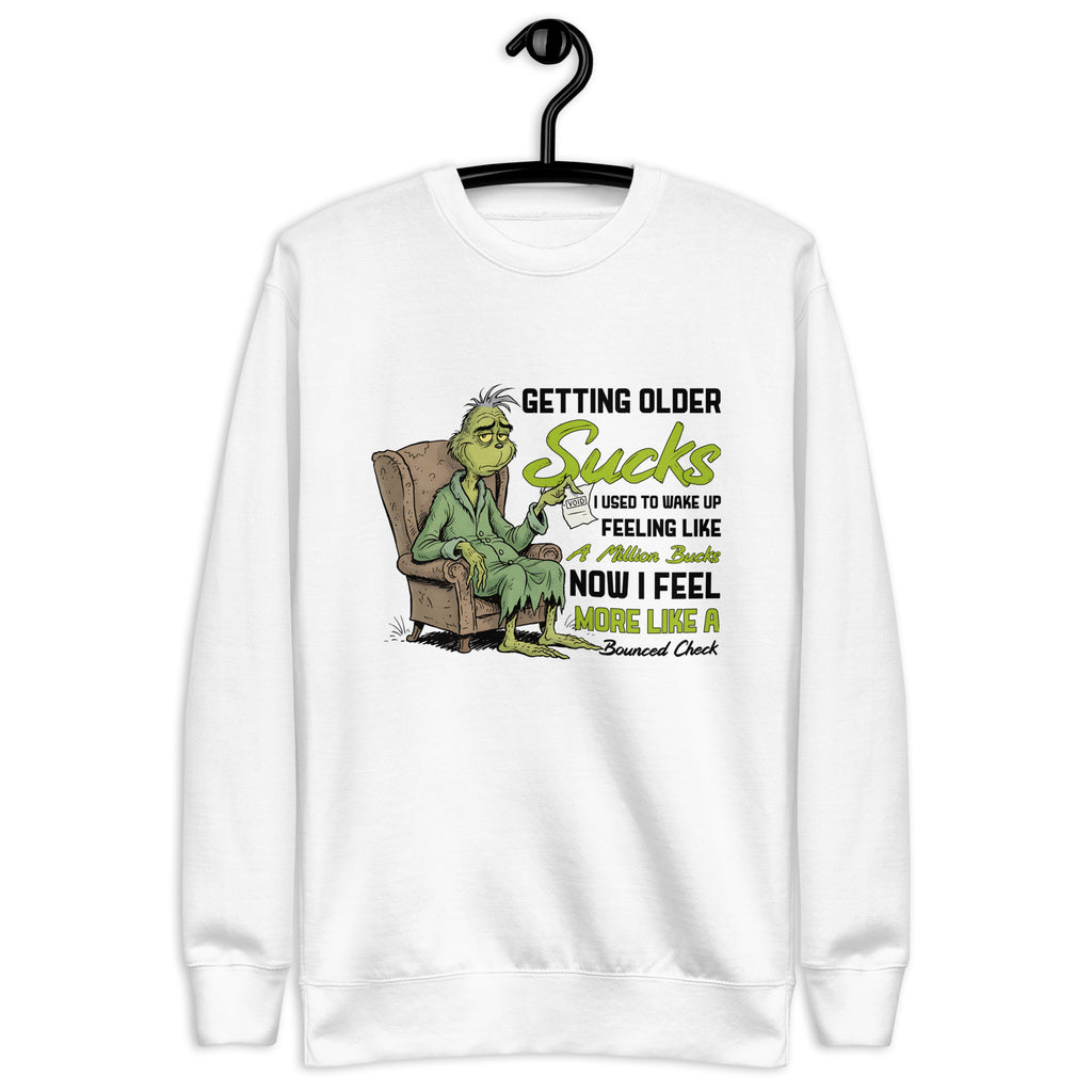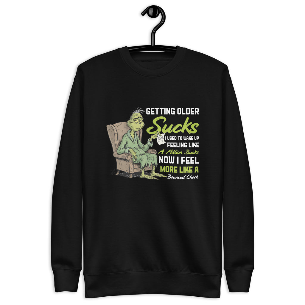 Embrace the humor in growing up with the “Getting Older Sucks — Feeling Like a Million Bucks, Now I Feel More Like a Bounced Check” sweatshirt. Perfect for anyone who’s survived life’s ups and downs with sarcasm and style, this piece turns reality into a hilarious, relatable statement.