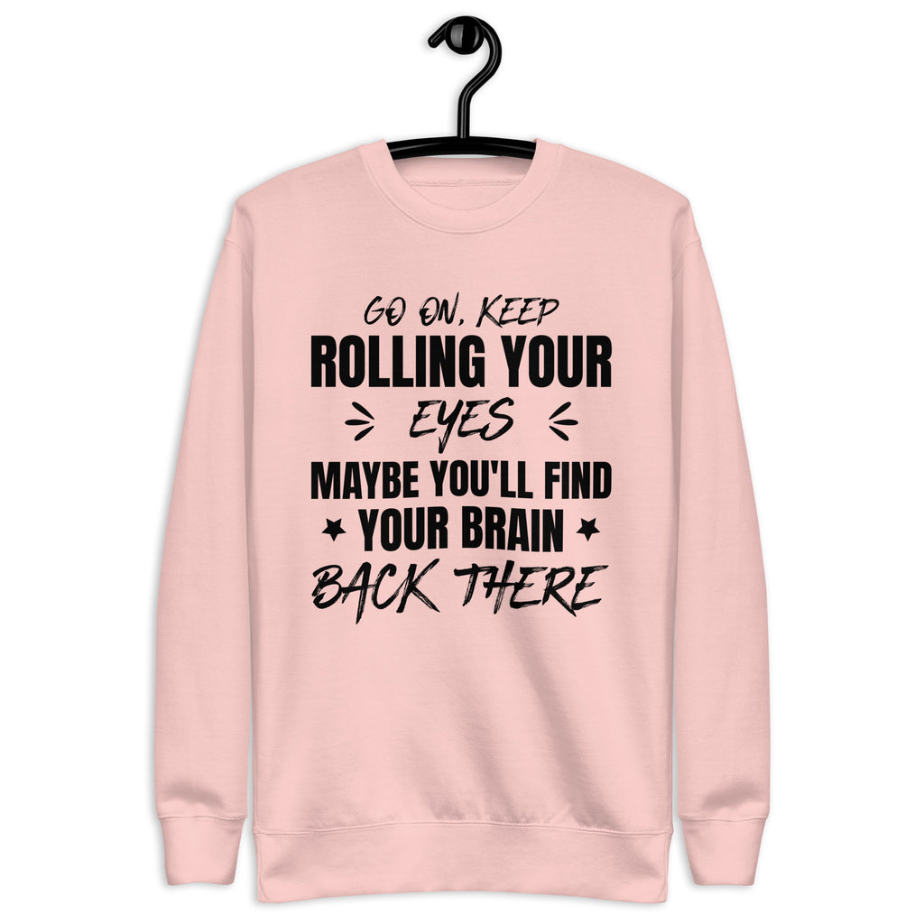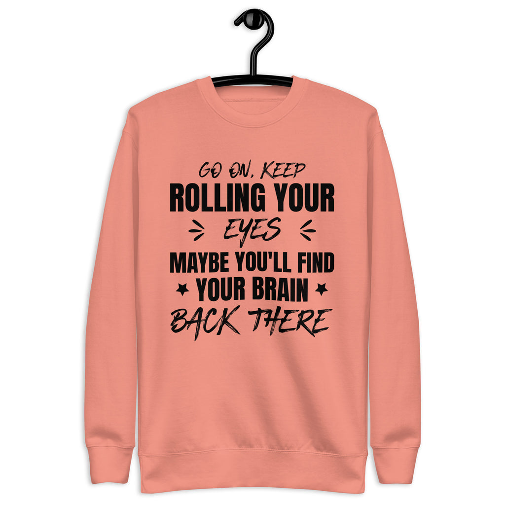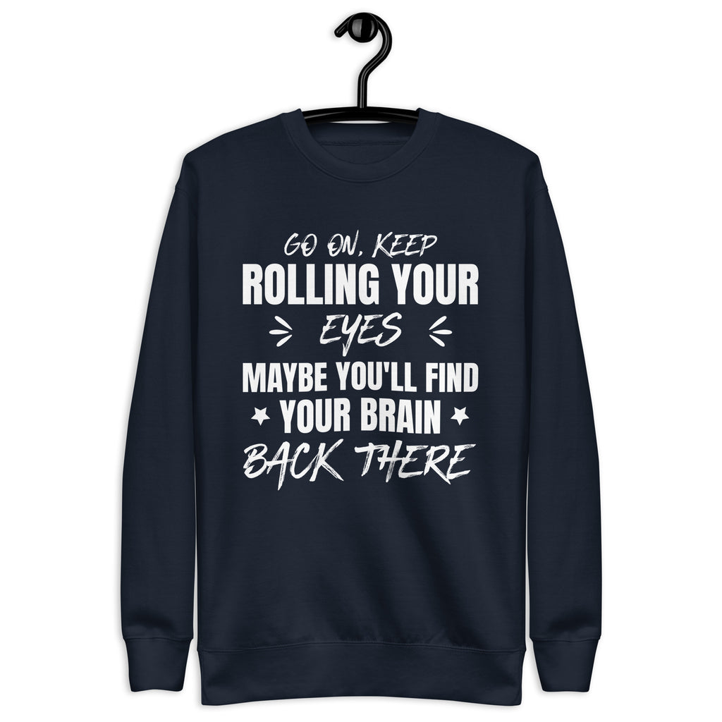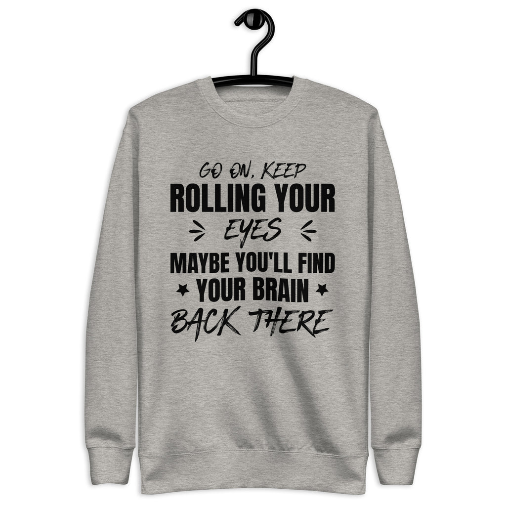 Go ahead — keep rolling those eyes, maybe you’ll find your brain back there. This “Go On, Keep Rolling Your Eyes, Maybe You’ll Find Your Brain Back There” sweatshirt is sarcasm stitched in comfort for those who’ve mastered the art of side-eye communication.
