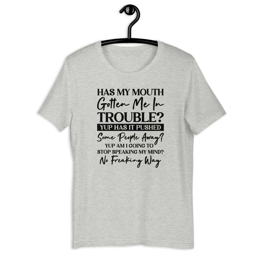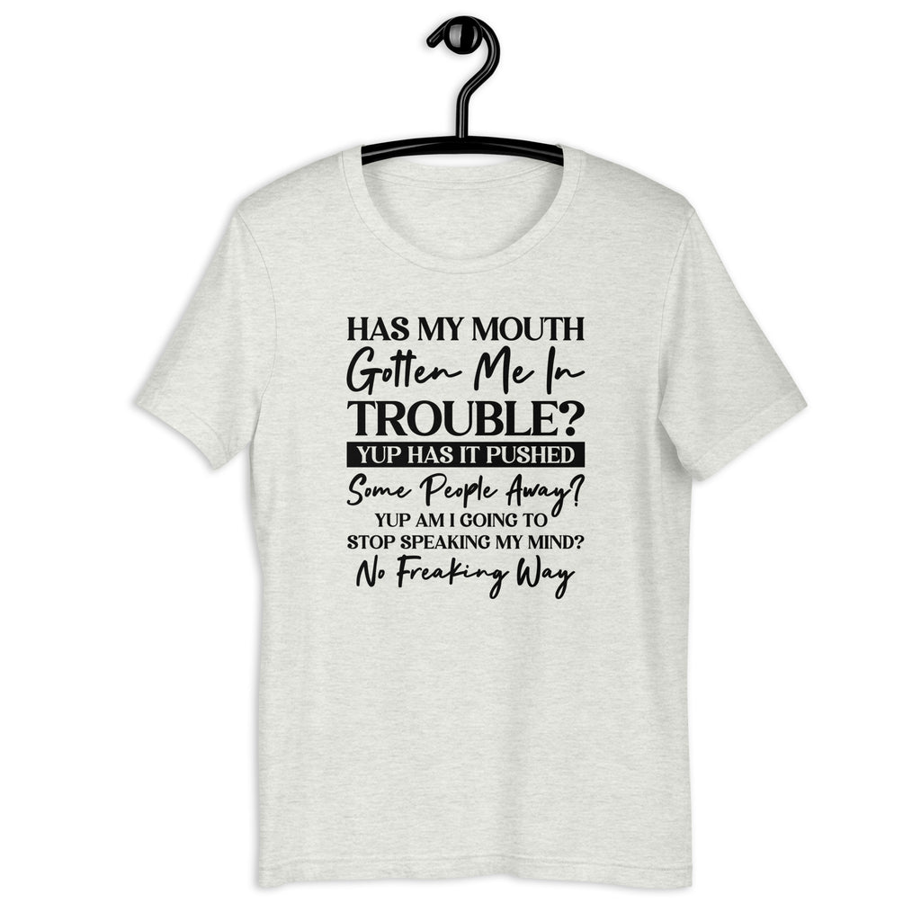 Own your truth with this “Has My Mouth Gotten Me in Trouble? Yup. Has It Pushed Some People Away? Yup. Am I Going to Stop Speaking My Mind? No Freaking Way” t-shirt. Honest, savage, and straight to the point, this tee is perfect for anyone who refuses to hold back their words.