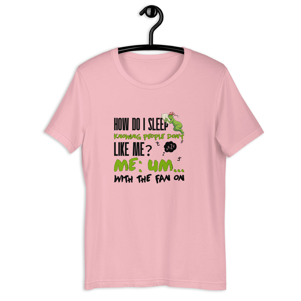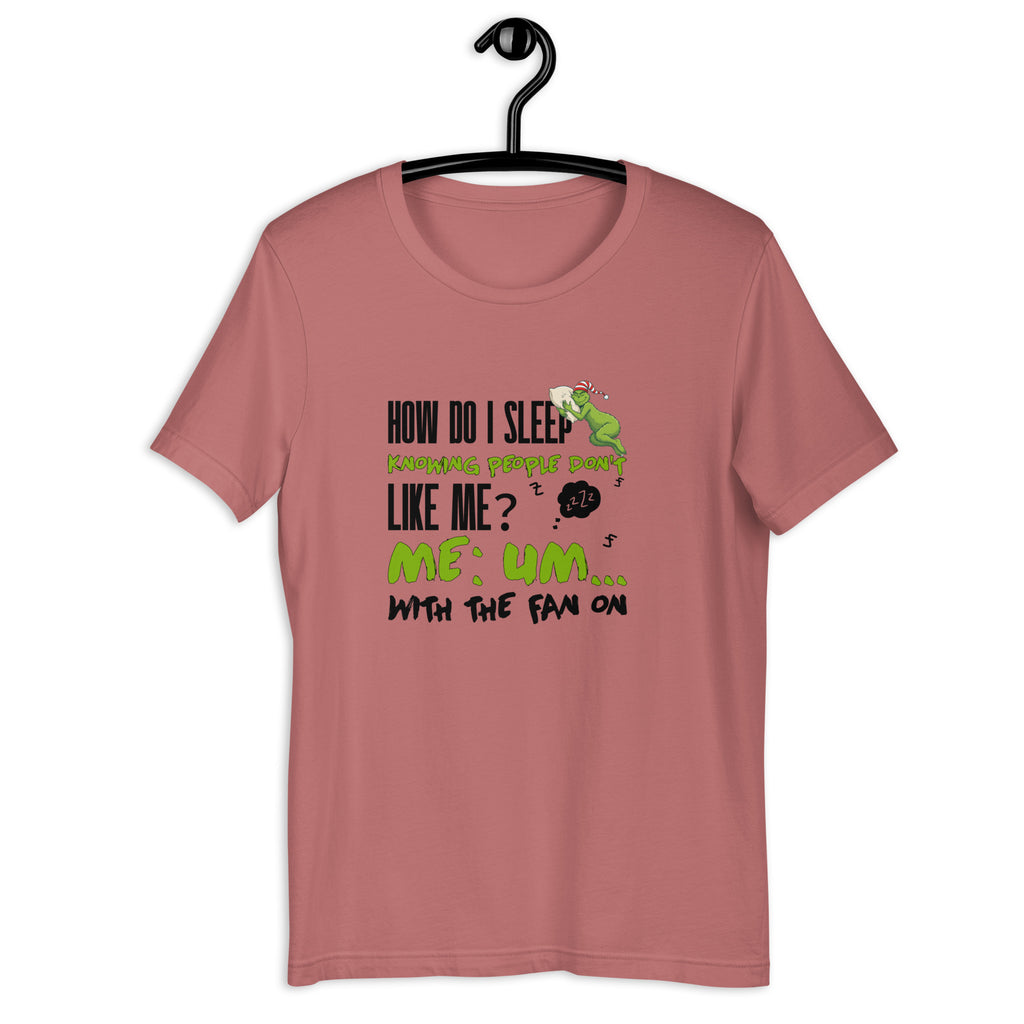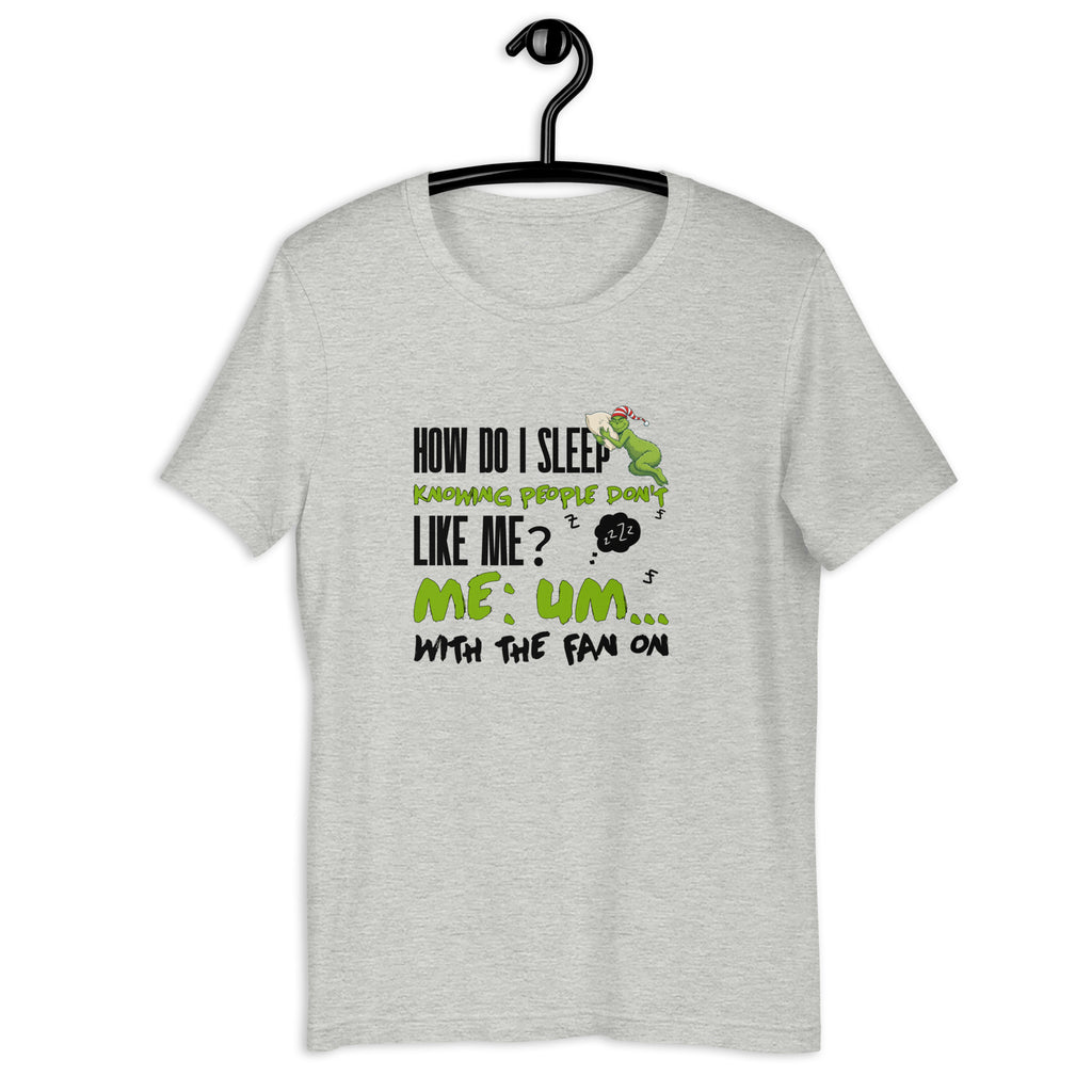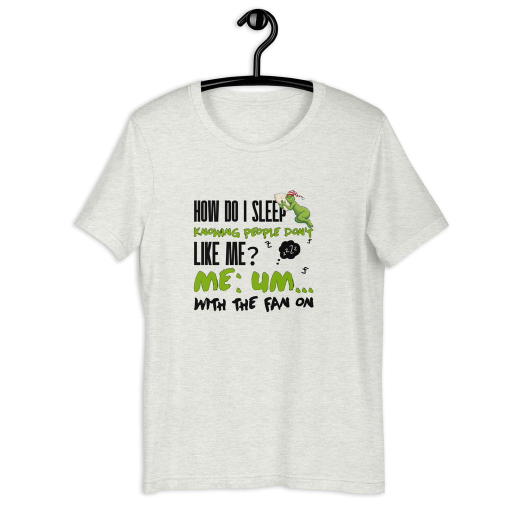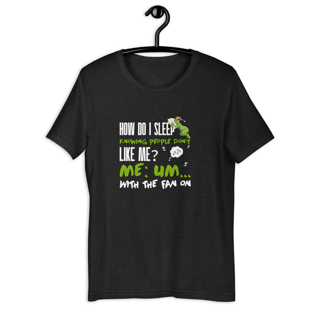 Let everyone know just how unbothered you truly are with the “HOW DO I SLEEP KNOWING PEOPLE DON’T LIKE ME? ME: UM… WITH THE FAN ON” T-shirt — the perfect sarcastic tee for anyone who’s long since stopped losing sleep over opinions that don’t pay their bills. With drama blowing around like hot air and haters talking louder than they think, this shirt delivers the ultimate reminder that peace hits different when your fan is on high.