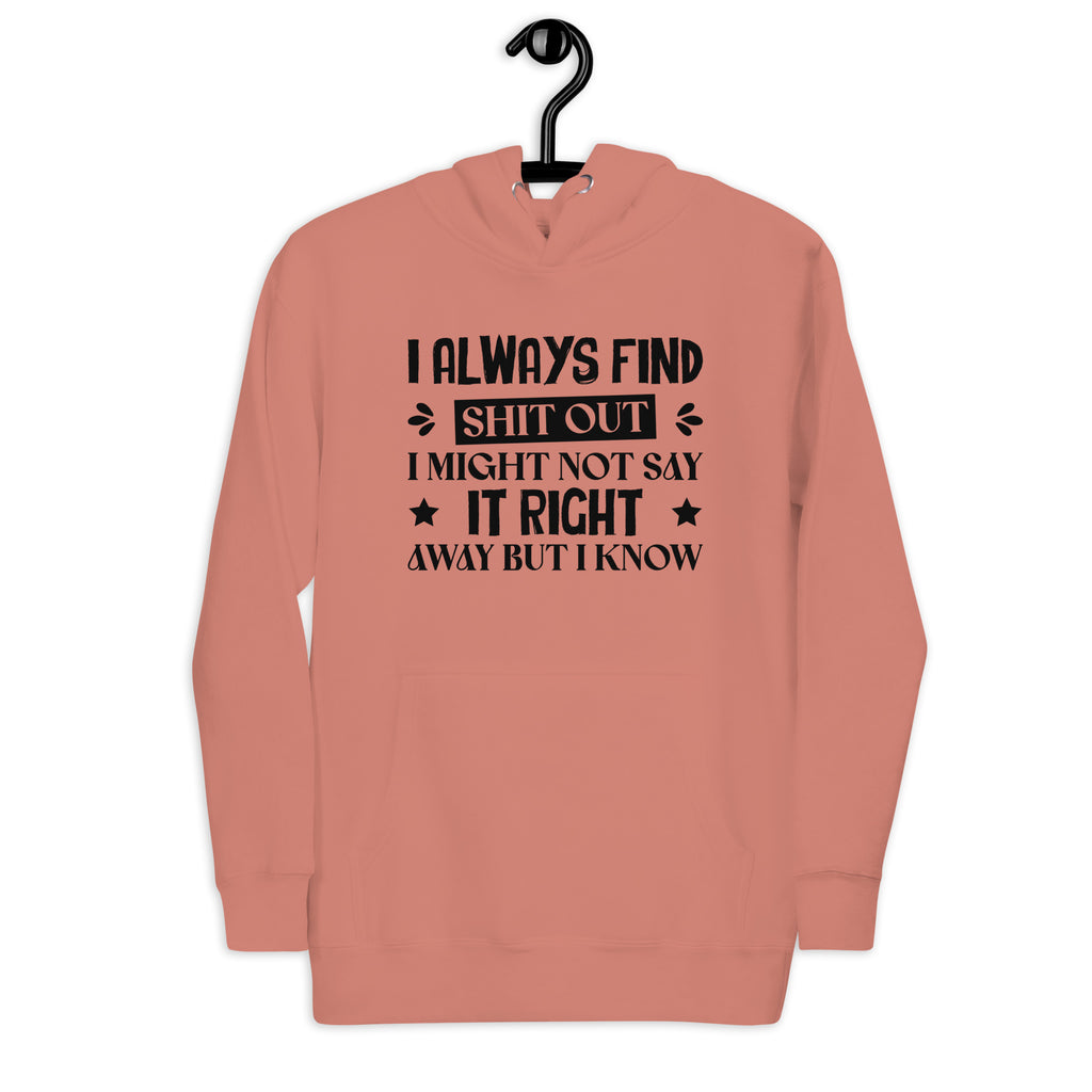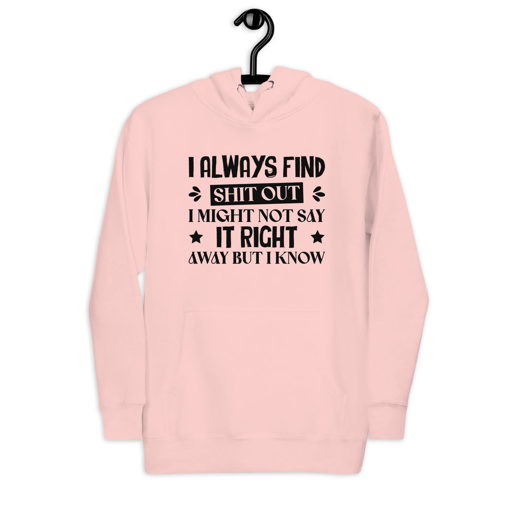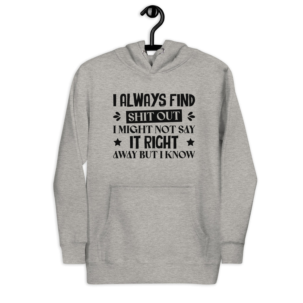 Bold, honest, and unapologetically real. The “I Always Find Sh*t Out — I Might Not Say It Right Away, But I Know” hoodie is made for those who observe quietly and remember everything. With a statement rooted in truth, this hoodie delivers confidence without the need to explain.