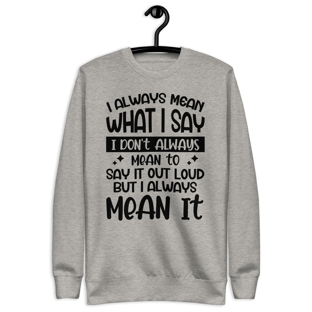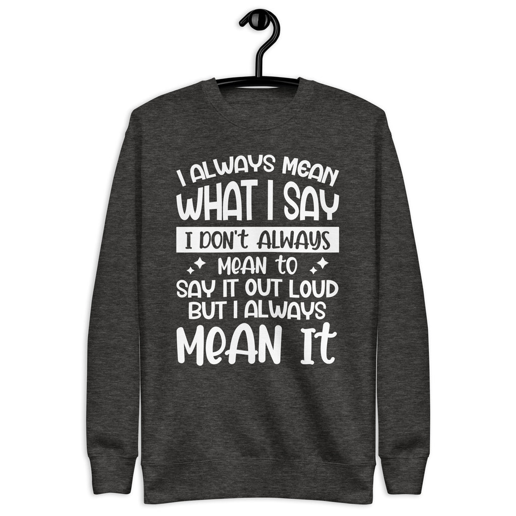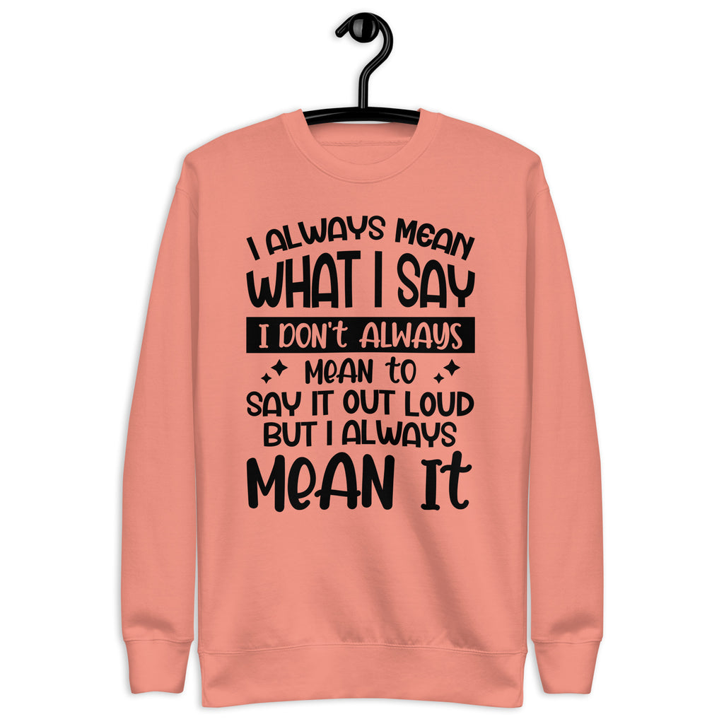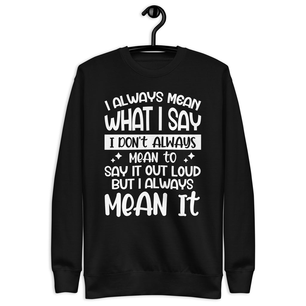 Own your honesty (and your lack of filter) with the “I Always Mean What I Say — I Don’t Always Mean to Say It Out Loud, But I Always Mean It” sweatshirt. Perfect for anyone who speaks their mind before thinking twice, this cozy favorite captures the perfect mix of truth, humor, and a little bit of trouble.