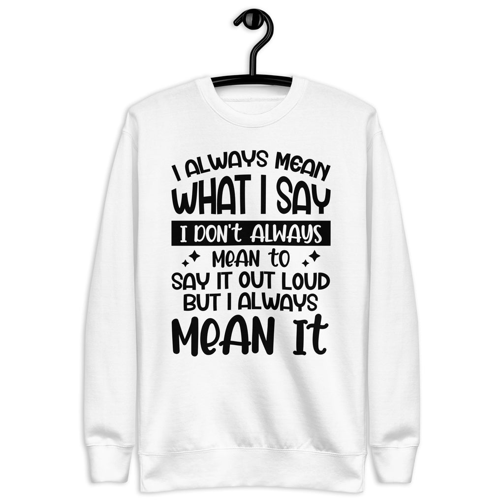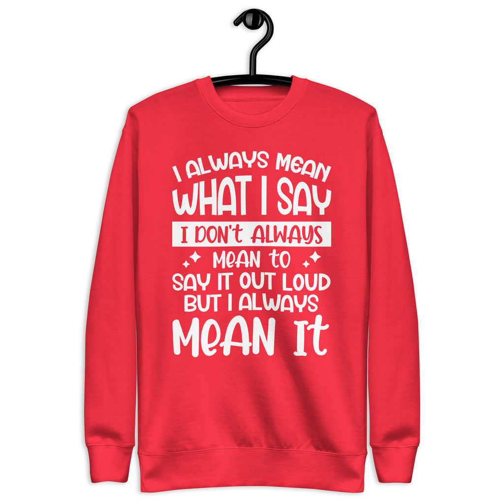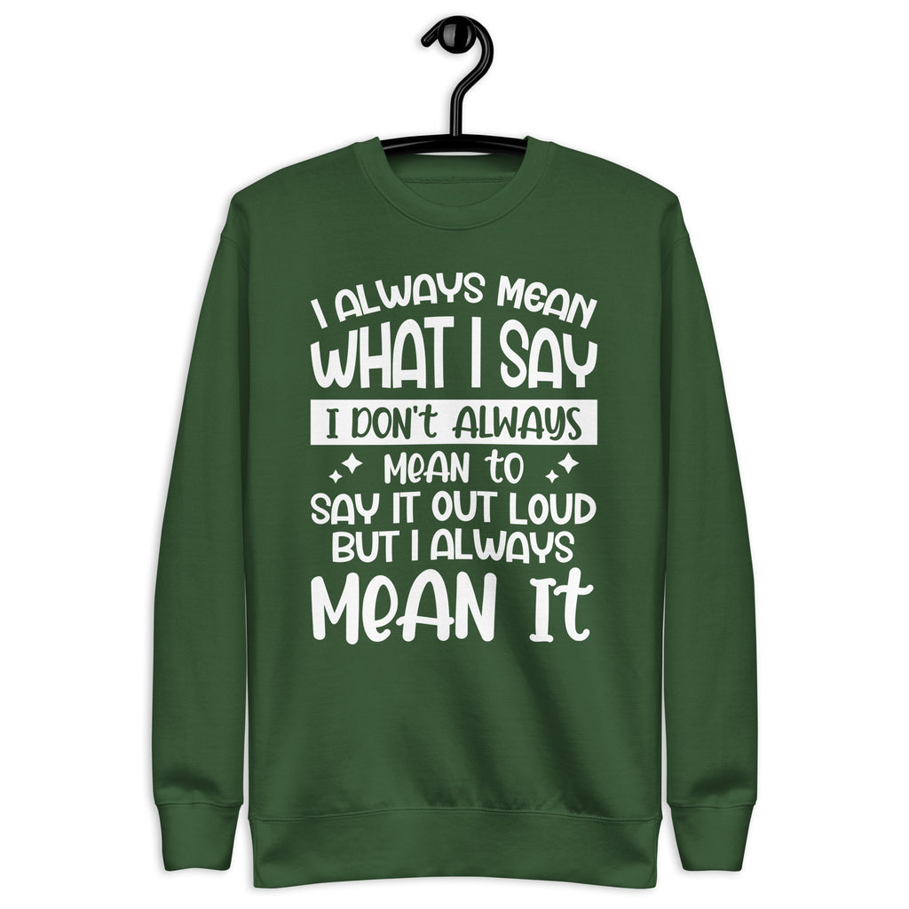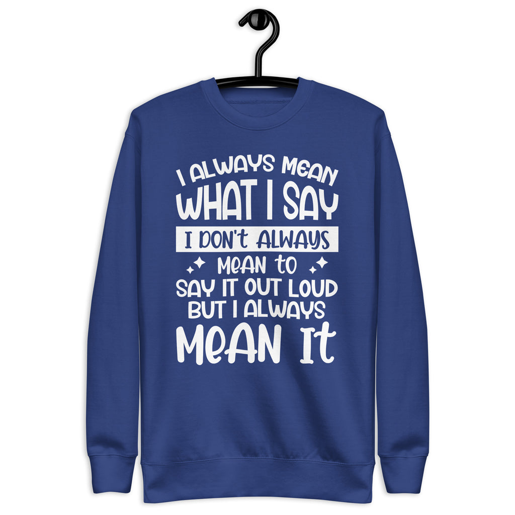 Own your honesty (and your lack of filter) with the “I Always Mean What I Say — I Don’t Always Mean to Say It Out Loud, But I Always Mean It” sweatshirt. Perfect for anyone who speaks their mind before thinking twice, this cozy favorite captures the perfect mix of truth, humor, and a little bit of trouble.