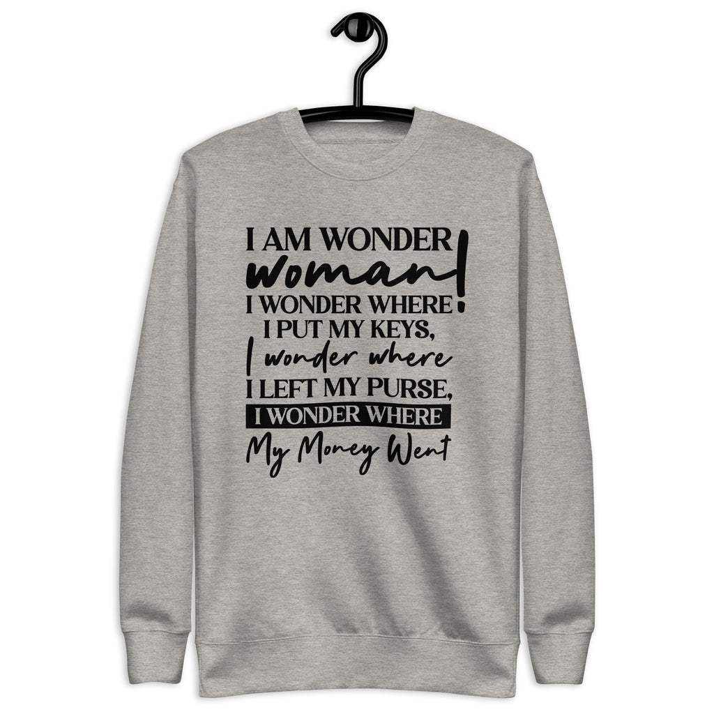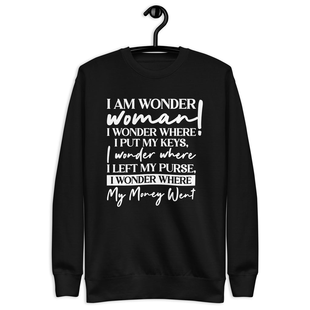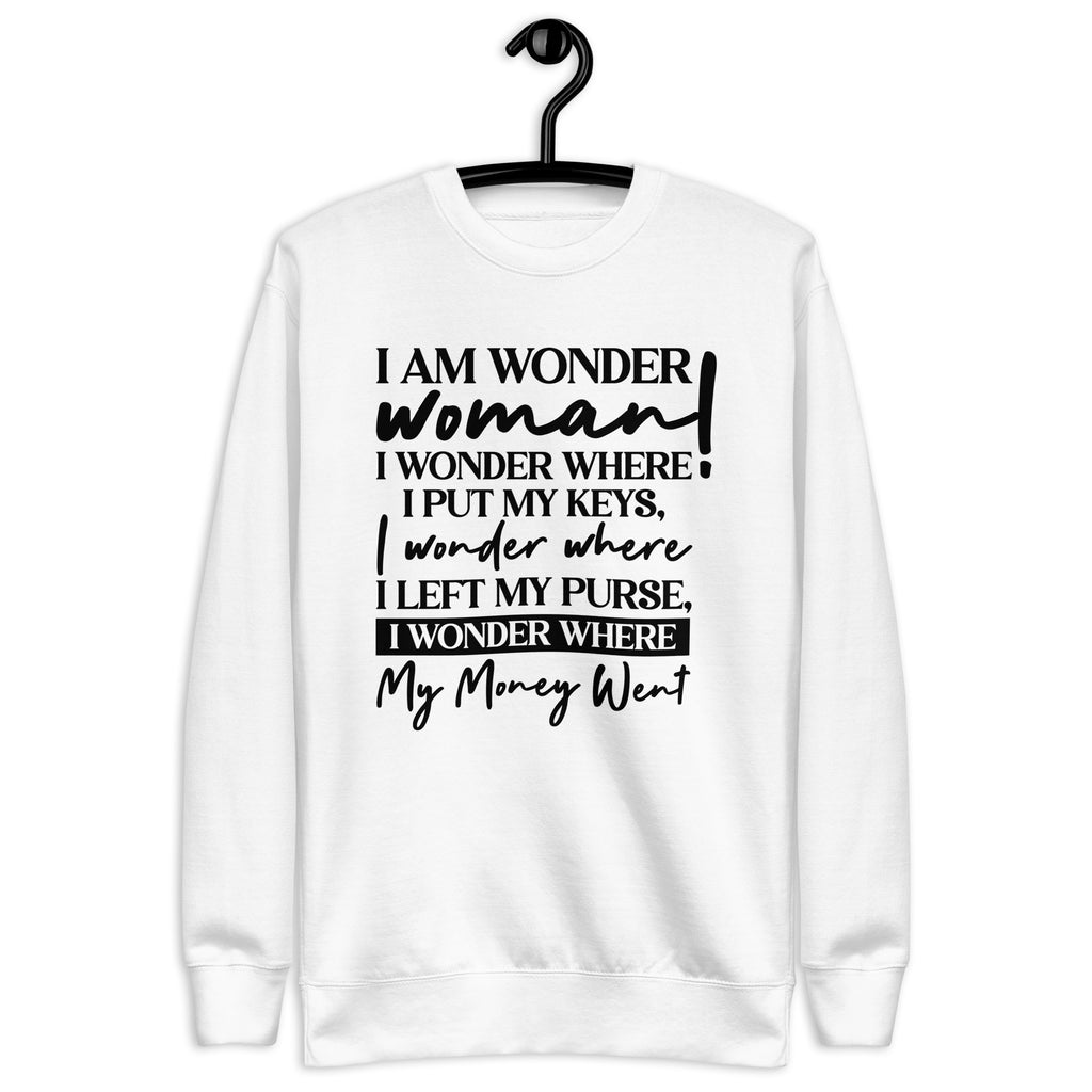 Unleash your inner hero with a dose of everyday humor in the “I Am a Wonder Woman— I Wonder Where I Put My Keys, I Wonder Where I Left My Purse, I Wonder Where My Money Went” sweatshirt. This cozy piece is perfect for every multitasking woman who does it all but still can’t remember where she set things down five minutes ago. Relatable? Absolutely. Stylish? Even more so.
