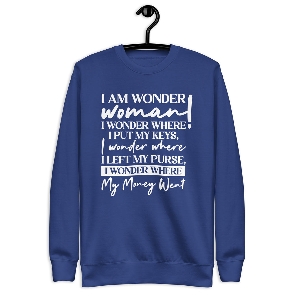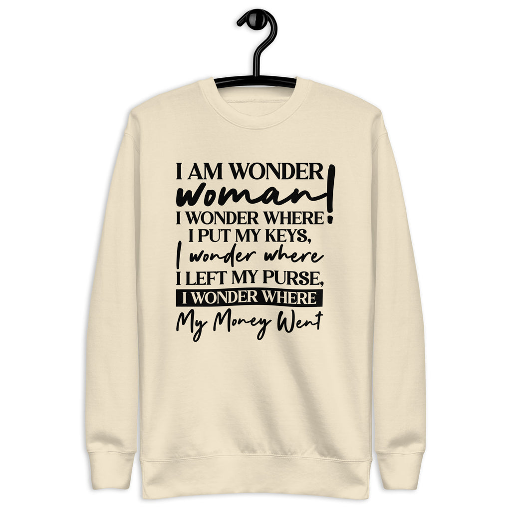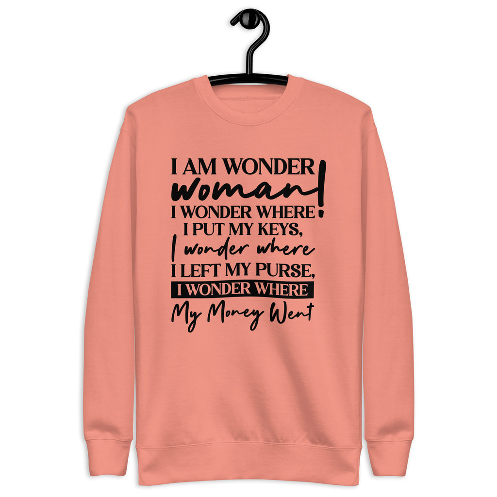 Unleash your inner hero with a dose of everyday humor in the “I Am a Wonder Woman— I Wonder Where I Put My Keys, I Wonder Where I Left My Purse, I Wonder Where My Money Went” sweatshirt. This cozy piece is perfect for every multitasking woman who does it all but still can’t remember where she set things down five minutes ago. Relatable? Absolutely. Stylish? Even more so.