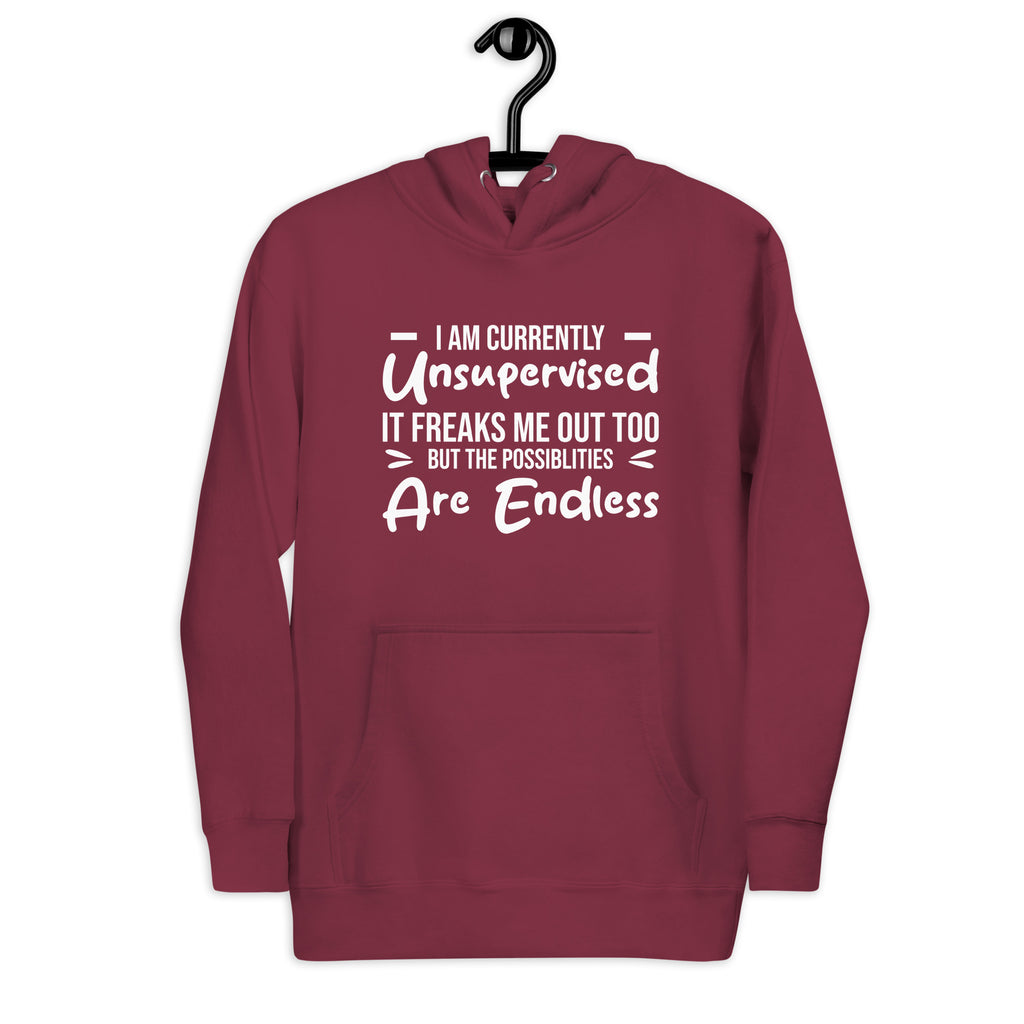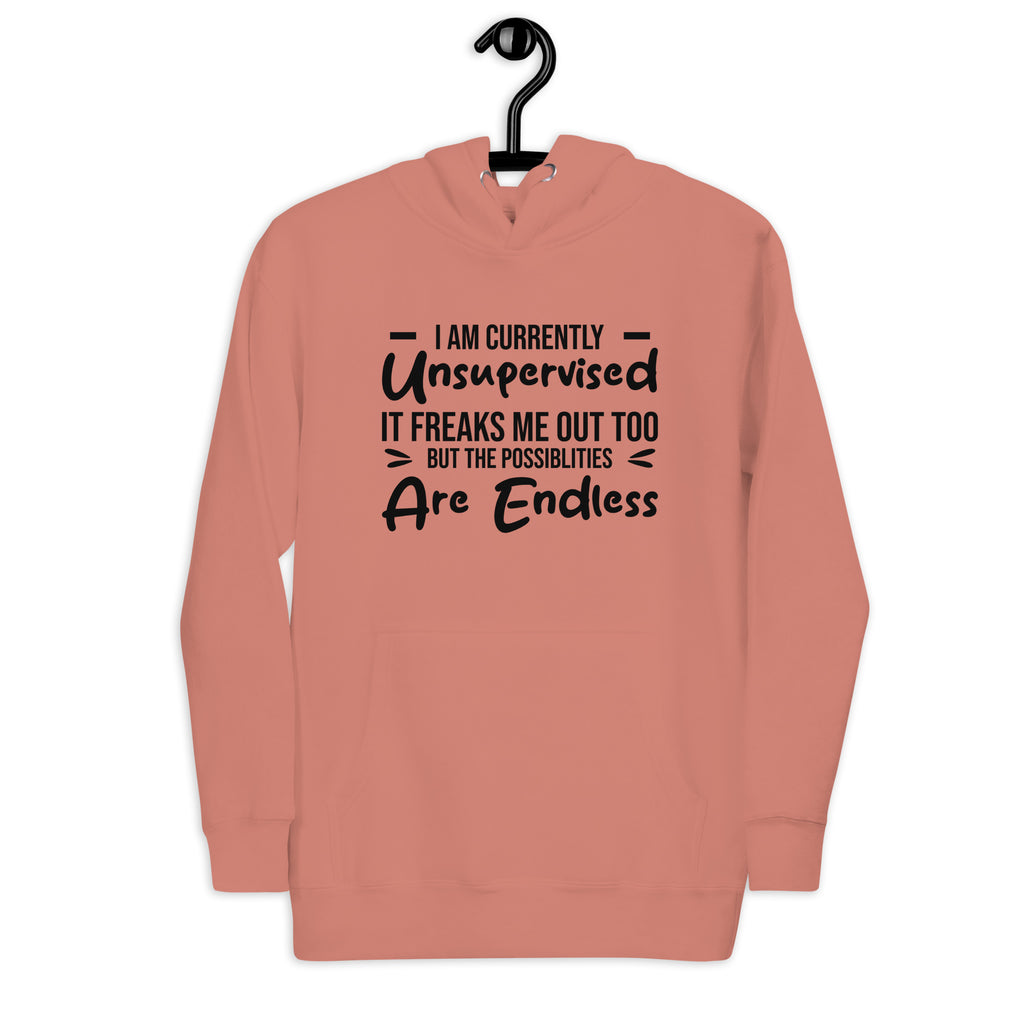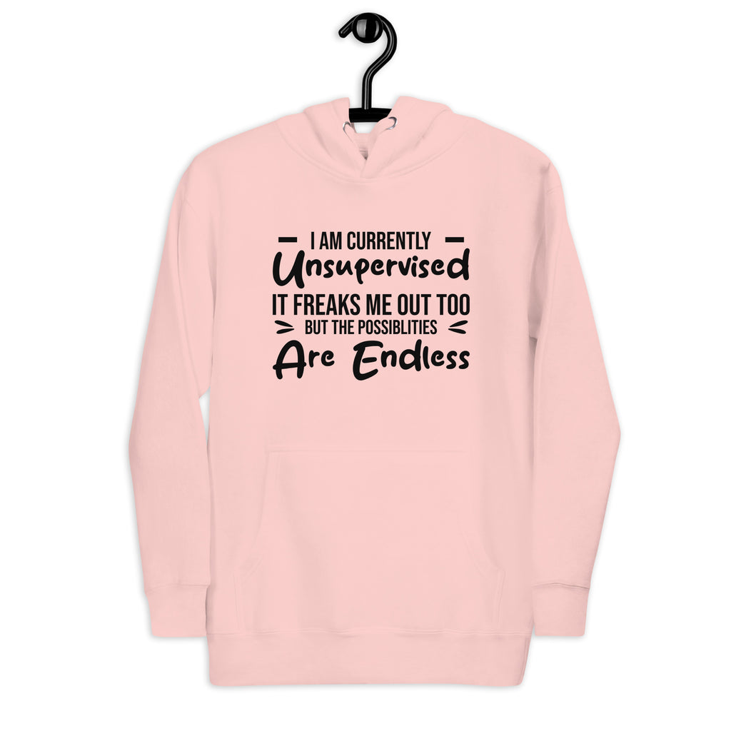 This “I Am Currently Unsupervised — It Freaks Me Out Too, But the Possibilities Are Endless” hoodie is pure chaotic energy in cozy form. Perfect for the mischief-makers, rule-benders, and creative souls who know that being left alone is both a risk and an adventure.