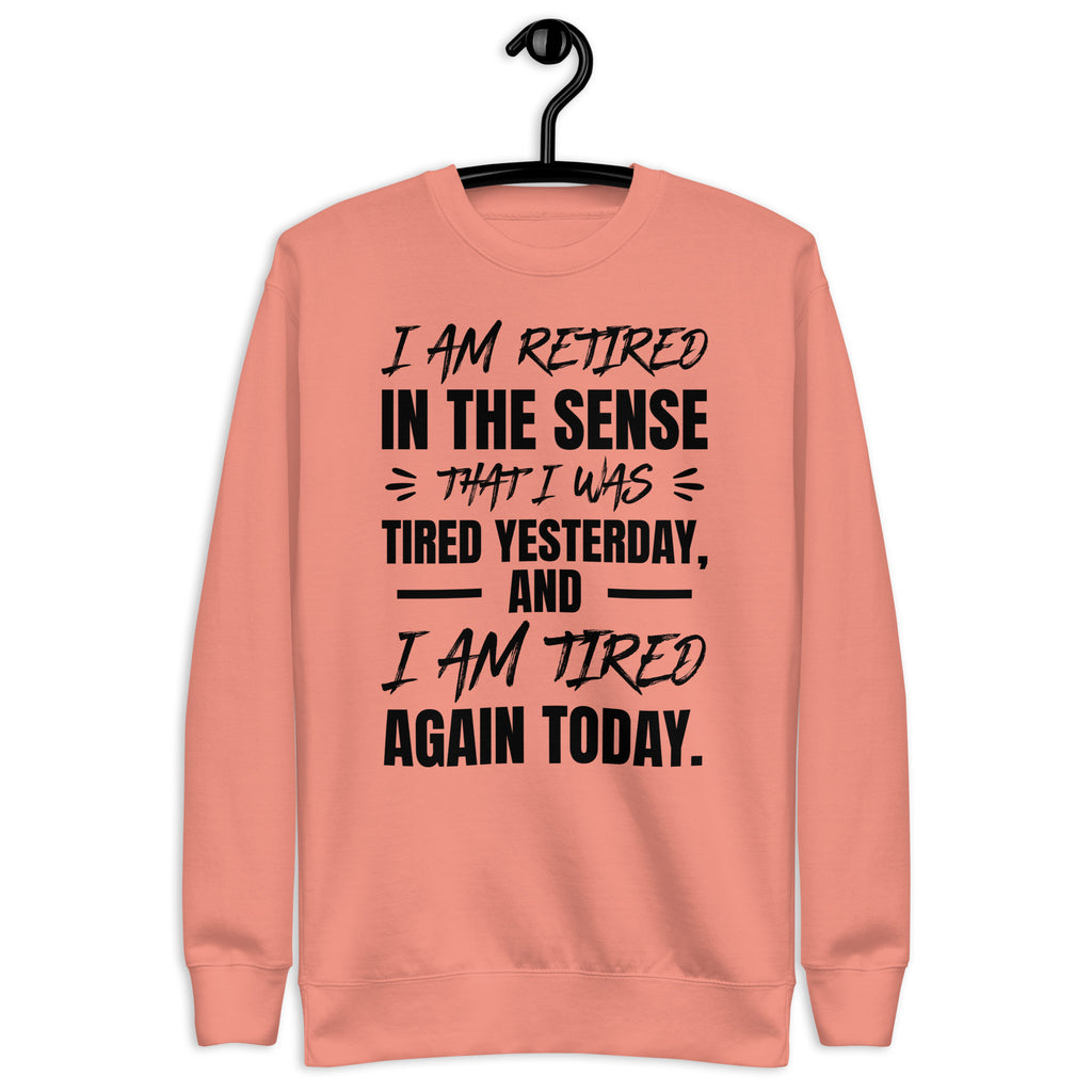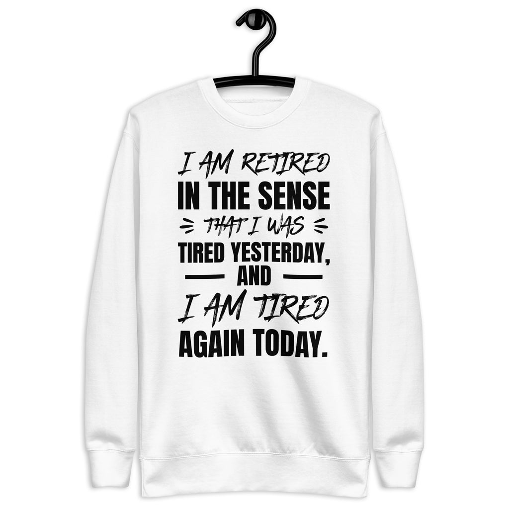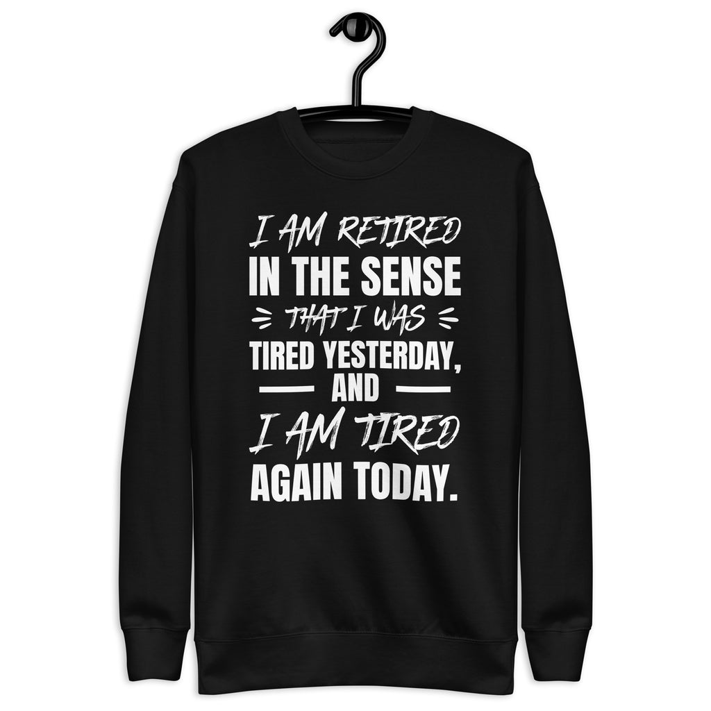Show off your sense of humor (and your endless exhaustion) with the “I Am Retired in a Sense That I Was Tired Yesterday and I Am Tired Again Today” sweatshirt. Perfect for anyone who runs on sarcasm, coffee, and naps, this cozy piece is the ultimate way to embrace your tired-but-still-going attitude.