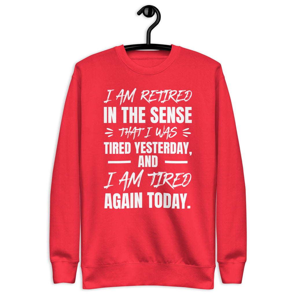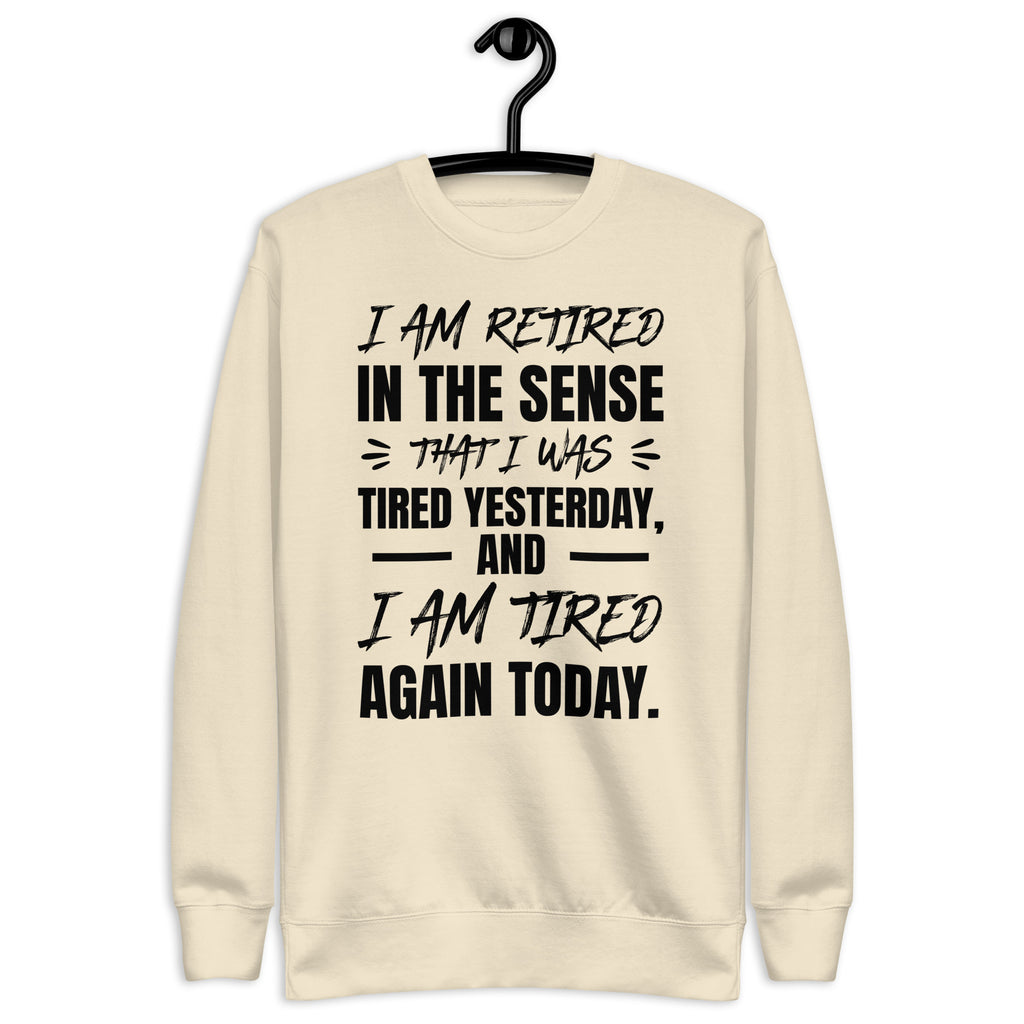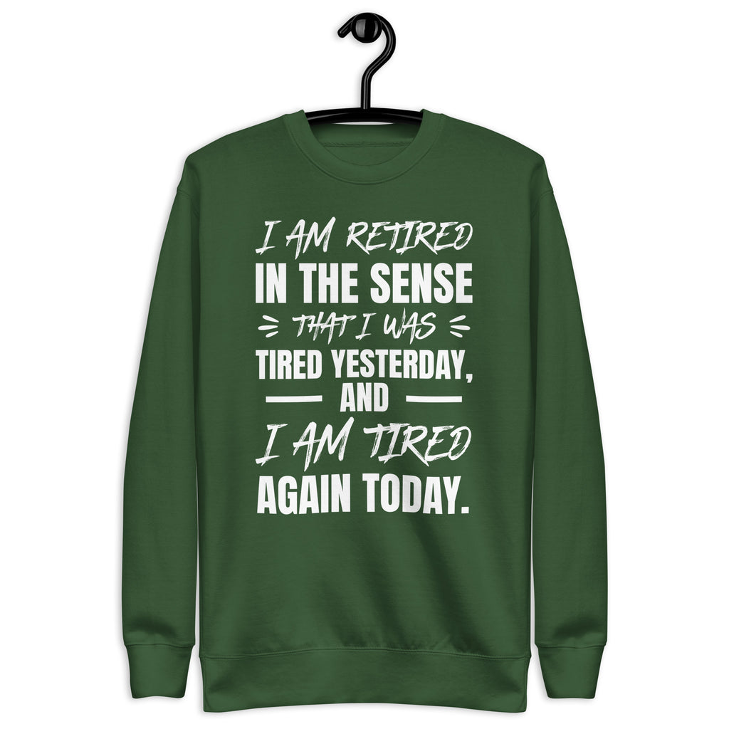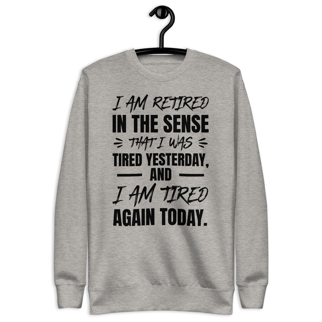 Show off your sense of humor (and your endless exhaustion) with the “I Am Retired in a Sense That I Was Tired Yesterday and I Am Tired Again Today” sweatshirt. Perfect for anyone who runs on sarcasm, coffee, and naps, this cozy piece is the ultimate way to embrace your tired-but-still-going attitude.