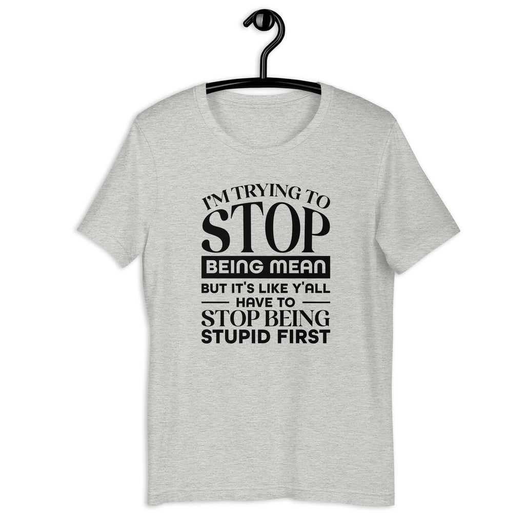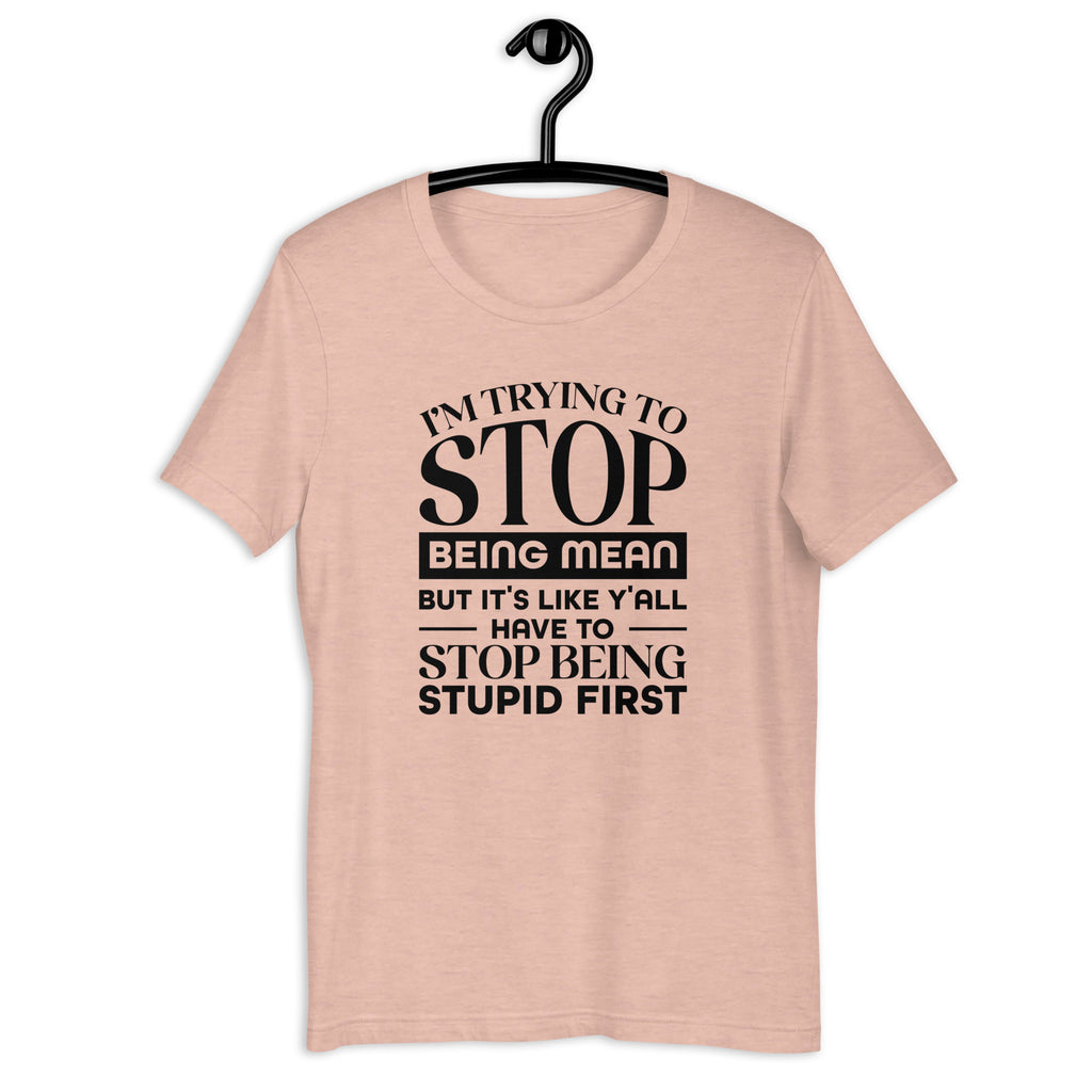 It’s not me, it’s you. This “I Am Trying to Stop Being Mean, But It’s Like Y’all Have to Stop Being Stupid First” t-shirt is the perfect mix of savage humor and everyday truth.