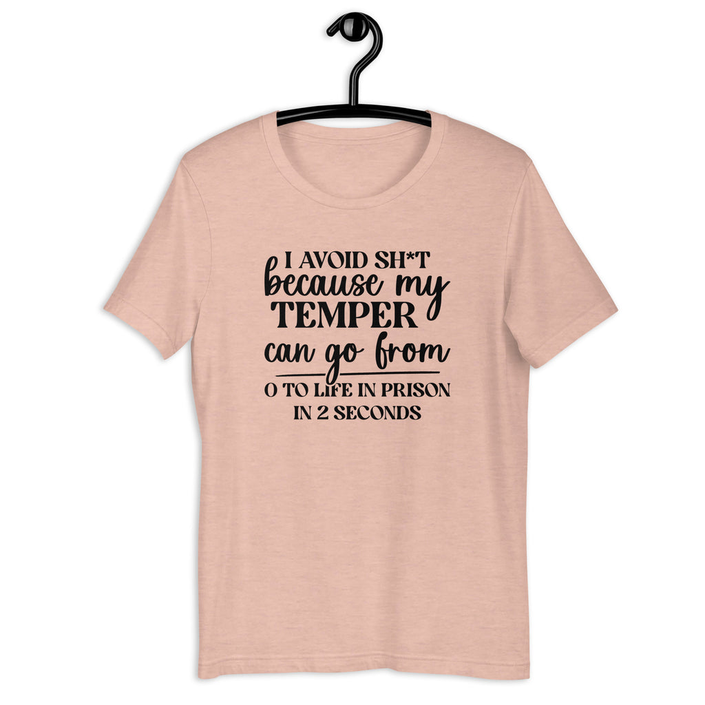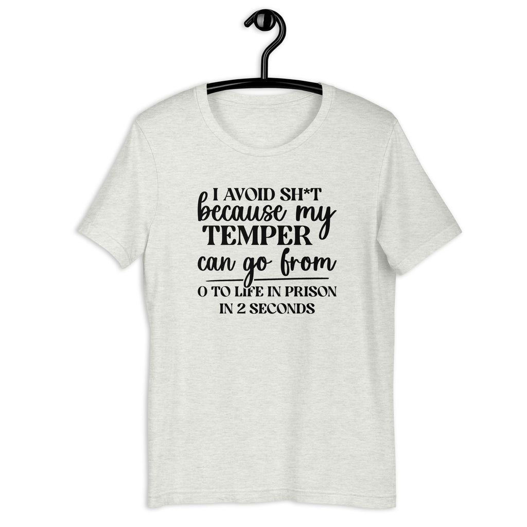 Some things are better left avoided—like testing your patience. The “I Avoid Shit Because My Temper Can Go From 0 To Life In Prison In 2 Seconds” t-shirt says it all with dark humor and unapologetic honesty.