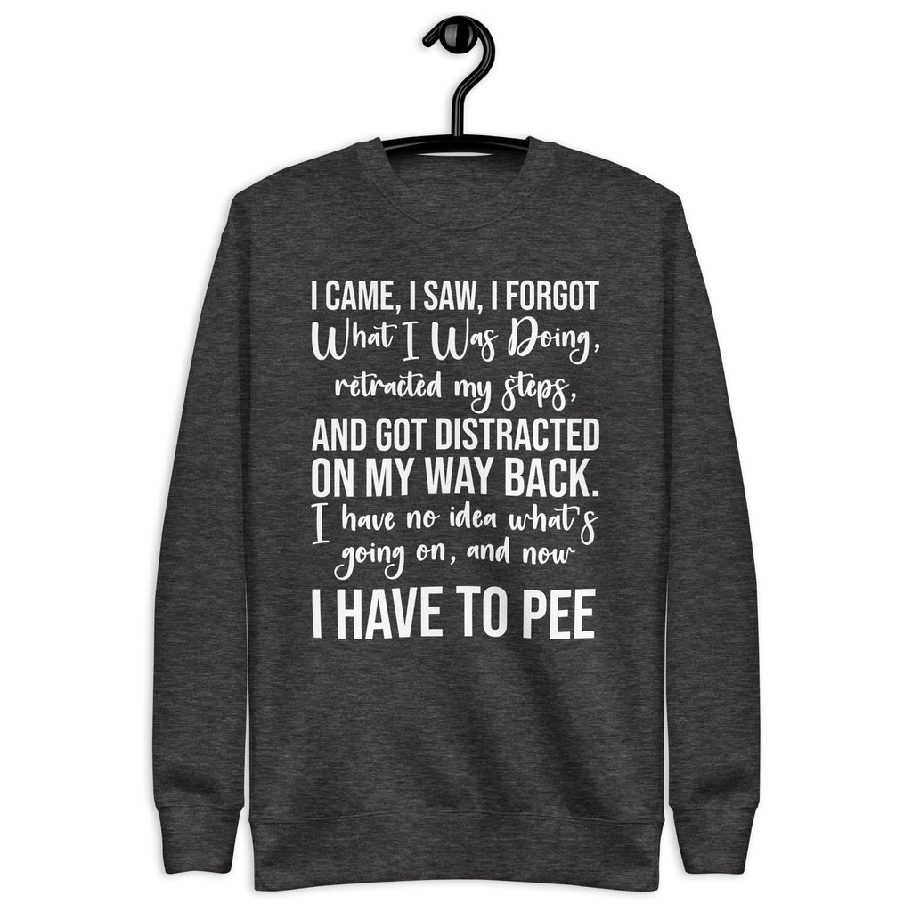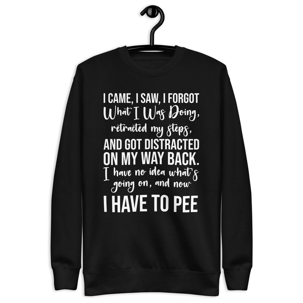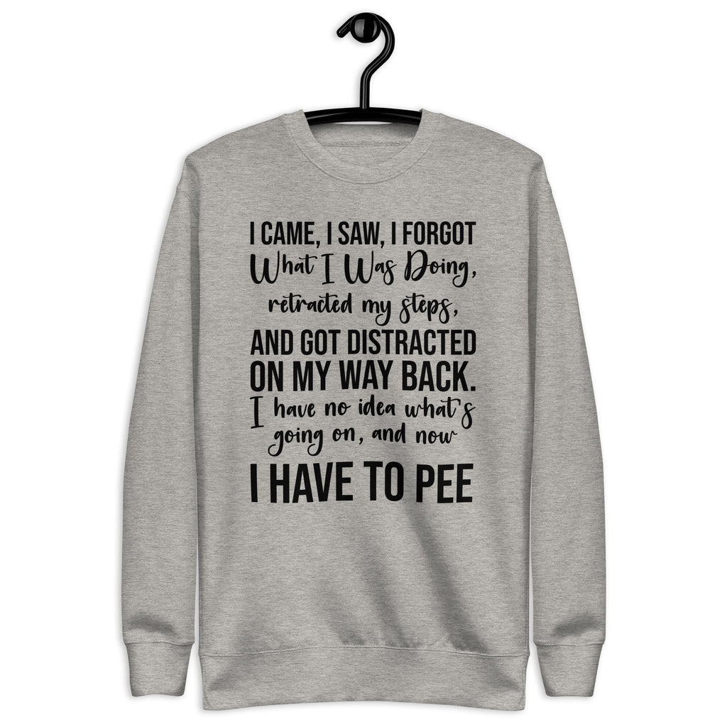 Bring some hilarious honesty to your wardrobe with the “I Came, I Saw, I Forgot What I Was Doing, Retraced My Steps, Got Distracted on My Way Back, Have No Idea What’s Going On, and Now I Have to Pee” sweatshirt. Perfect for anyone whose brain runs on chaos and caffeine, this design captures the everyday struggle of trying to stay focused — and failing spectacularly.