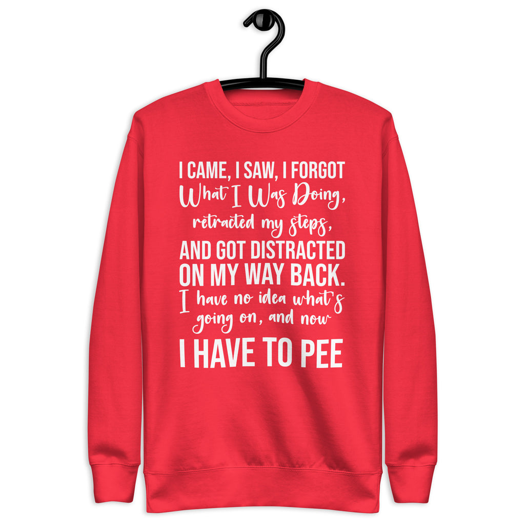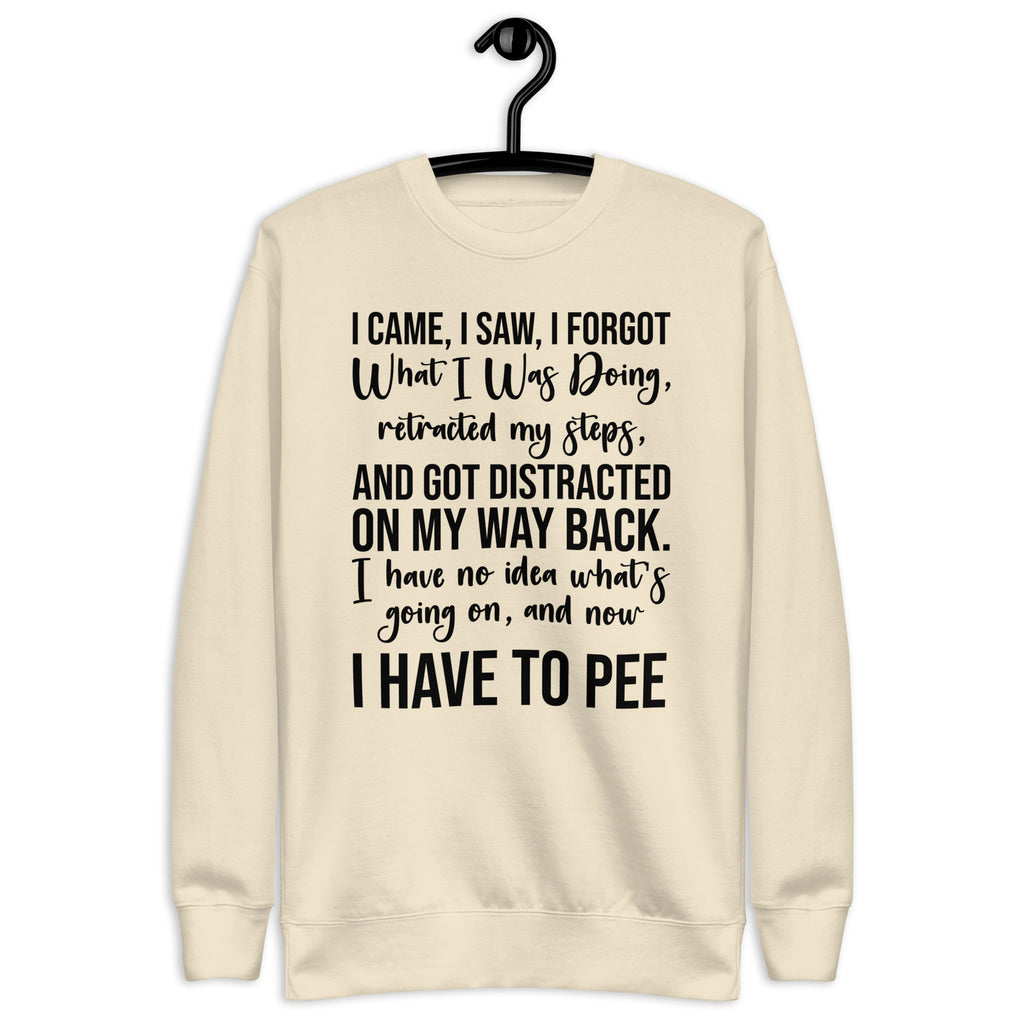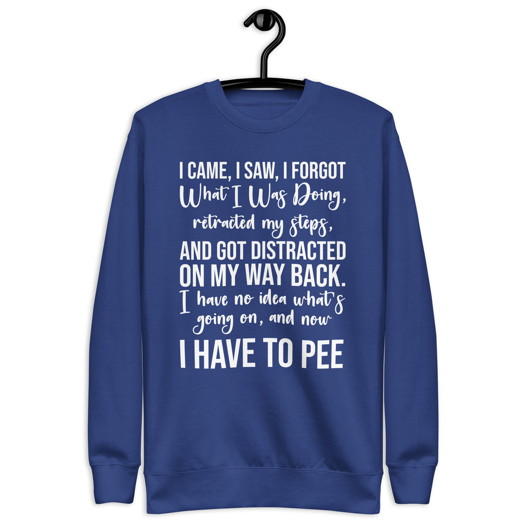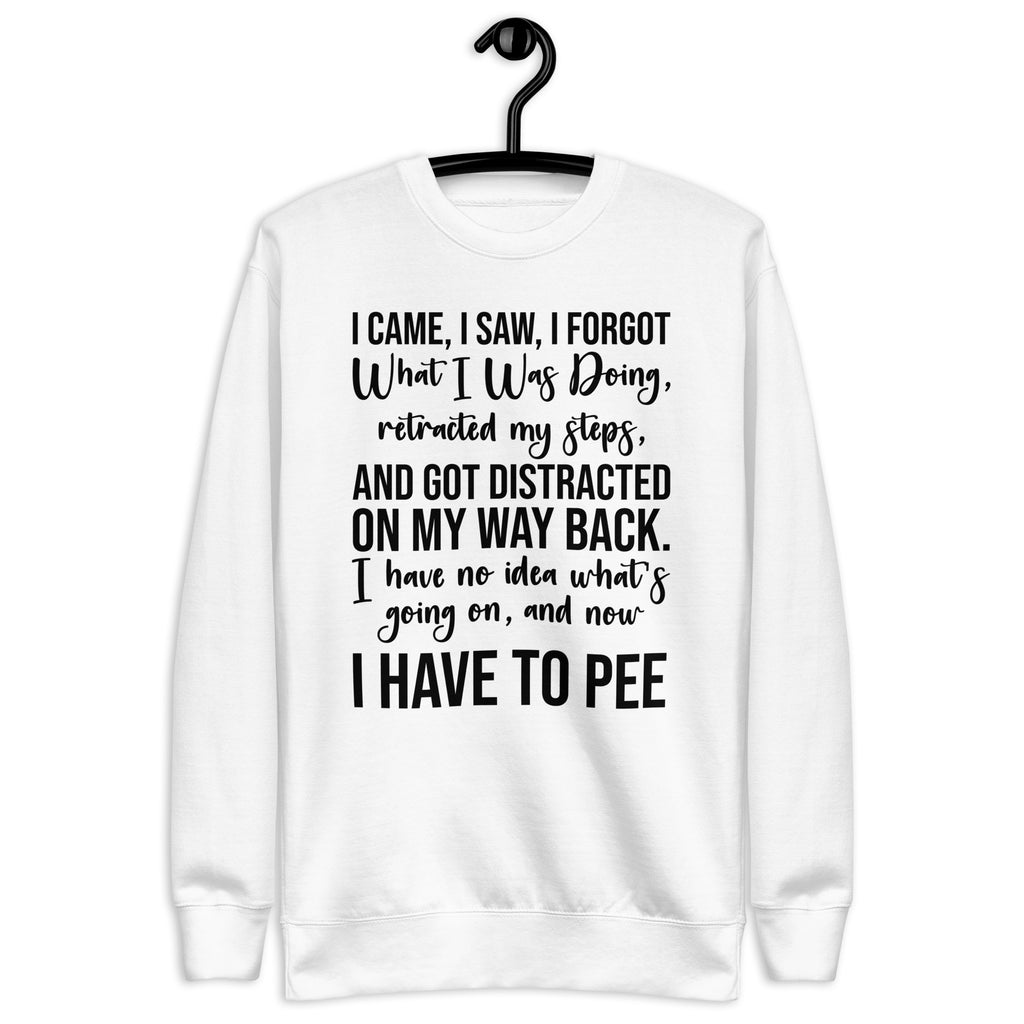Bring some hilarious honesty to your wardrobe with the “I Came, I Saw, I Forgot What I Was Doing, Retraced My Steps, Got Distracted on My Way Back, Have No Idea What’s Going On, and Now I Have to Pee” sweatshirt. Perfect for anyone whose brain runs on chaos and caffeine, this design captures the everyday struggle of trying to stay focused — and failing spectacularly.
