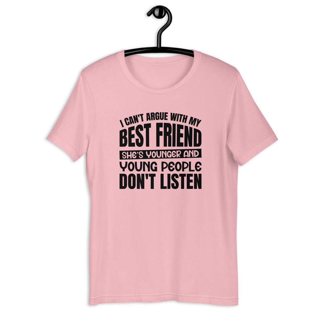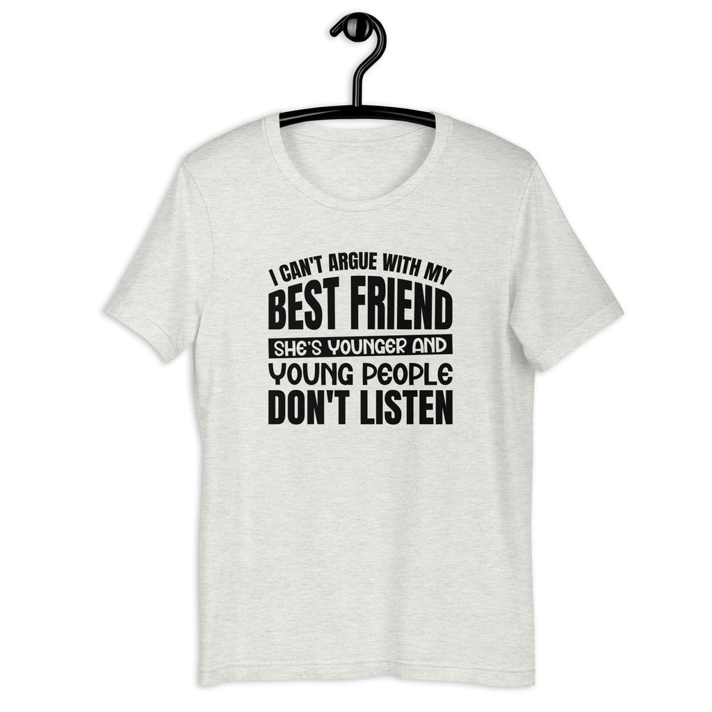 Keep friendship funny with the “I Can’t Argue With My Best Friend She’s Younger Than Me and Young People Don’t Listen” t-shirt. Perfect for besties who love to joke about their age gap, this tee is all about mixing humor with the bond that makes your friendship unshakable (even when you can’t win the argument).