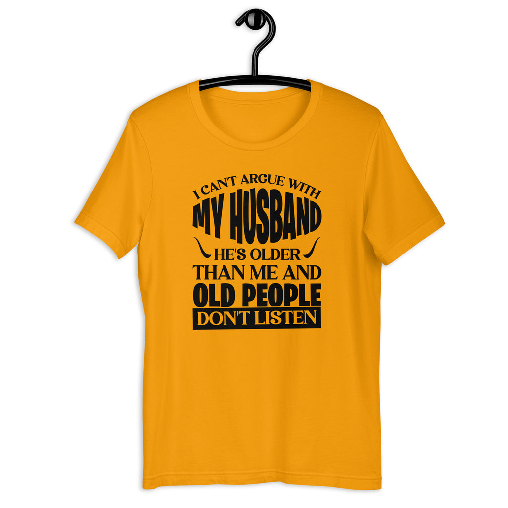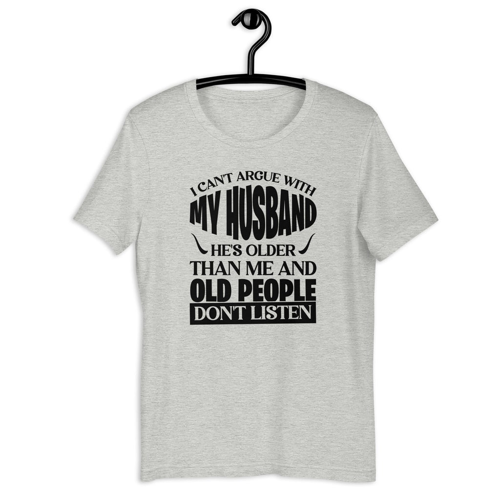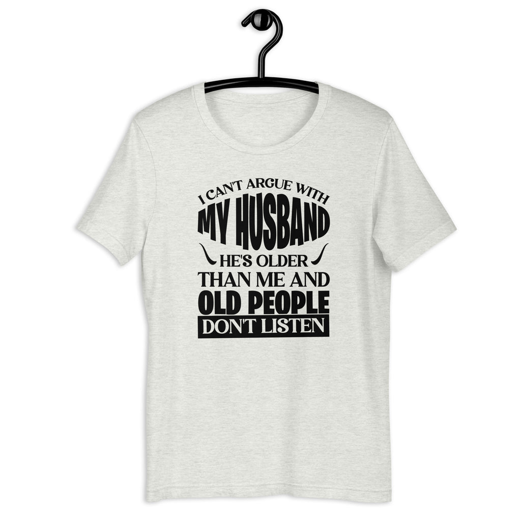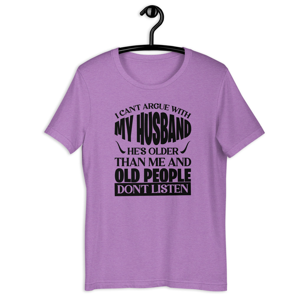 Marriage rule #1: don’t bother arguing with old people. The “I Can’t Argue with My Husband, He’s Older Than Me and Old People Don’t Listen” t-shirt delivers laughs with a side of truth. Perfect for wives who’ve mastered the art of picking their battles (or just stopped picking them altogether), this tee is witty, relatable, and guaranteed to get a chuckle.
