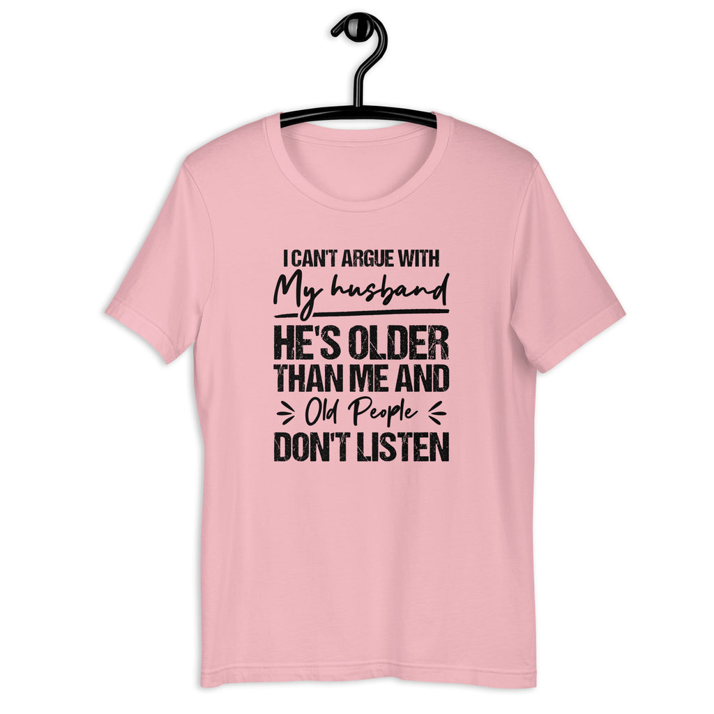 Bring the laughs with the “I Can’t Argue with My Husband, He’s Older Than Me and Old People Don’t Listen” t-shirt — the perfect blend of sass and humor for wives who know exactly how marriage works. With its witty and playful design, this tee is guaranteed to get smiles from friends, family, and anyone who’s been in a long-term relationship.