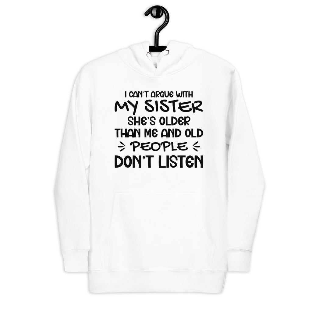 Stay cozy while keeping it real with the “I Can’t Argue With My Sister, She Is Older Than Me and Old People Don’t Listen” hoodie. Perfect for anyone with a sibling dynamic full of sass, this hoodie combines humor, comfort, and family truth all in one.