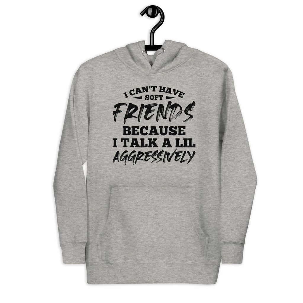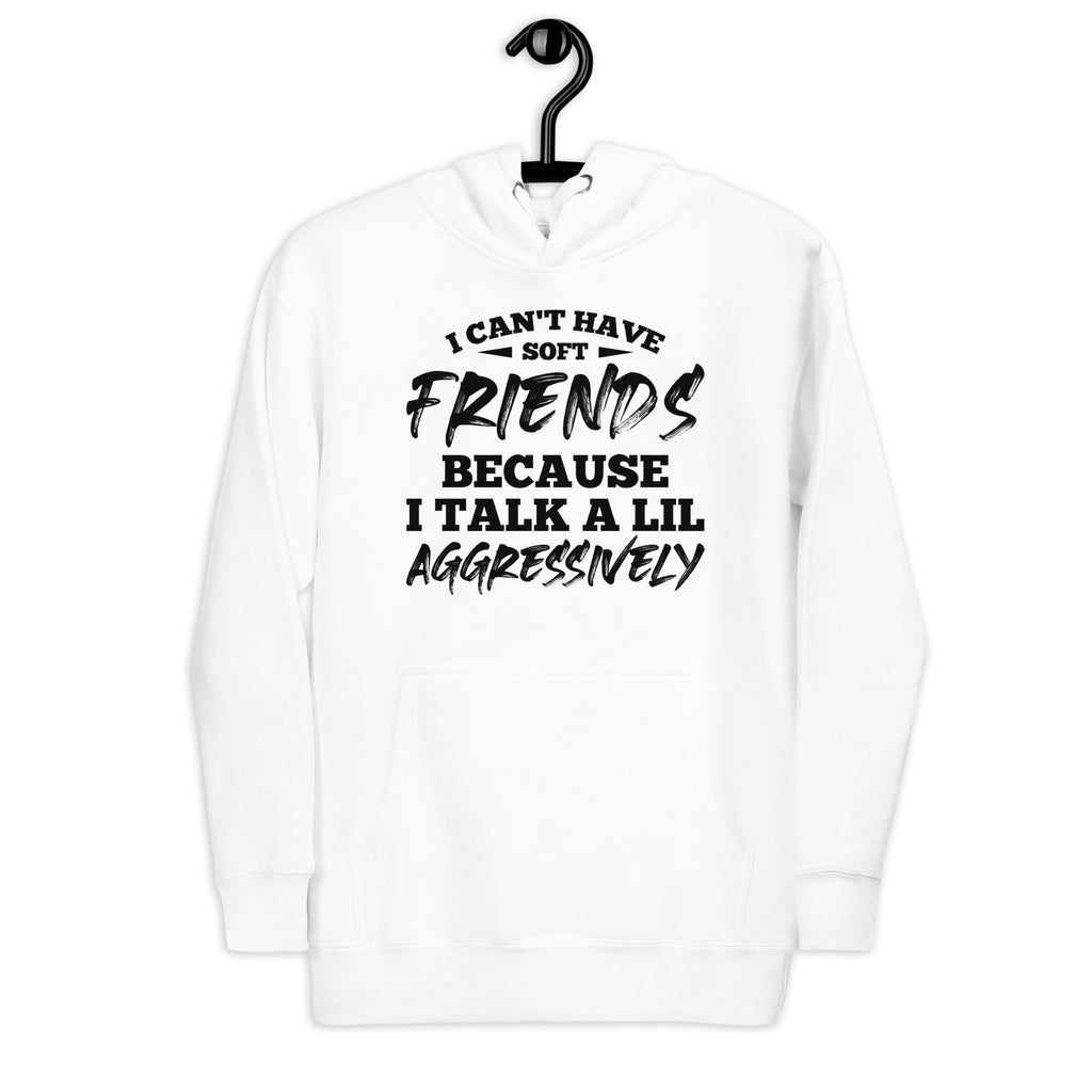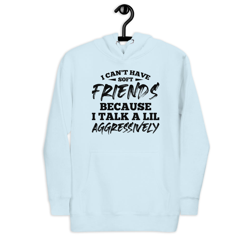 Keep it real with the “I Can’t Have Soft Friends Because I Talk a Lil Aggressively” hoodie. Perfect for anyone whose blunt honesty comes with a sharp delivery, this hoodie blends comfort with unapologetic attitude.