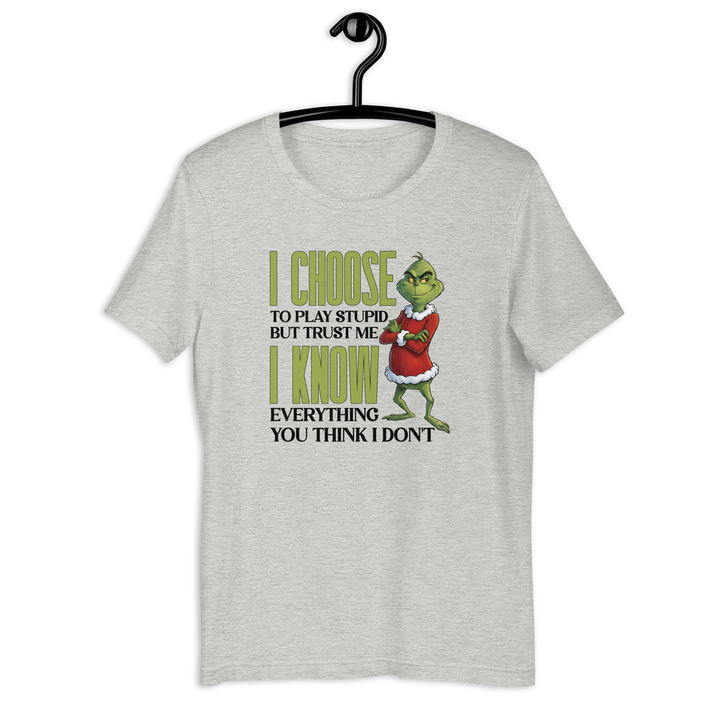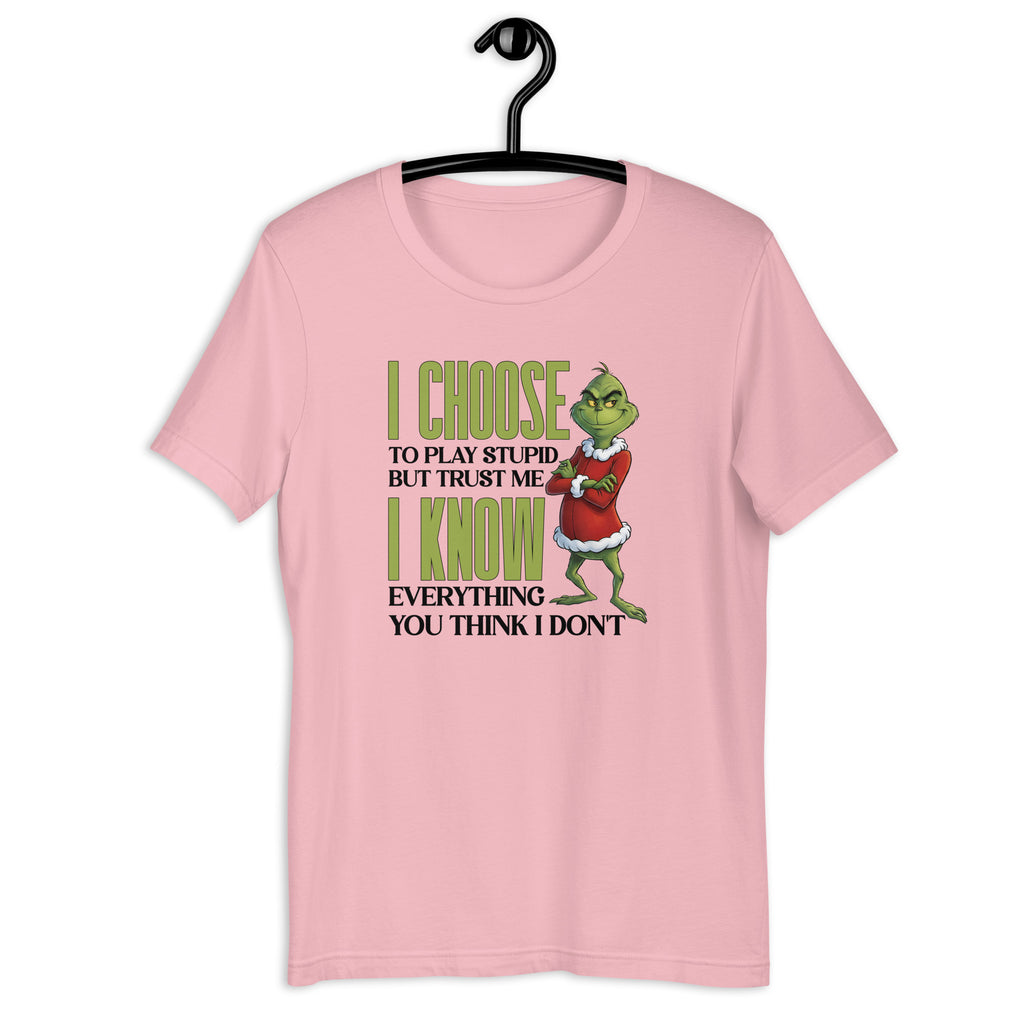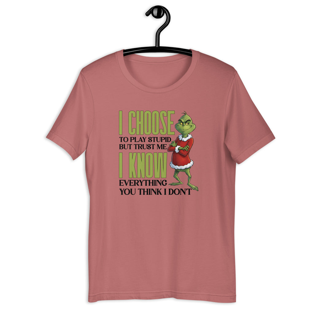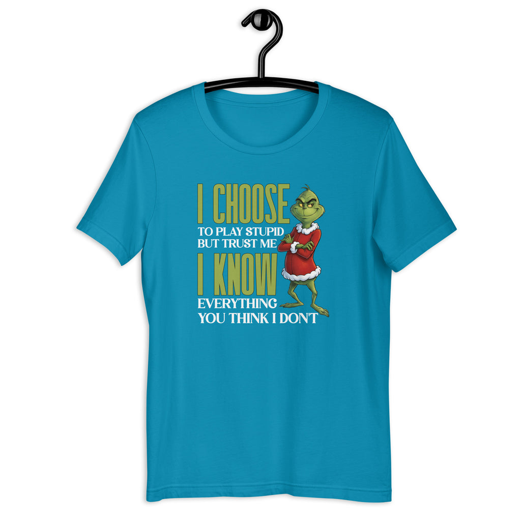 Own your sly, clever side with the “I Choose to Play Stupid, But Trust Me, I Know Everything You Think I Don’t” T-shirt. Perfect for those who love to keep people guessing, this tee celebrates the art of knowing more than you let on—and enjoying every moment of it.