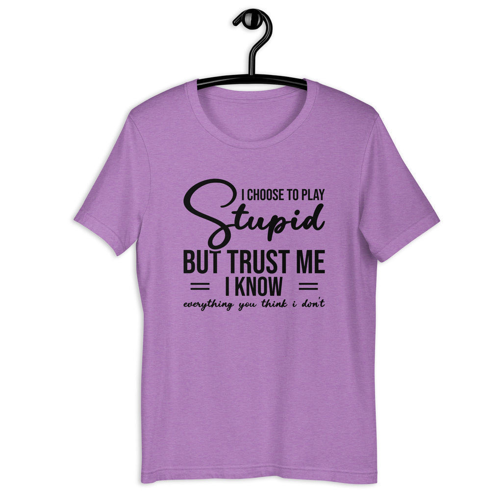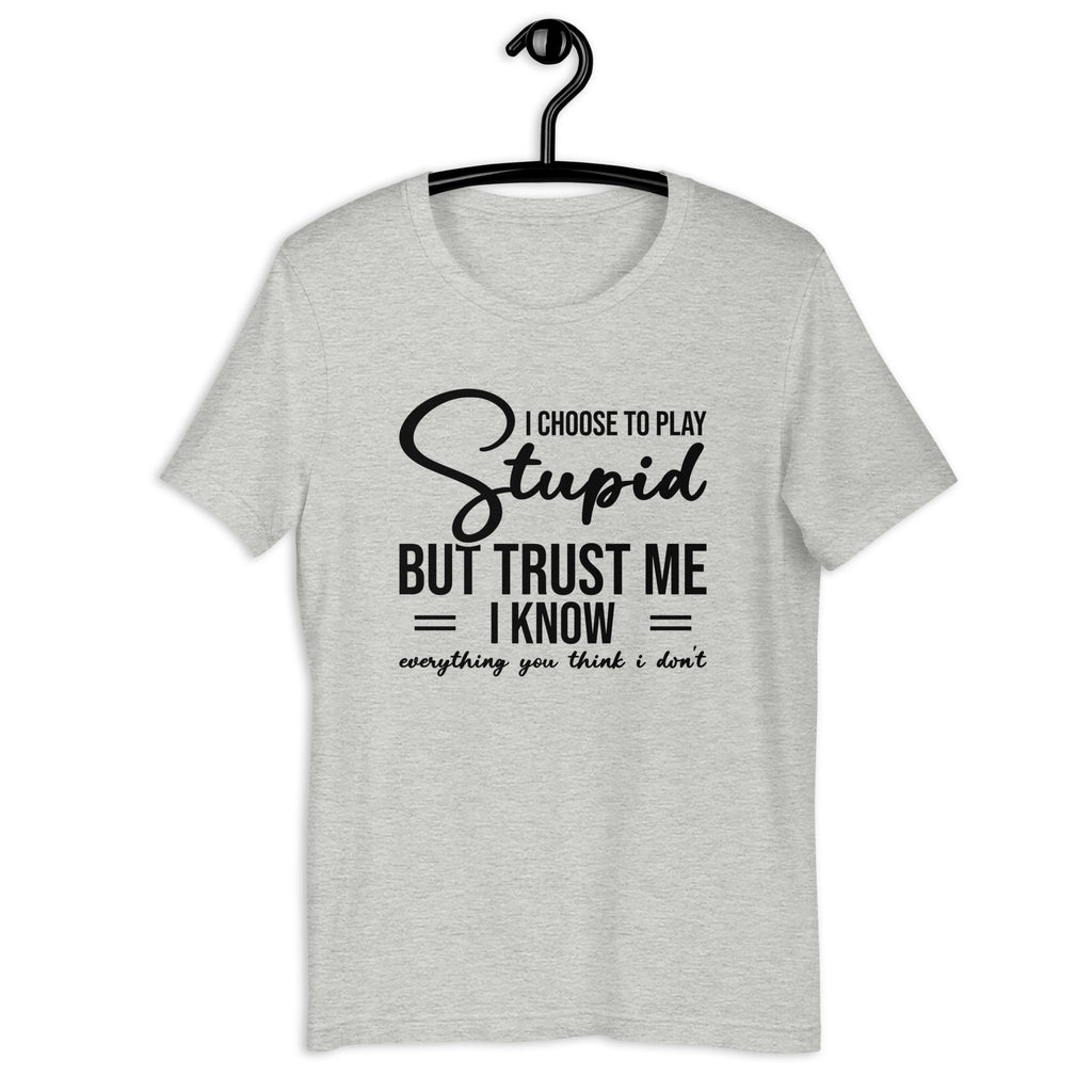 Clever, confident, and quietly powerful. The “I Choose to Play Stupid… But Trust Me, I Know Everything You Think I Don’t” t-shirt is made for those who observe more than they speak. It’s a bold reminder that silence is often strategy—and intelligence doesn’t need to announce itself.
