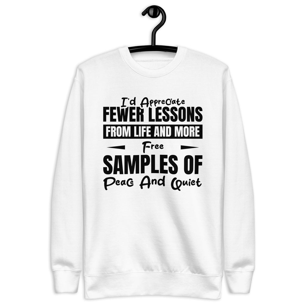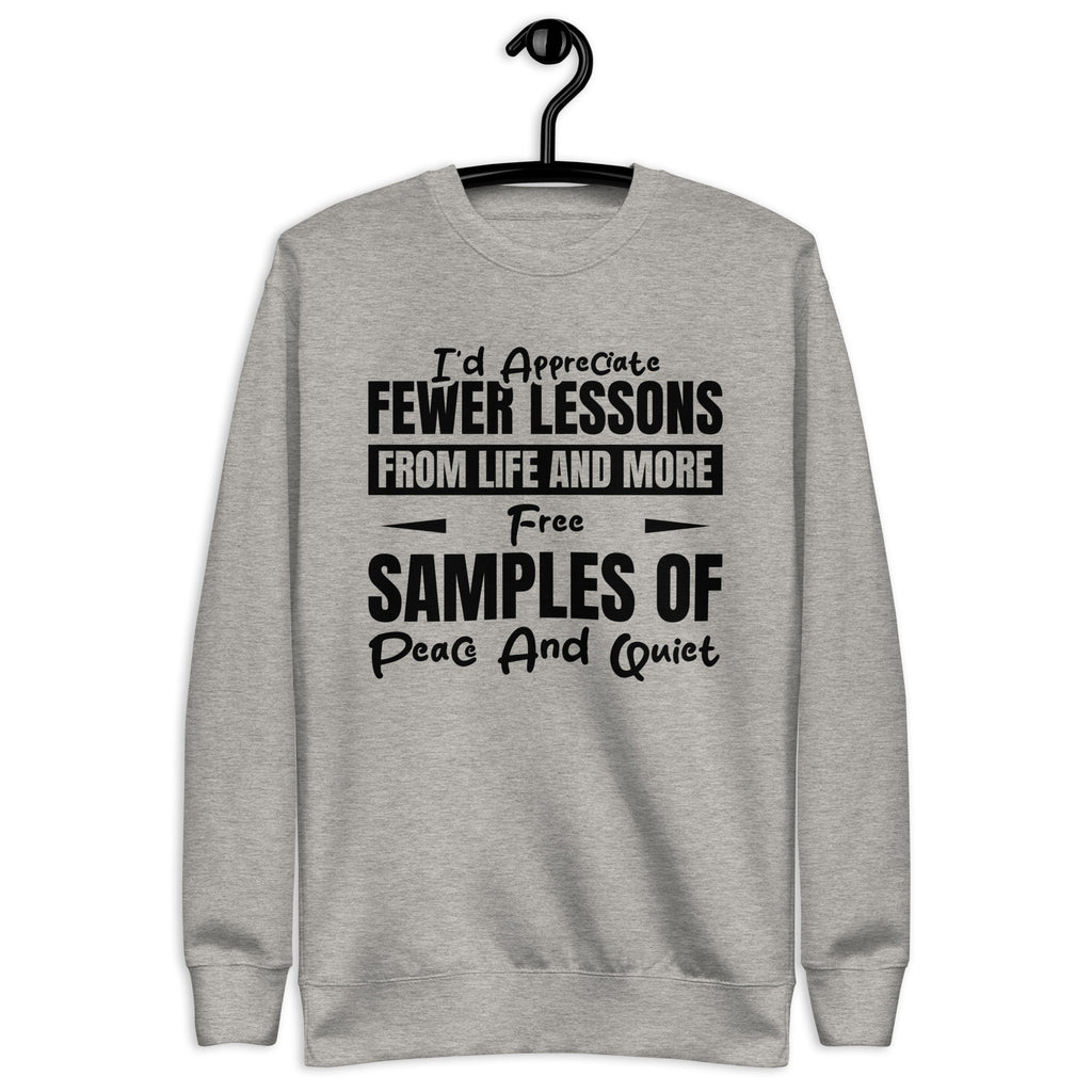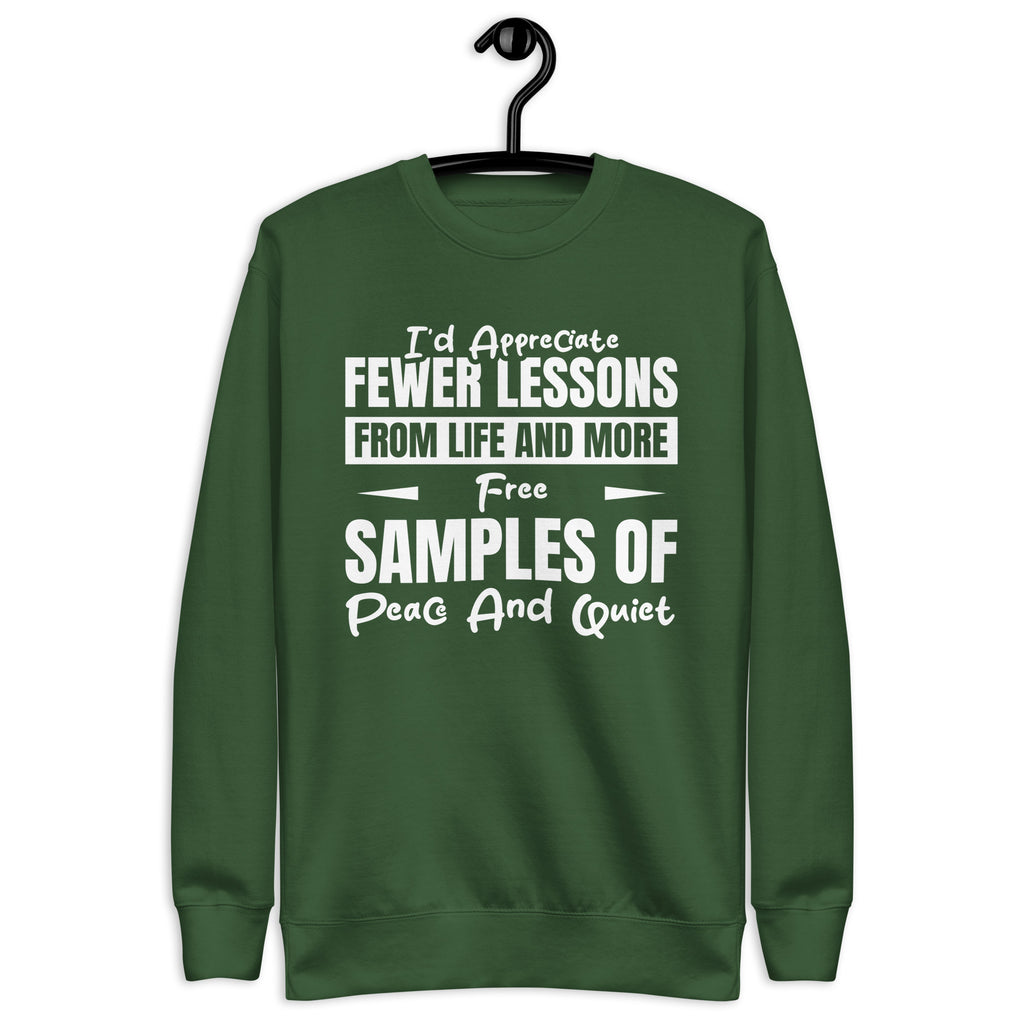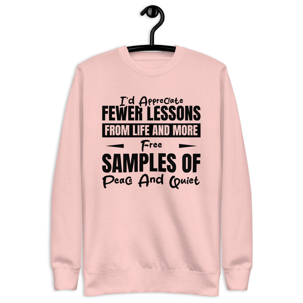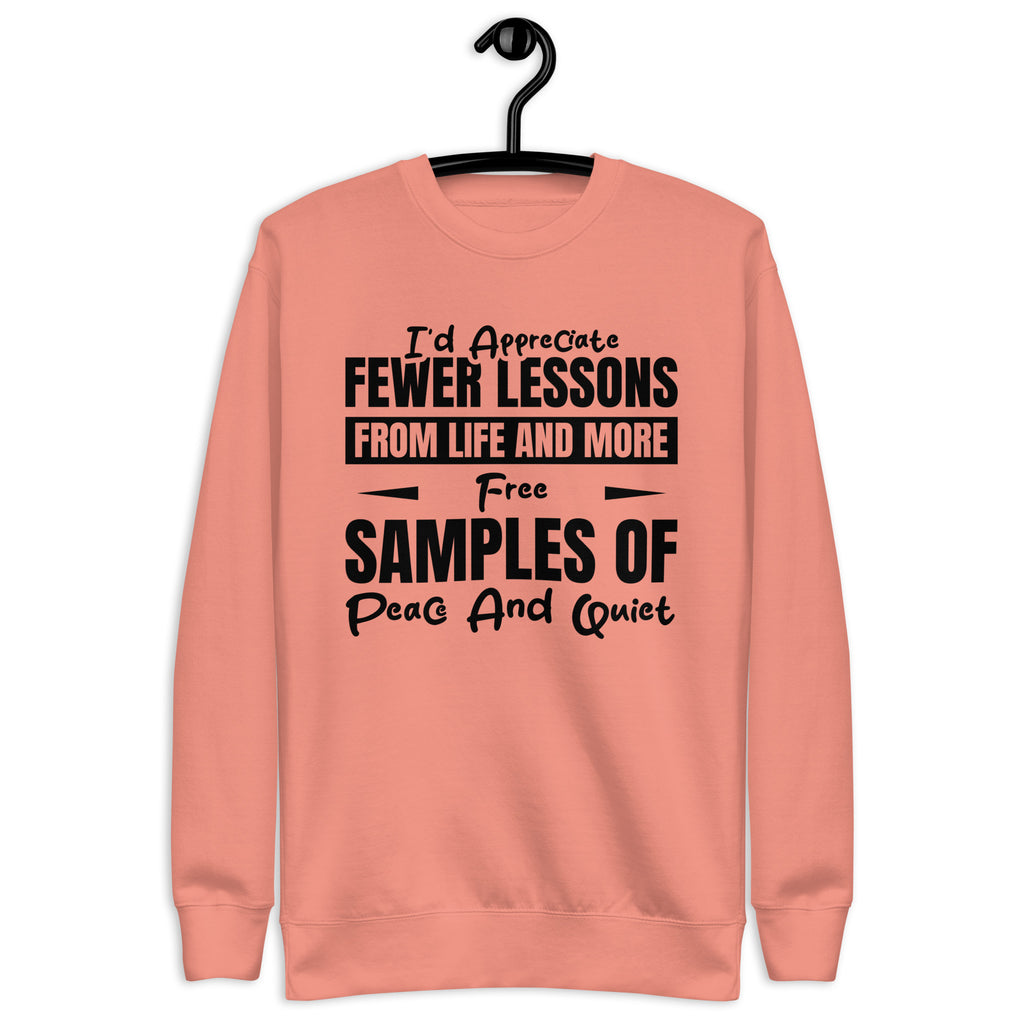 Tired, wise, and craving a little calm — this “I’d Appreciate Fewer Lessons From Life and More Free Samples of Peace and Quiet” sweatshirt speaks for anyone who’s done enough character development for one lifetime. You’re not ungrateful — you’re just ready for a break that doesn’t come with a plot twist.