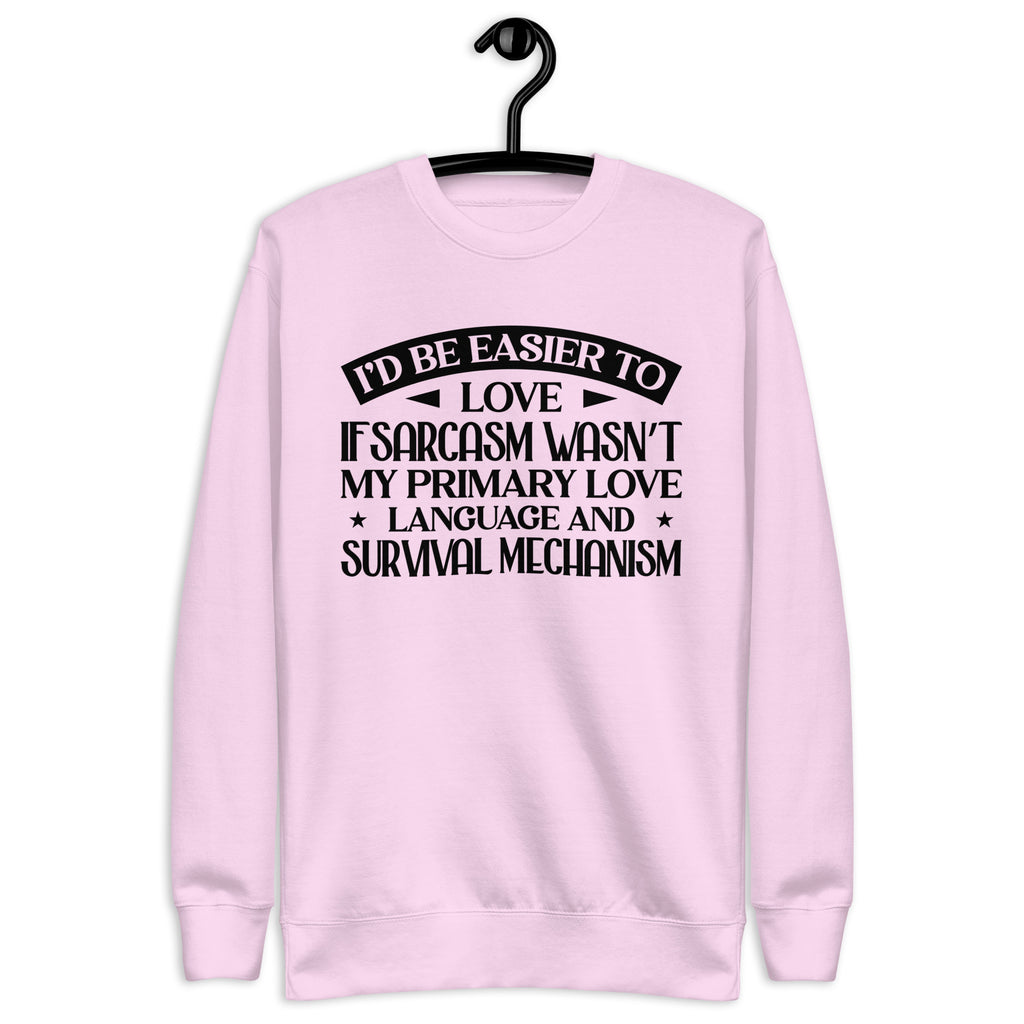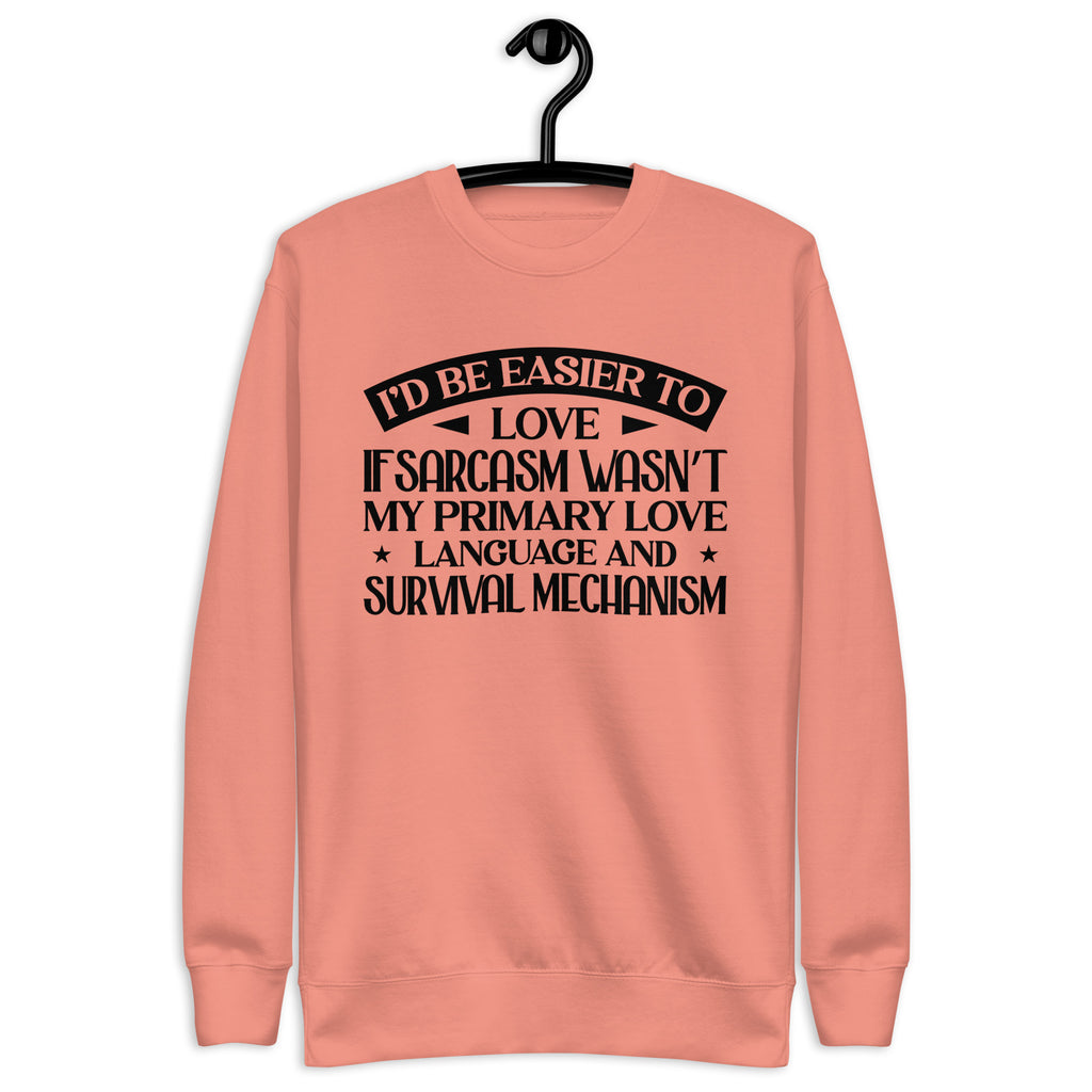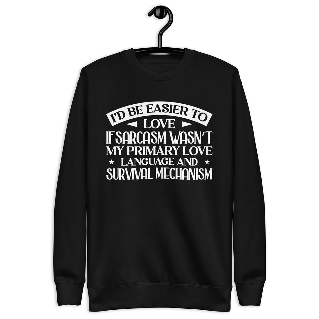 Playful, self-aware, and delightfully sharp — this “I’d Be Easier to Love If Sarcasm Wasn’t My Primary Love Language and Survival Mechanism” sweatshirt is made for anyone who communicates in wit, humor, and a little emotionally-charged honesty. You’re not difficult — you just express affection with a twist, a smirk, and a perfectly timed comeback.