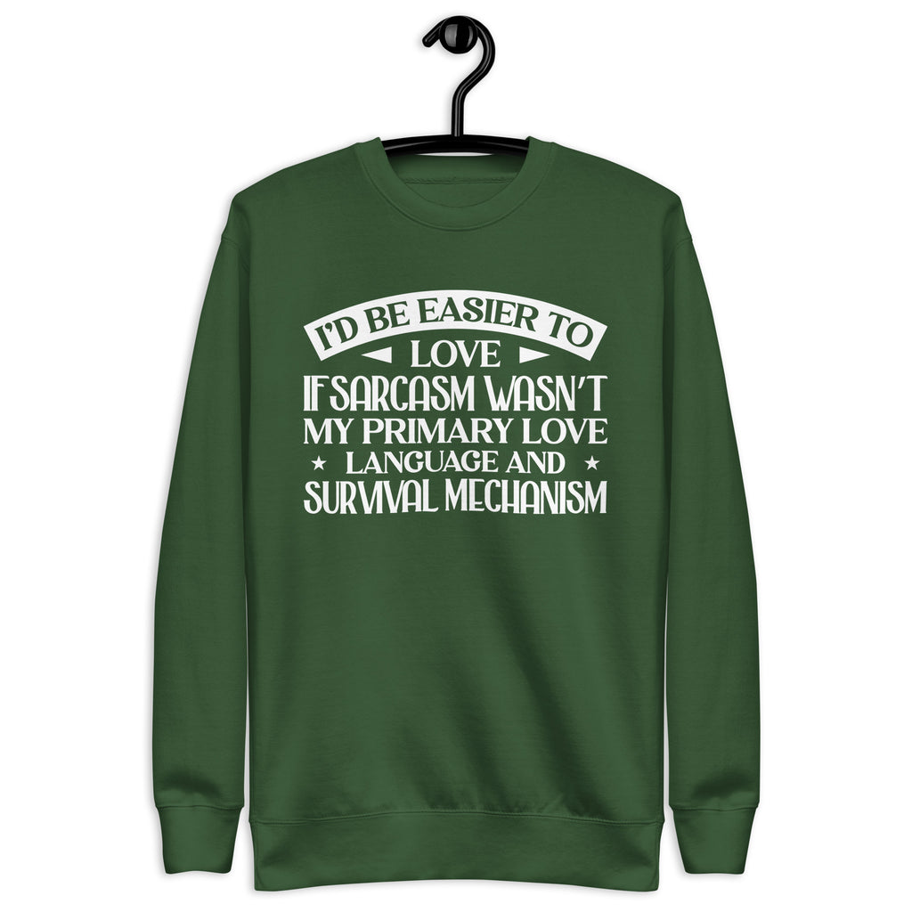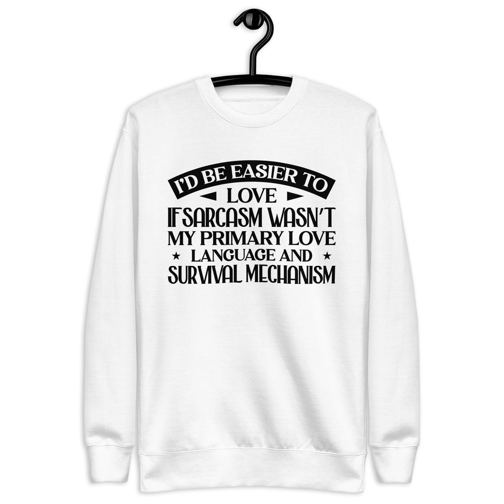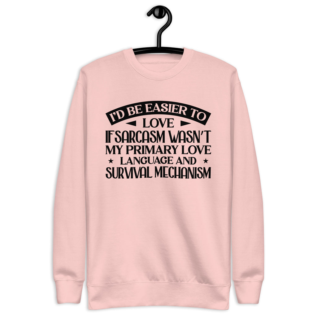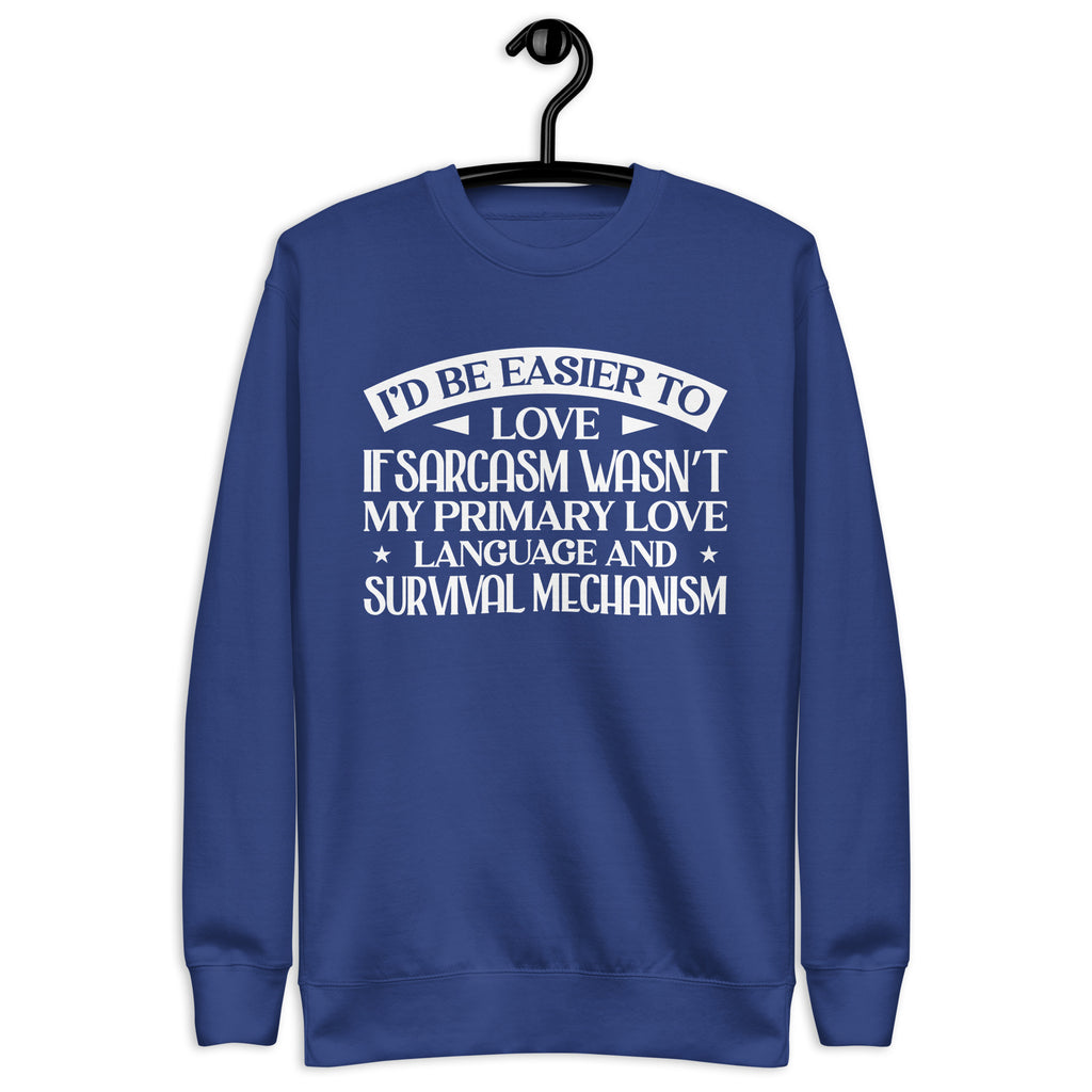 Playful, self-aware, and delightfully sharp — this “I’d Be Easier to Love If Sarcasm Wasn’t My Primary Love Language and Survival Mechanism” sweatshirt is made for anyone who communicates in wit, humor, and a little emotionally-charged honesty. You’re not difficult — you just express affection with a twist, a smirk, and a perfectly timed comeback.