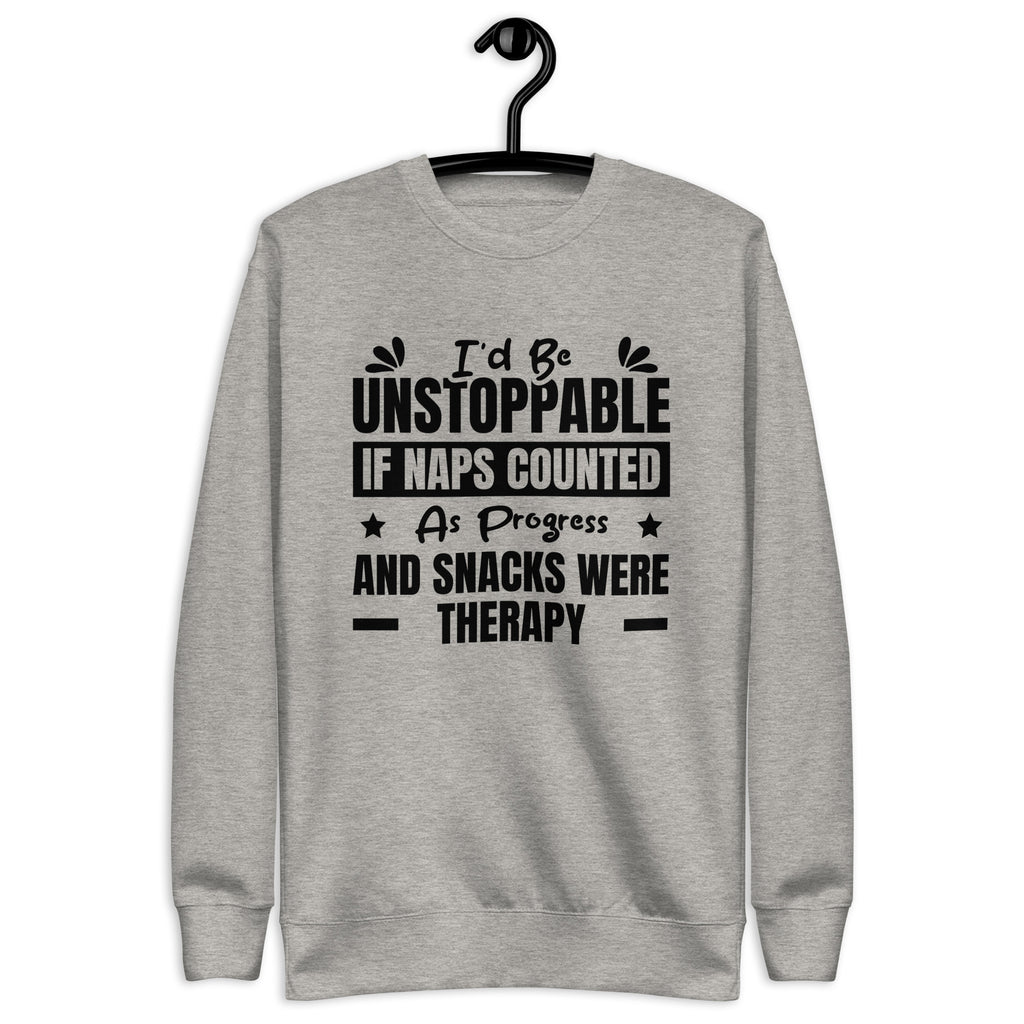 If naps counted as progress and snacks were considered therapy, you’d basically be running the world by now. This “I’d Be Unstoppable If Naps Counted as Progress and Snacks Were Therapy” sweatshirt sums up the dream lifestyle—soft schedules, good snacks, and zero guilt.